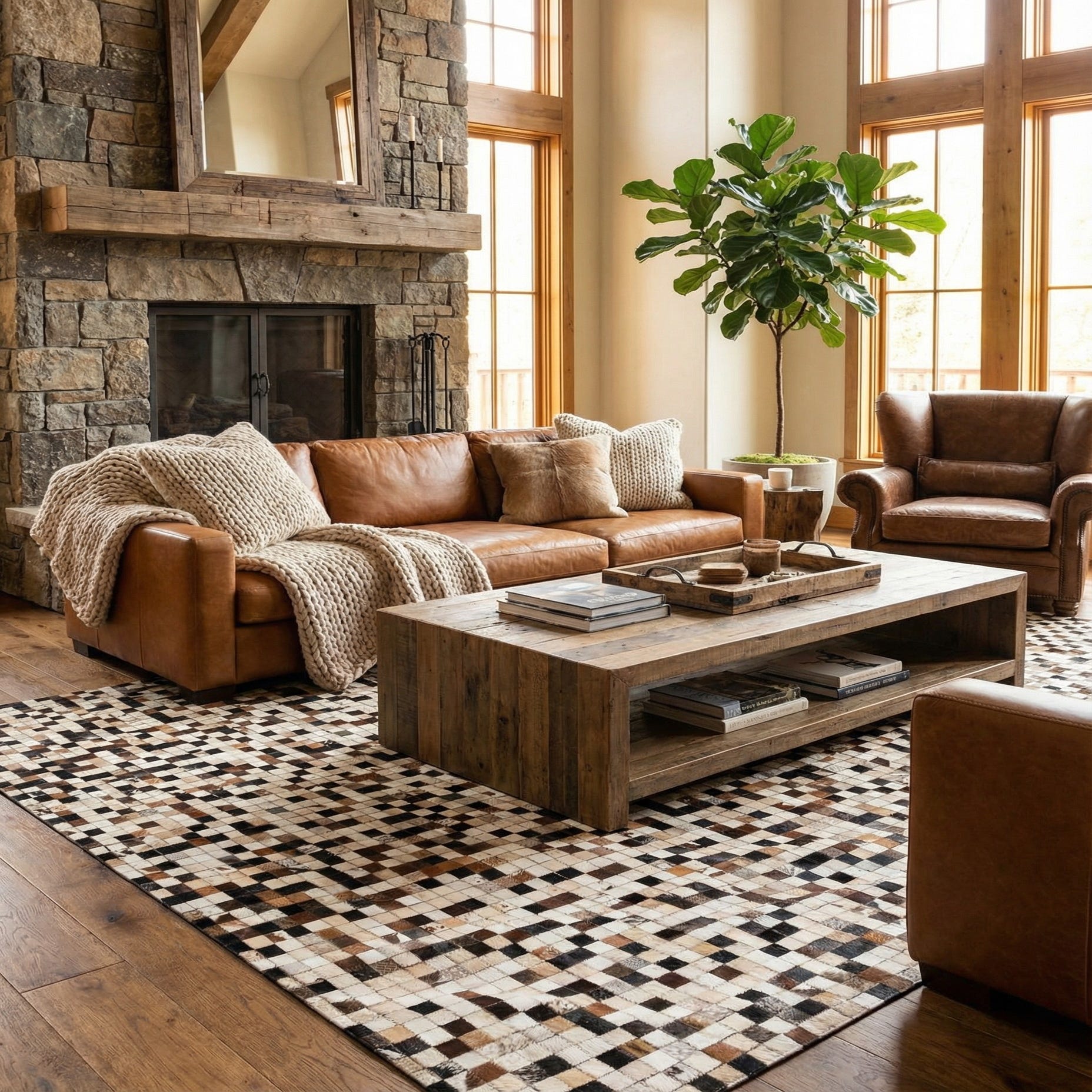 Hand made of cowhide and leather, this rug is a finely stitched mosaic of small squares that form a lively check pattern across a multi-tonal background. Patches of cream, ivory, beige, light brown, brown and black sit next to one another, each tile showing slight variations in tone and hair direction that create subtle movement. The finished surface feels smooth with a soft nap where the hide remains, and leather seams add a low-profile, structured edge that keeps the overall texture refined and tactile.