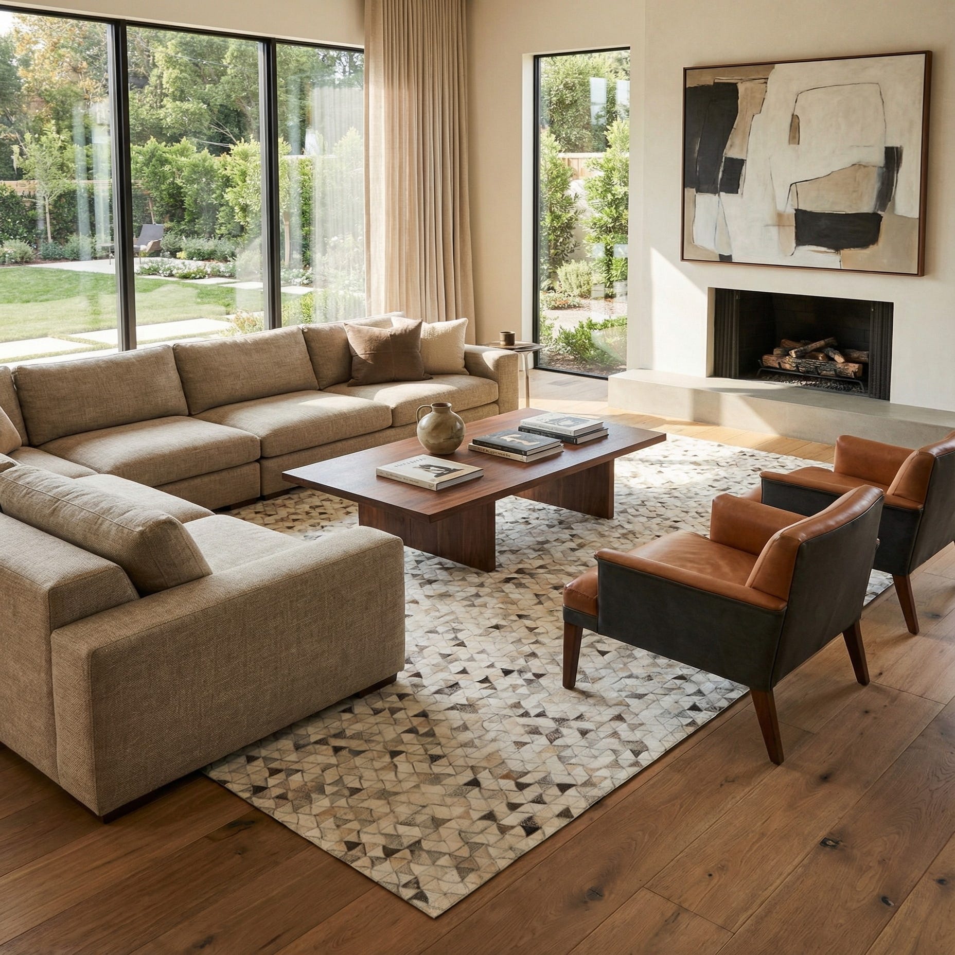 A rectangular 8x10 Cowhide Leather rug featuring a modern abstract pattern of small, multi-colored triangular patches in shades of white, grey, and brown.