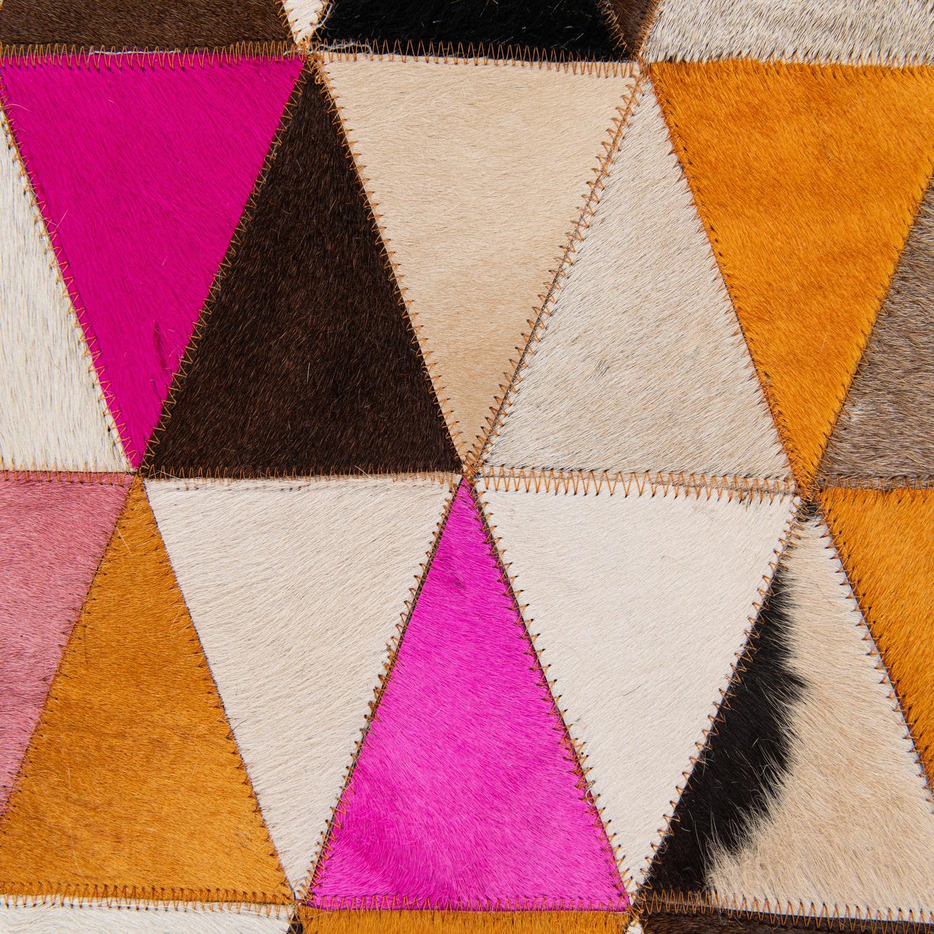 A vibrant 8x10 rectangular rug featuring a modern geometric pattern of multi-colored cowhide triangles in shades of orange, pink, black, white, and red.