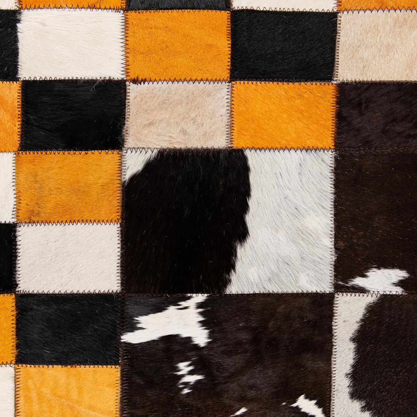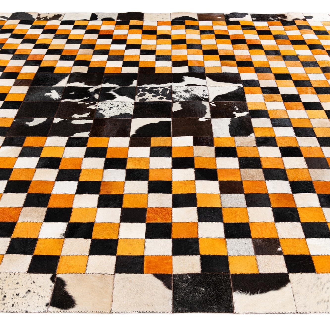 A rectangular 8x10 modern cowhide rug featuring a vibrant checkerboard pattern in orange, black, and white.