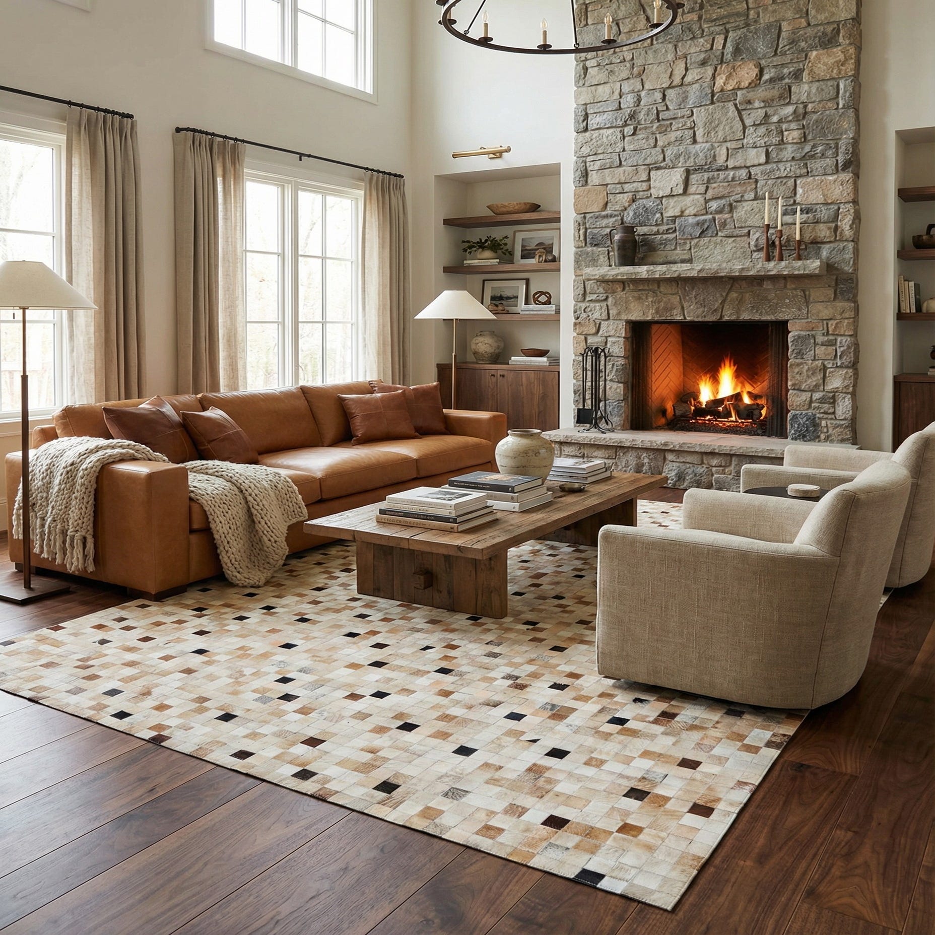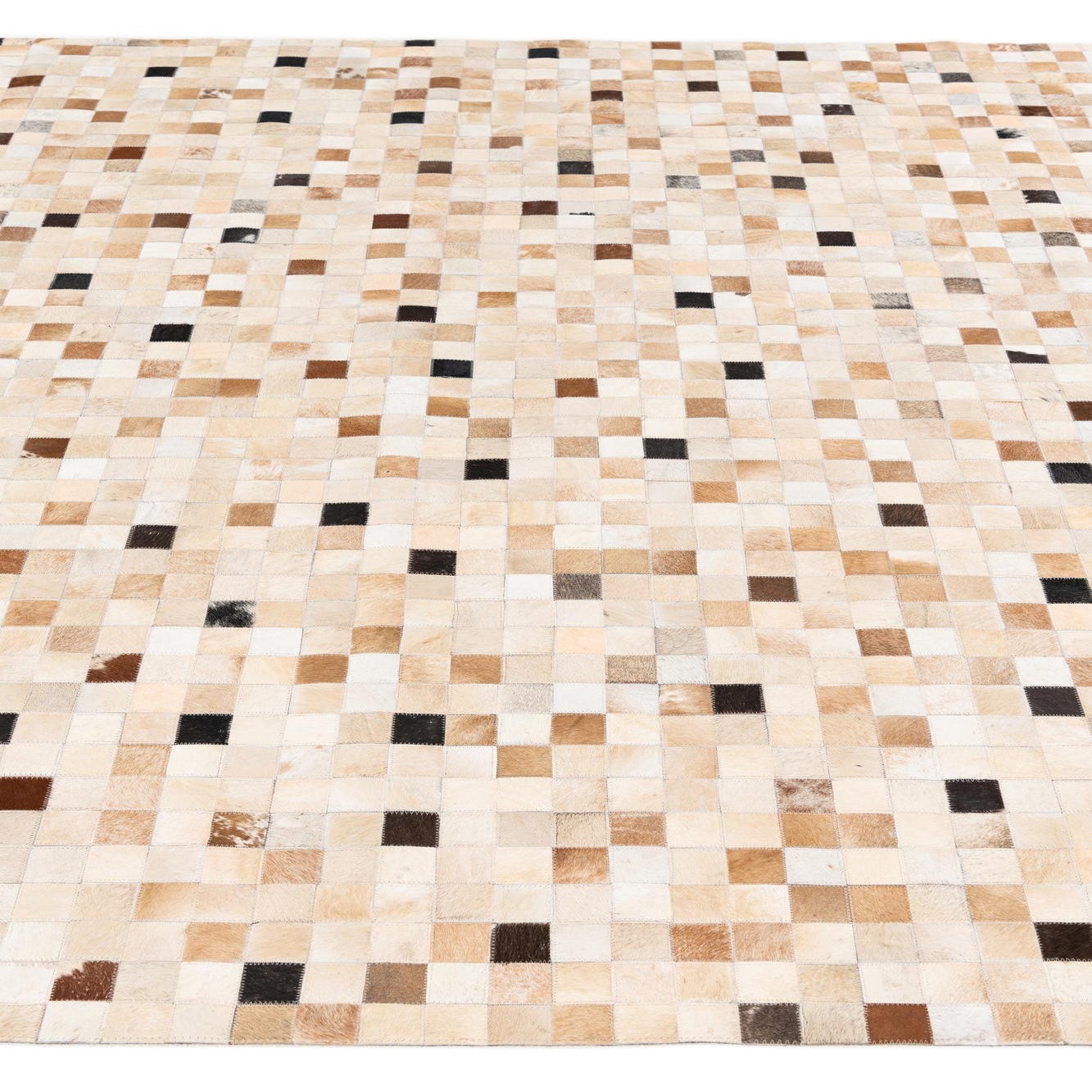 A rectangular 8x10 modern cowhide rug with a mosaic pattern of multi-colored squares in various shades of brown, beige, and black.
