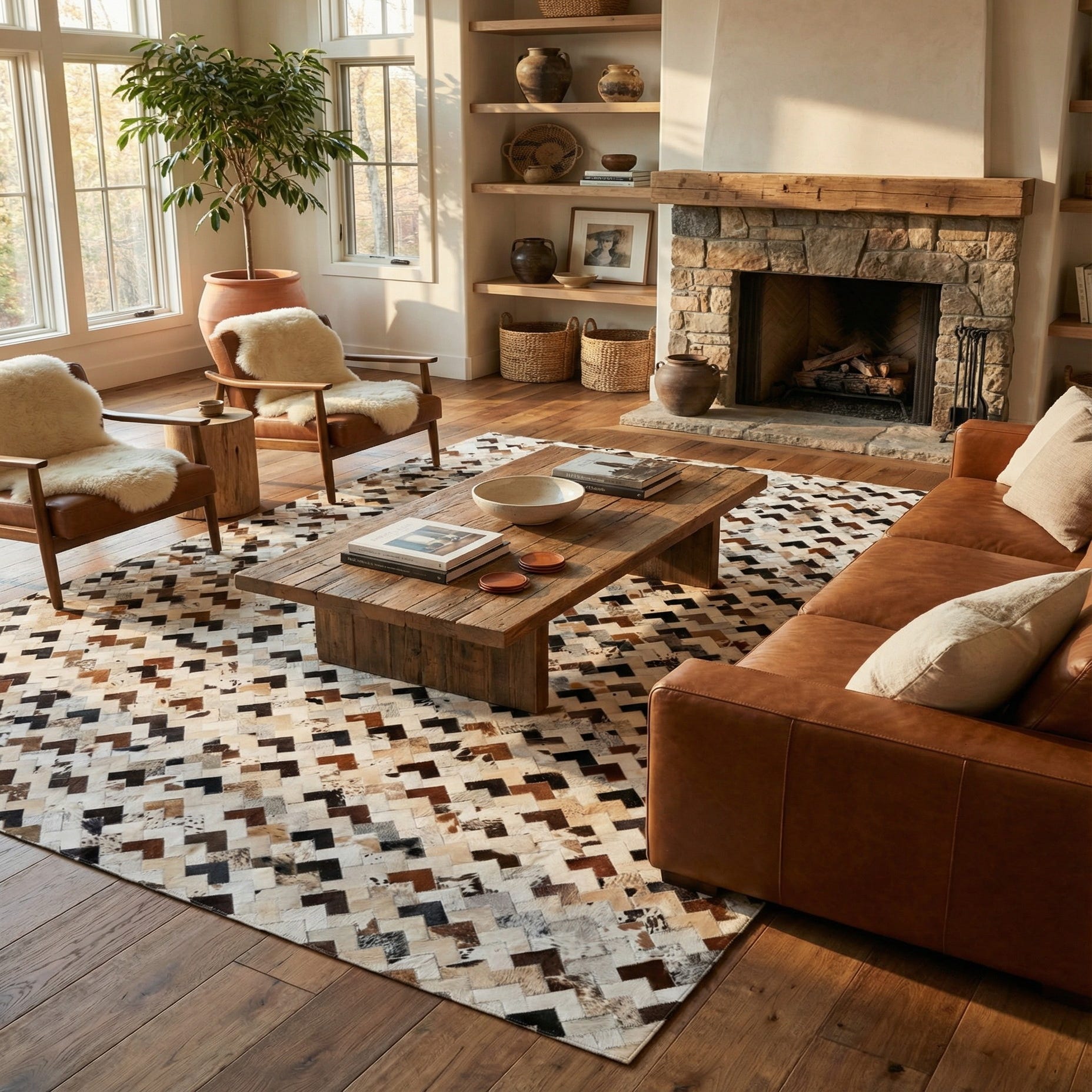 Hand made of cowhide and leather, this rug is assembled from small chevron-shaped patches stitched into a tight, repeating zigzag mosaic. The multi-hued field blends ivory, beige, tan, light brown and richer brown tones with bold black accents, creating natural variation and visual depth across the surface. Running your hand over it you feel the soft hair-on-hide nap and the subtle relief of the seams, while the natural leather brings a gentle sheen and tactile interest.