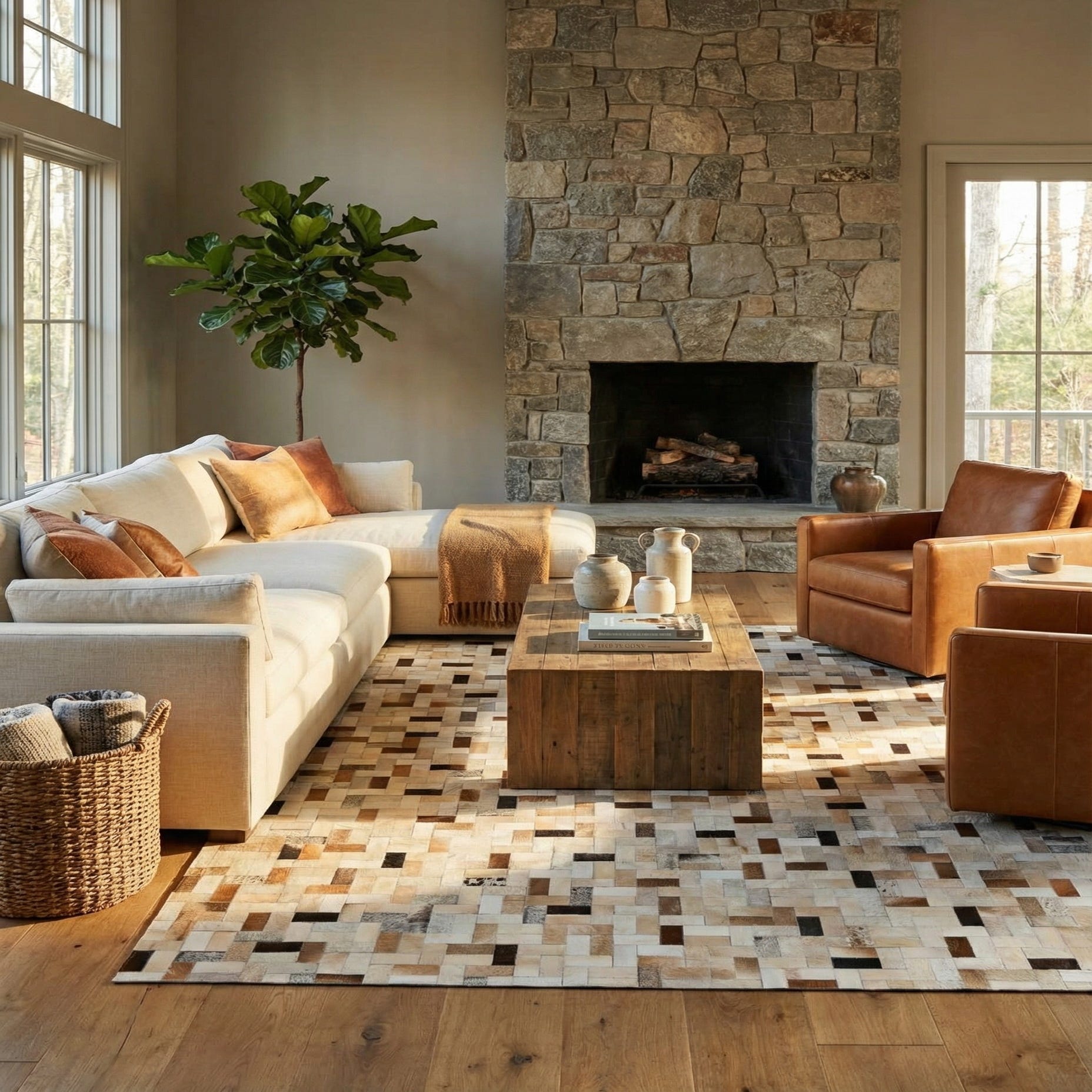 A rectangular 8x10 multi-colored cowhide rug featuring a modern patchwork of natural brown, black, and cream leather rectangles.