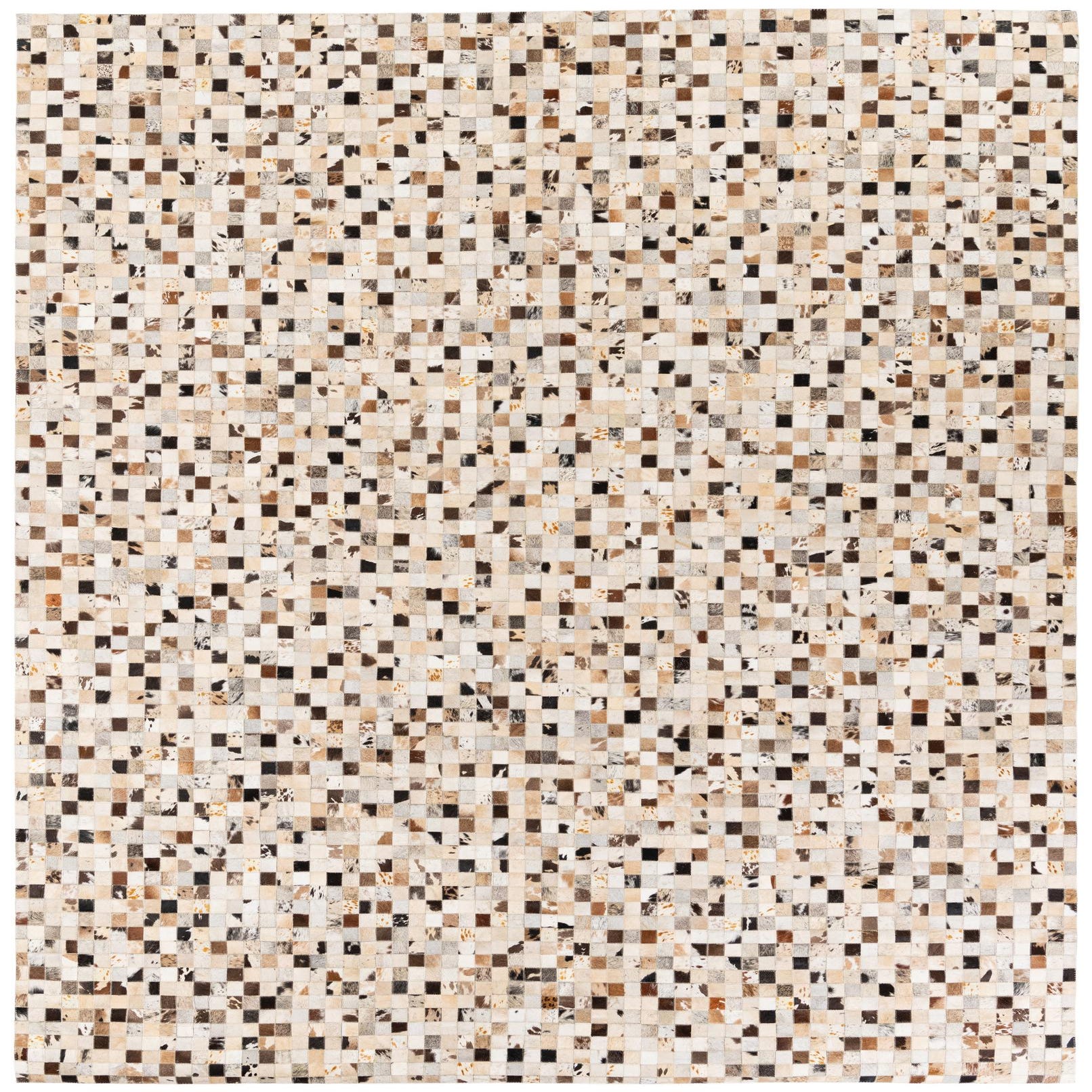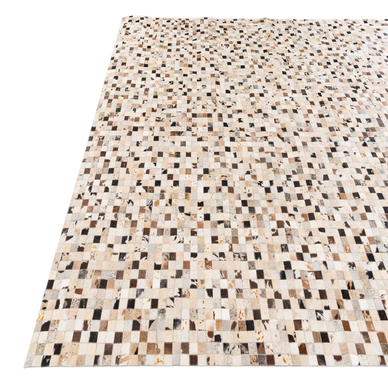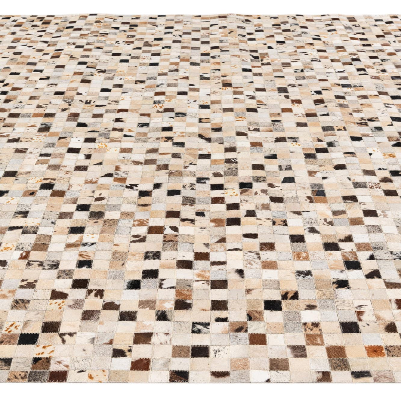 A rectangular 8x10 multi-colored modern cowhide rug with a mosaic pattern of small squares in varying shades of brown, black, and cream.