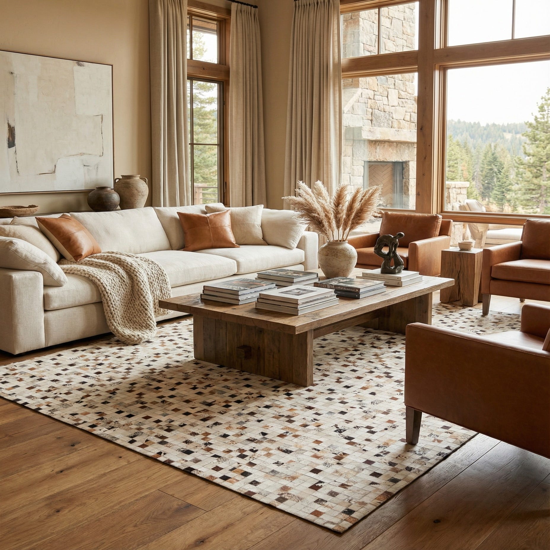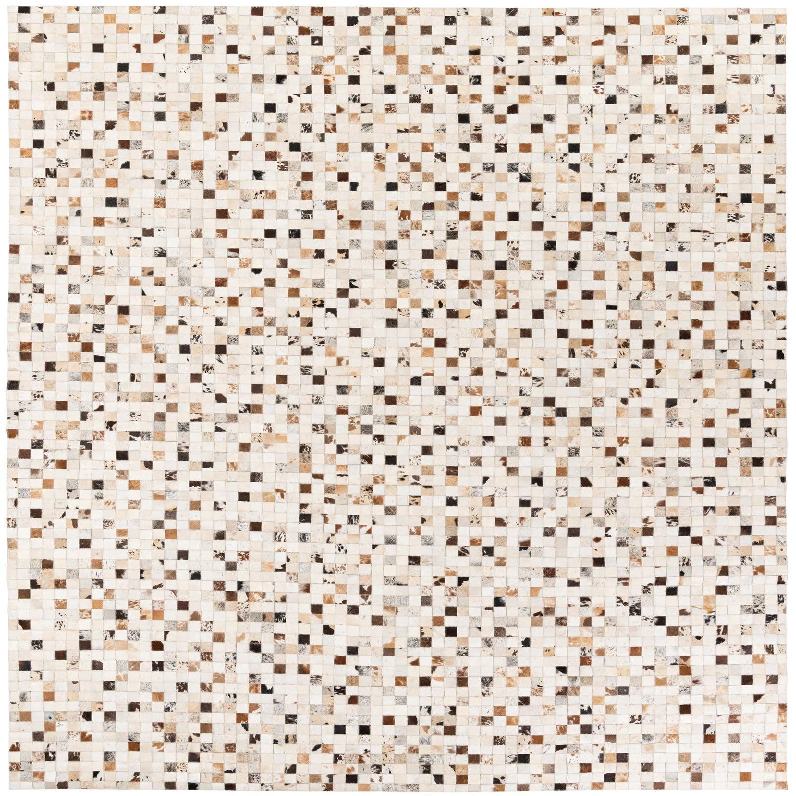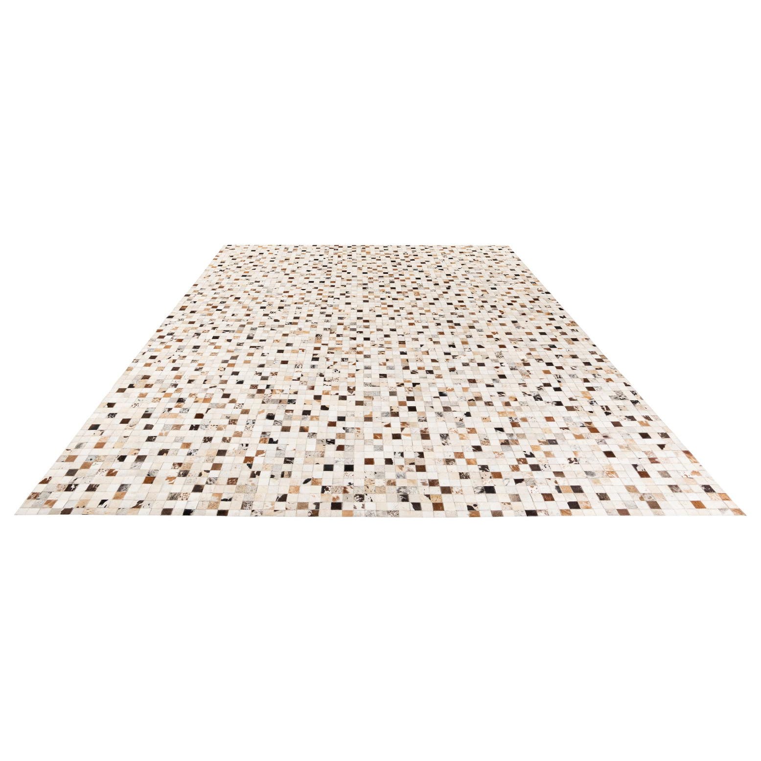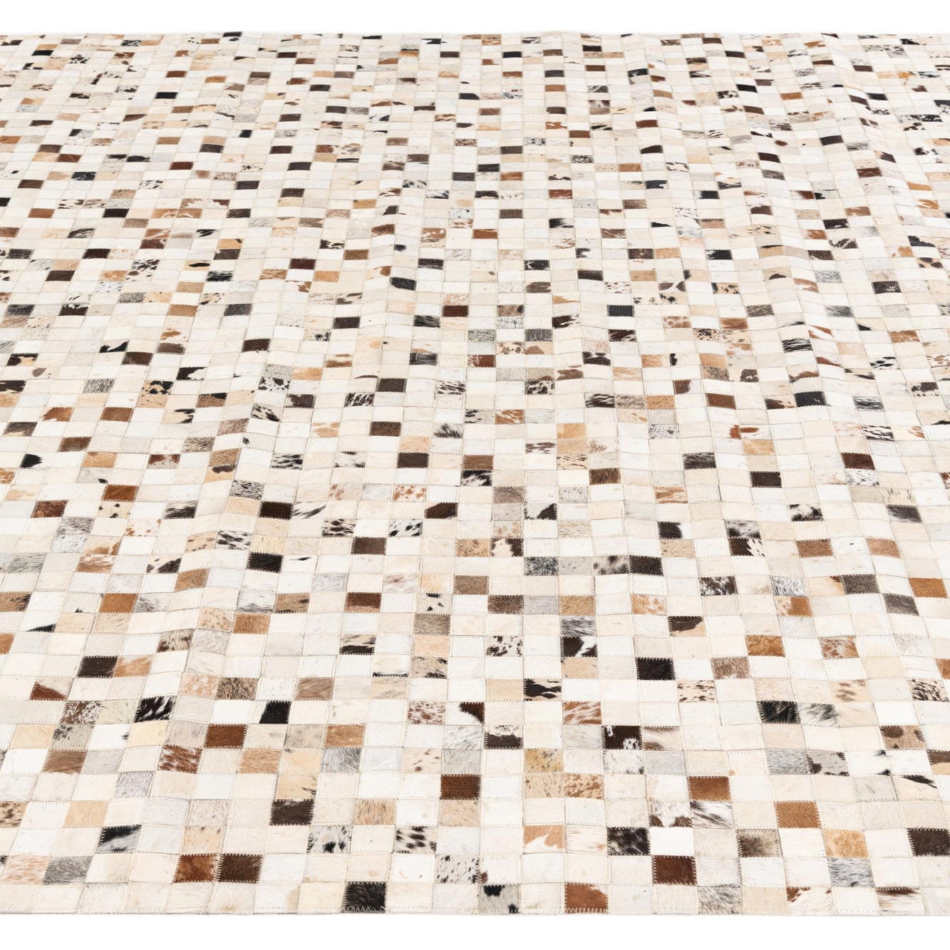 8x10 rectangular rug with a modern mosaic pattern of multi-colored cowhide and leather squares, ideal for a living room.
