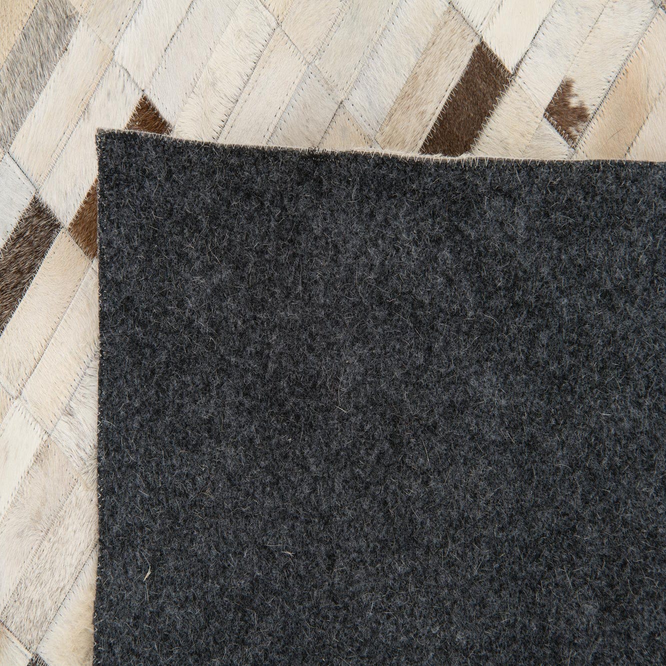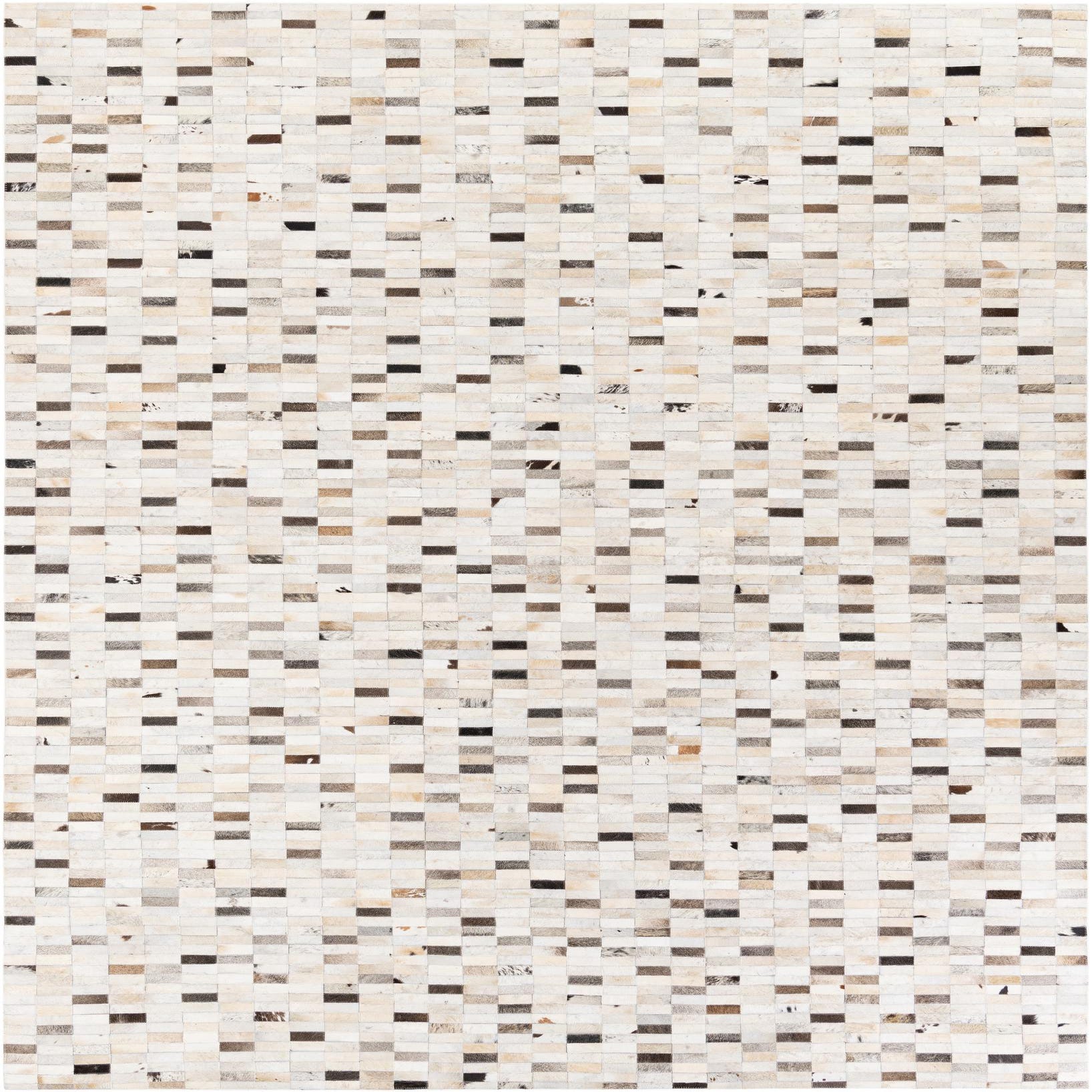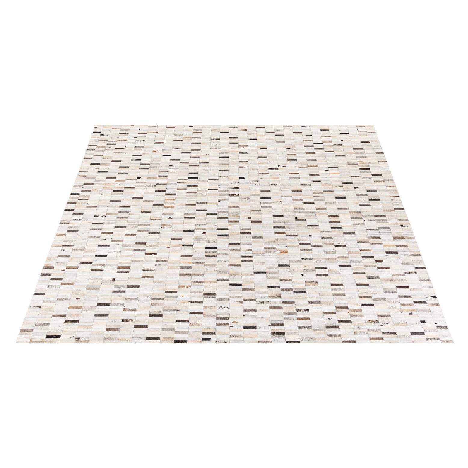 A rectangular 8x10 multi-colored modern cowhide rug with a mosaic pattern of light and dark rectangular patches.