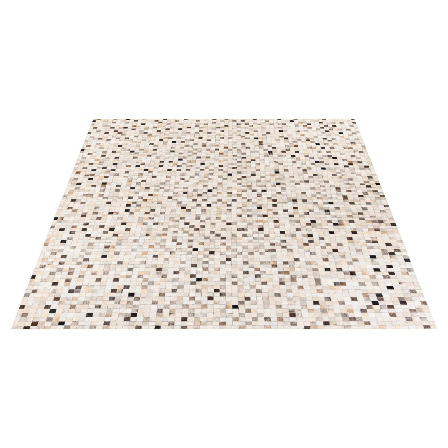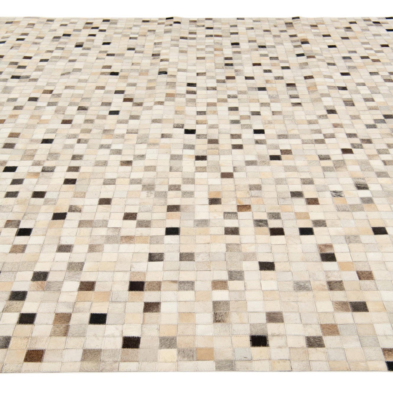 8x10 rectangular Cowhide Stocks rug in multi-colored modern mosaic pattern, ideal for a living room.