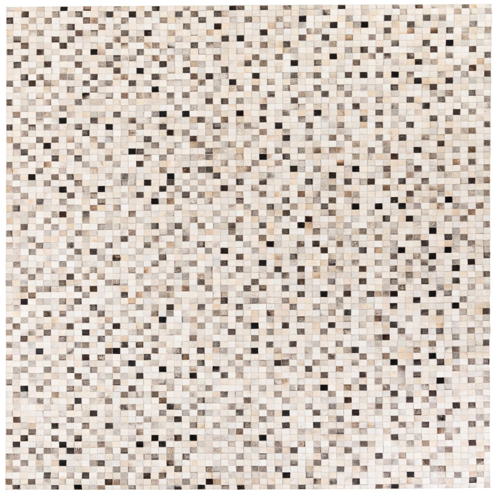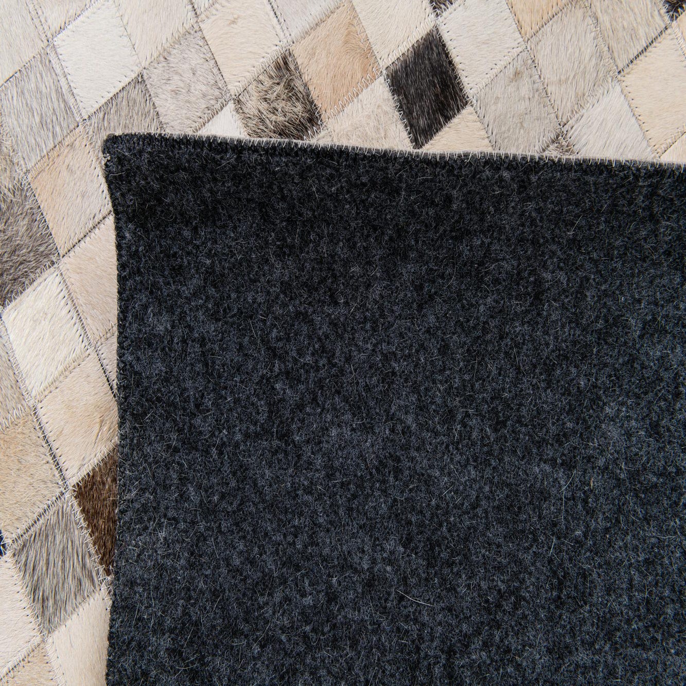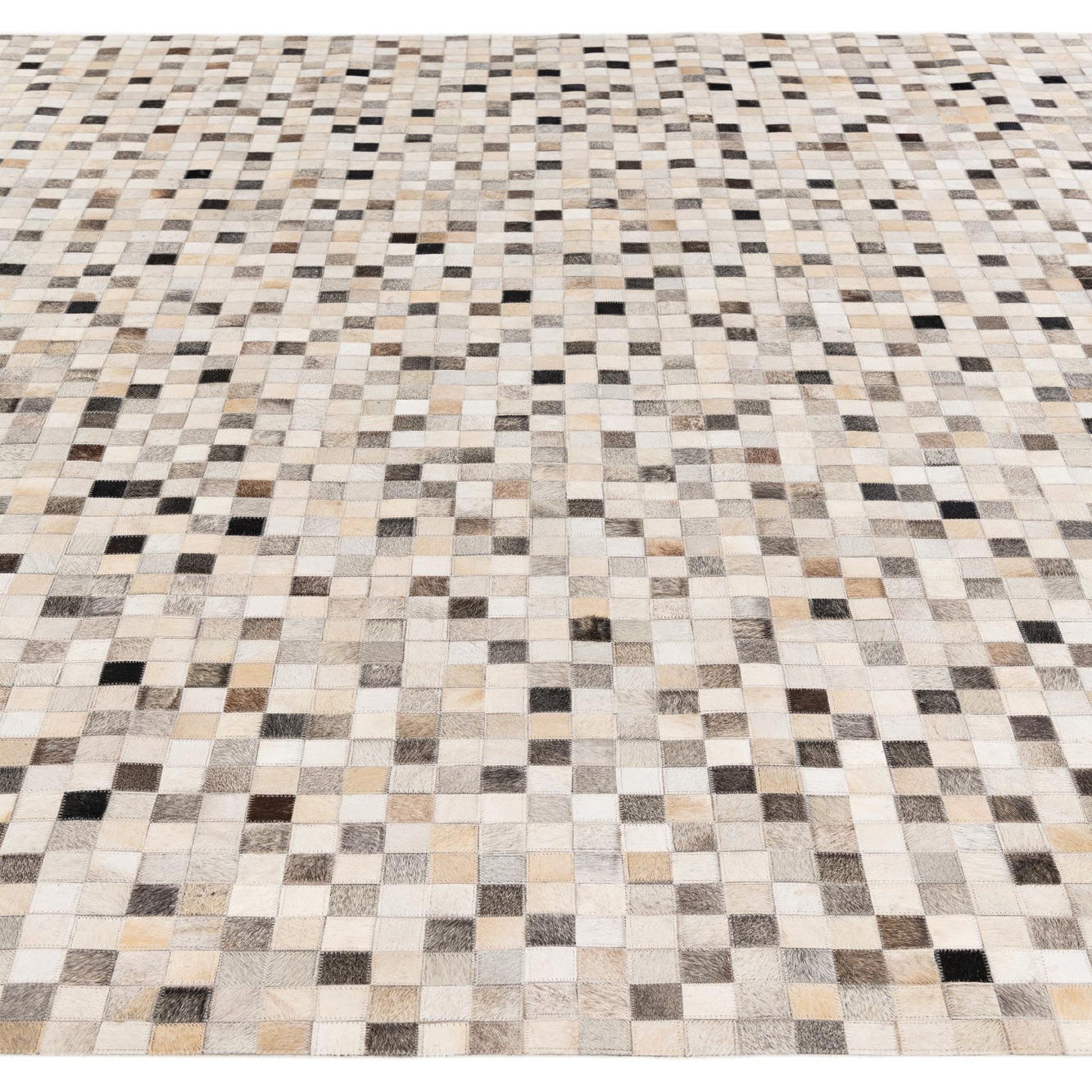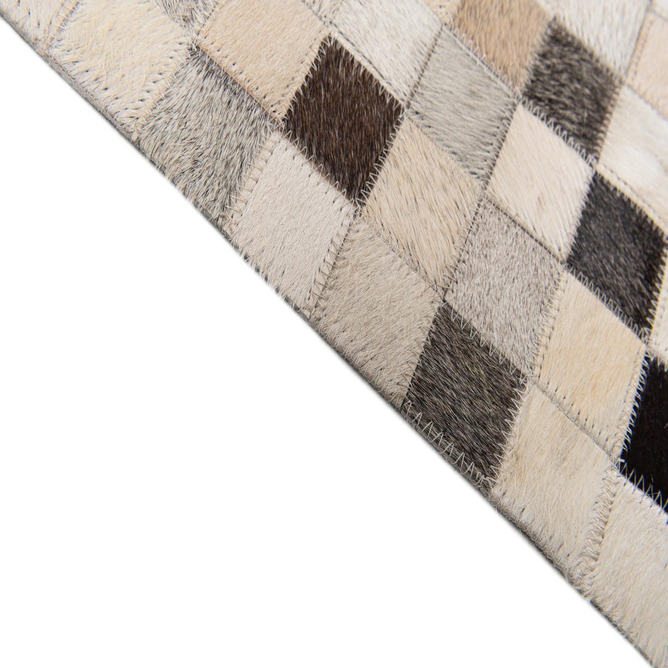 The texture alternates between soft hair-on-hide panels and smoother leather joins, offering a tactile mix that feels warm underfoot and visually layered. Its neutral palette makes it versatile—place it under a coffee table to anchor a modern living area, layer it beneath a dining table for a more casual yet composed look, or use it in a bedroom to add understated pattern and warmth. It also complements Scandinavian, modern farmhouse, or transitional interiors where natural materials and subtle patterning are desired.
