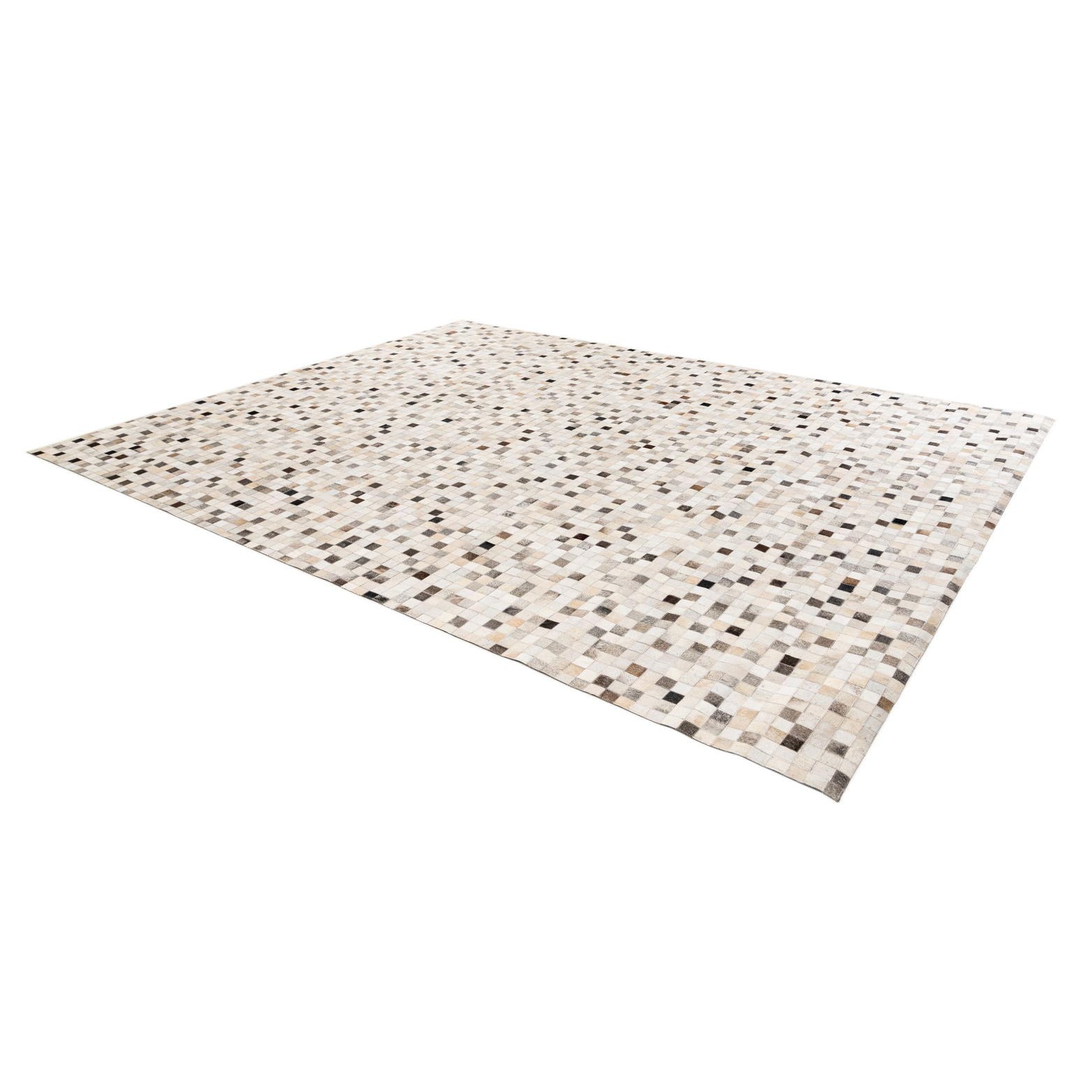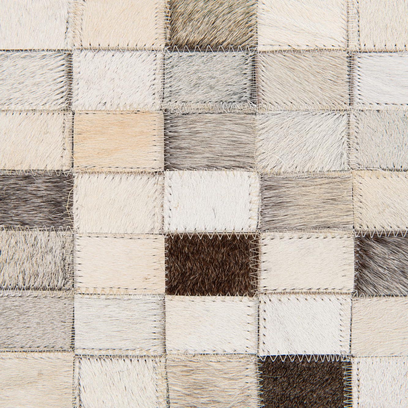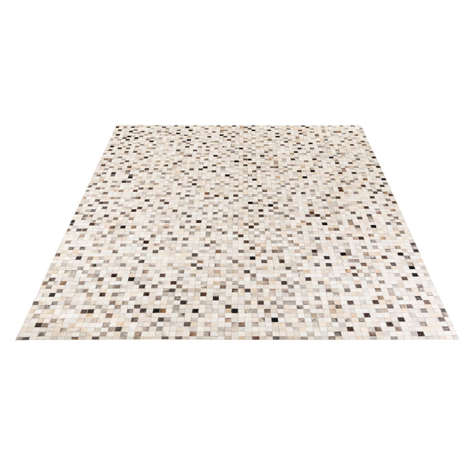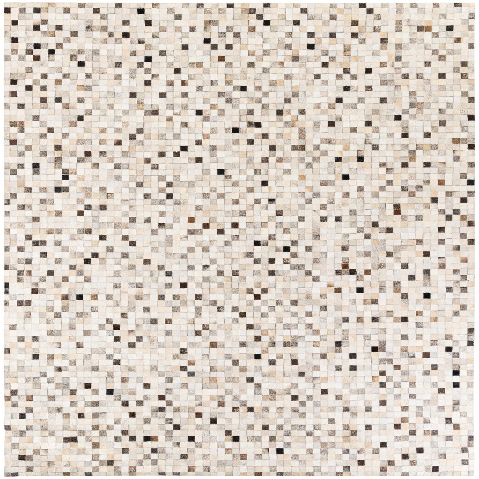 A compact, mosaic-like patchwork of small square hides creates a calm, pixelated pattern in warm neutrals. Individual patches of ivory, beige, light brown, gray, brown and occasional black form a varied, multi-tonal field on a multi background, giving the surface quiet depth and visual texture. Hand made of cowhide and leather, the rug has the smooth, low-profile feel of hair-on-hide with subtle variations at the seams where each square is stitched together, so the surface is tactile without being plush.