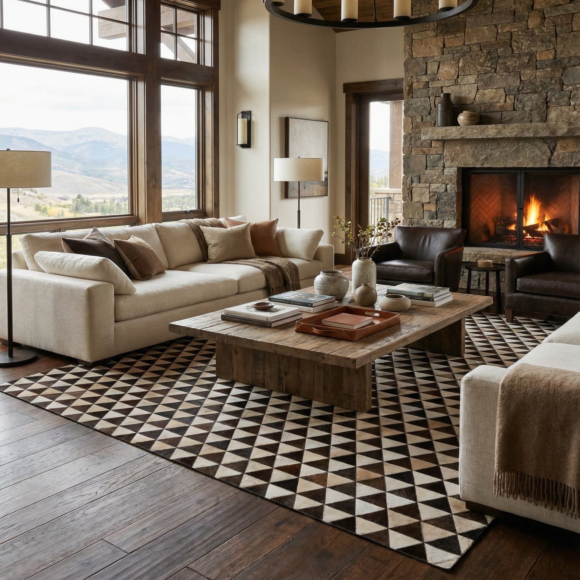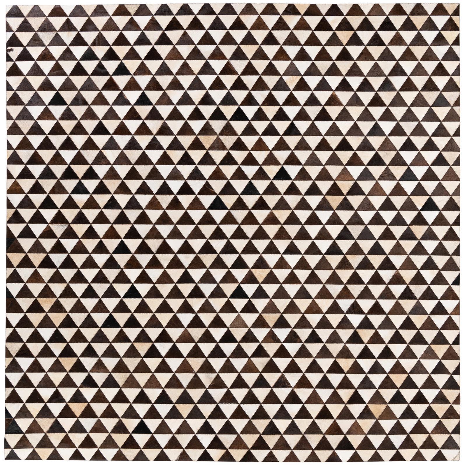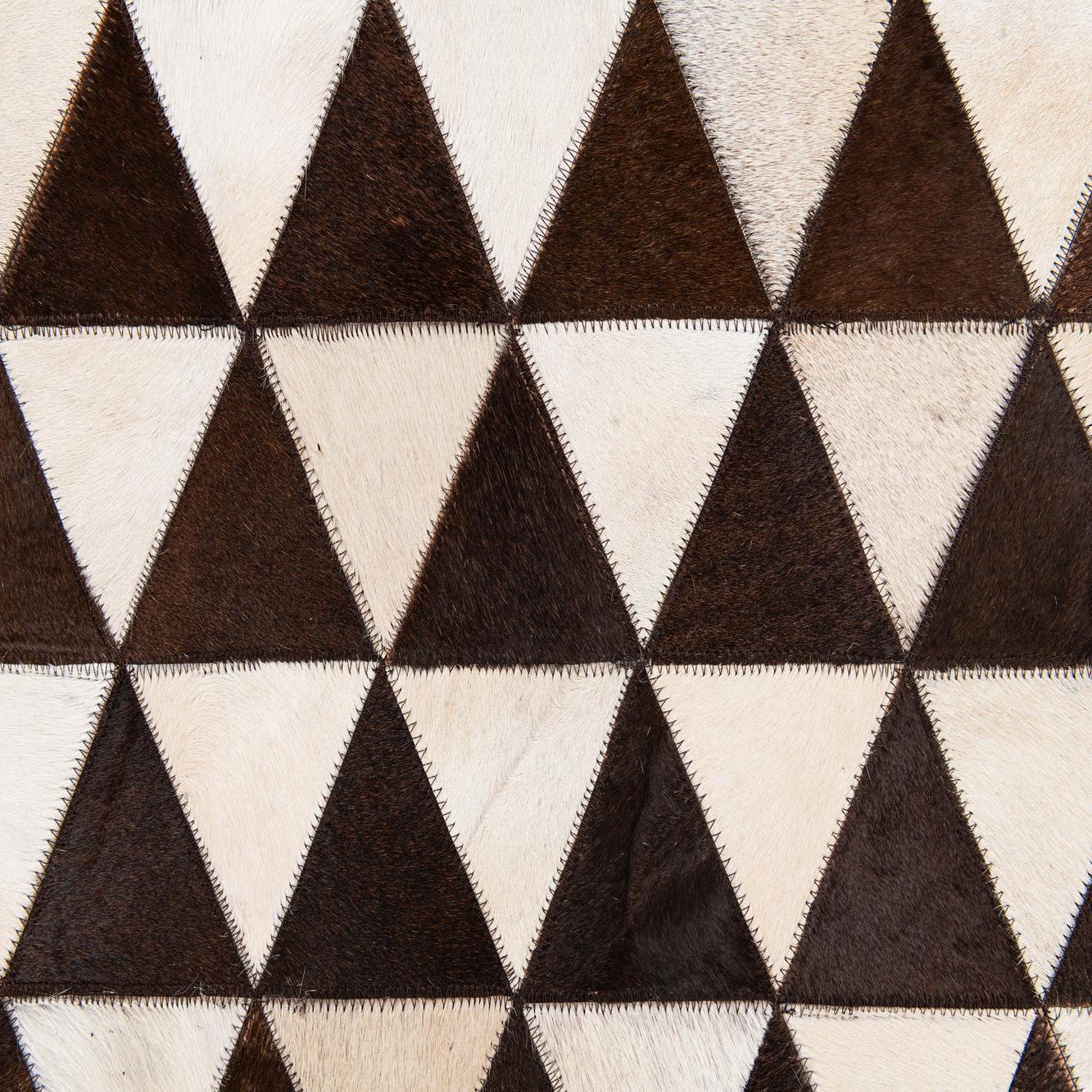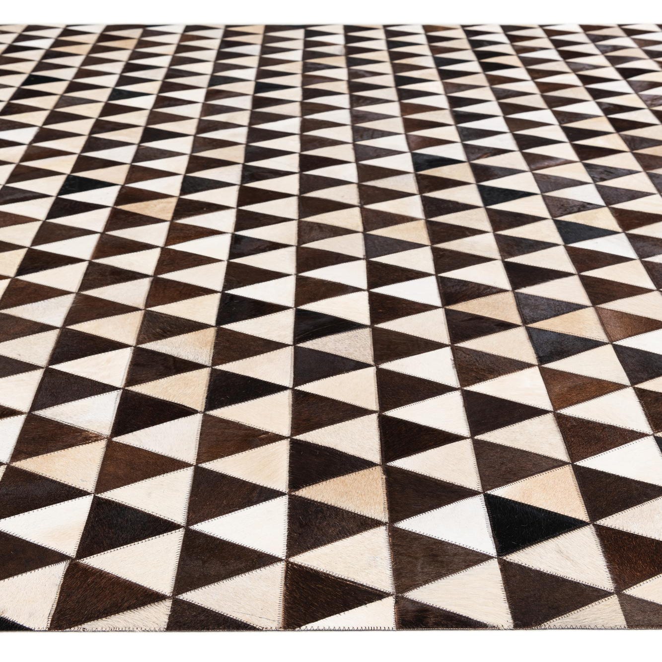 8x10 rectangular Cowhide Stocks rug featuring a modern geometric pattern of alternating dark brown and light cream triangles.