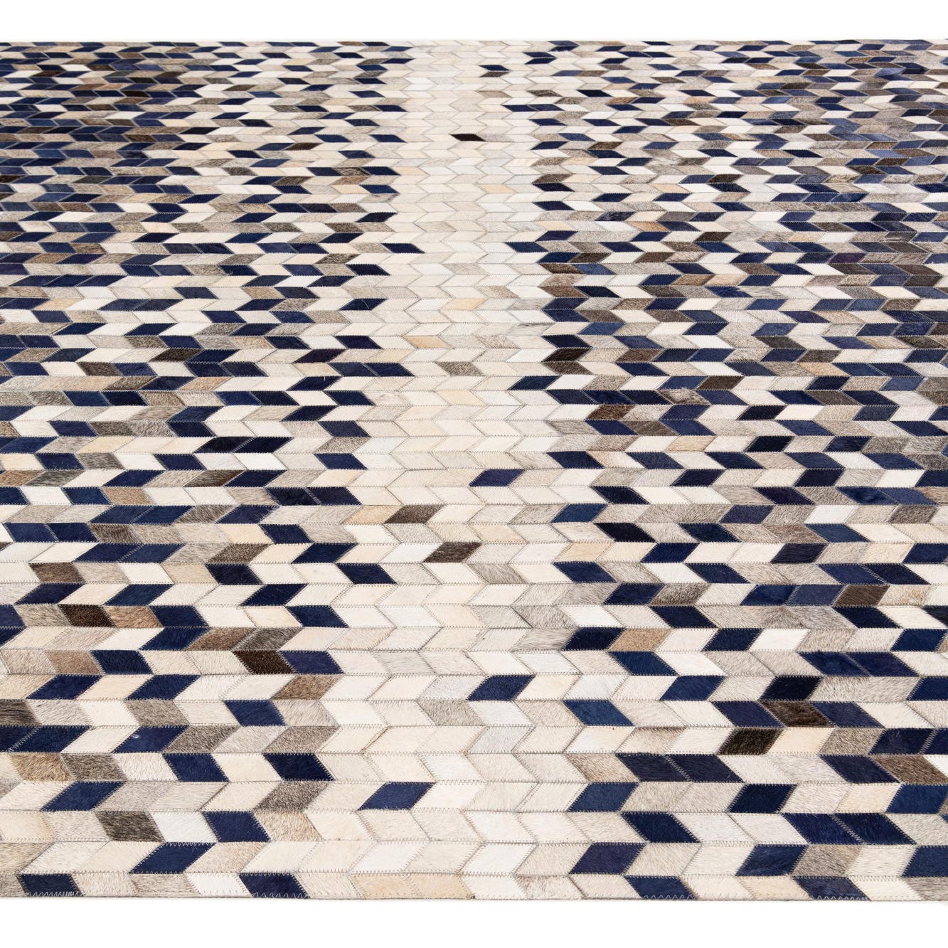 A rectangular 8x10 Cowhide Stocks rug with a modern chevron pattern in shades of blue, brown, and natural white.