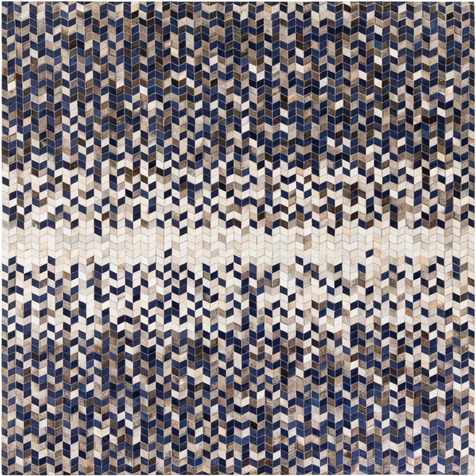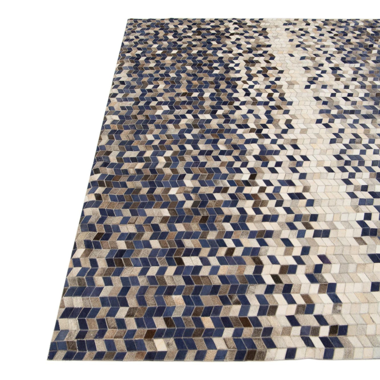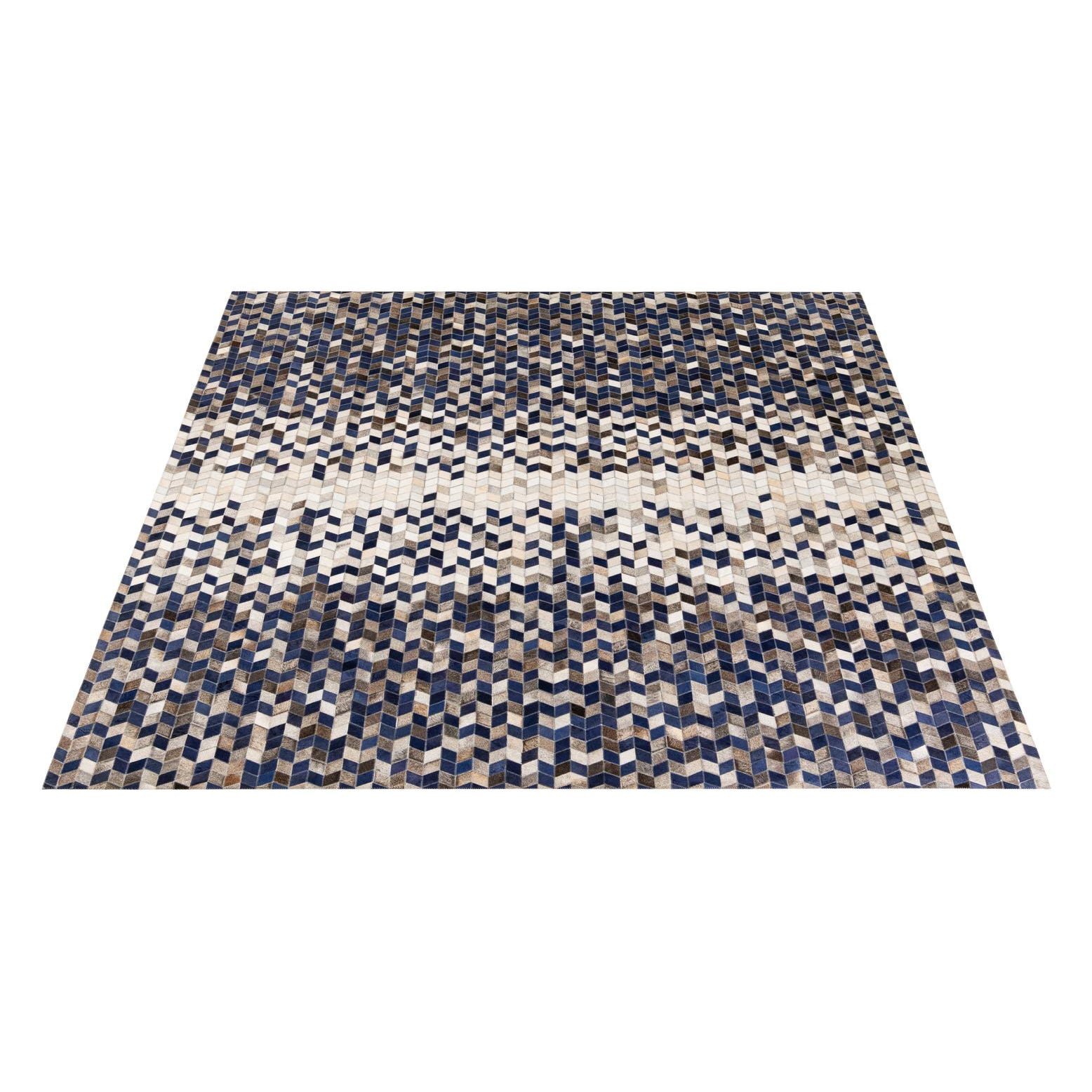 A rectangular 8x10 Cowhide Stocks rug featuring a geometric patchwork pattern in shades of blue, brown, and white.