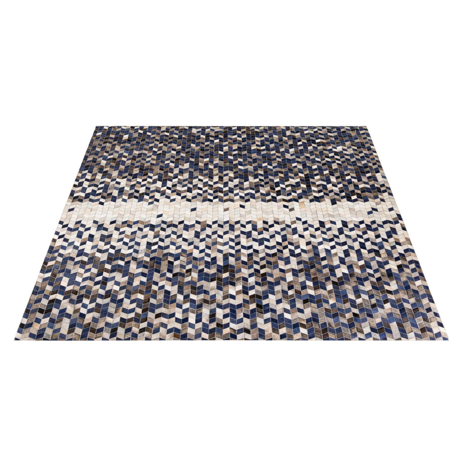 A rectangular 8x10 modern cowhide rug featuring a chevron pattern with shades of blue, brown, black, and white.