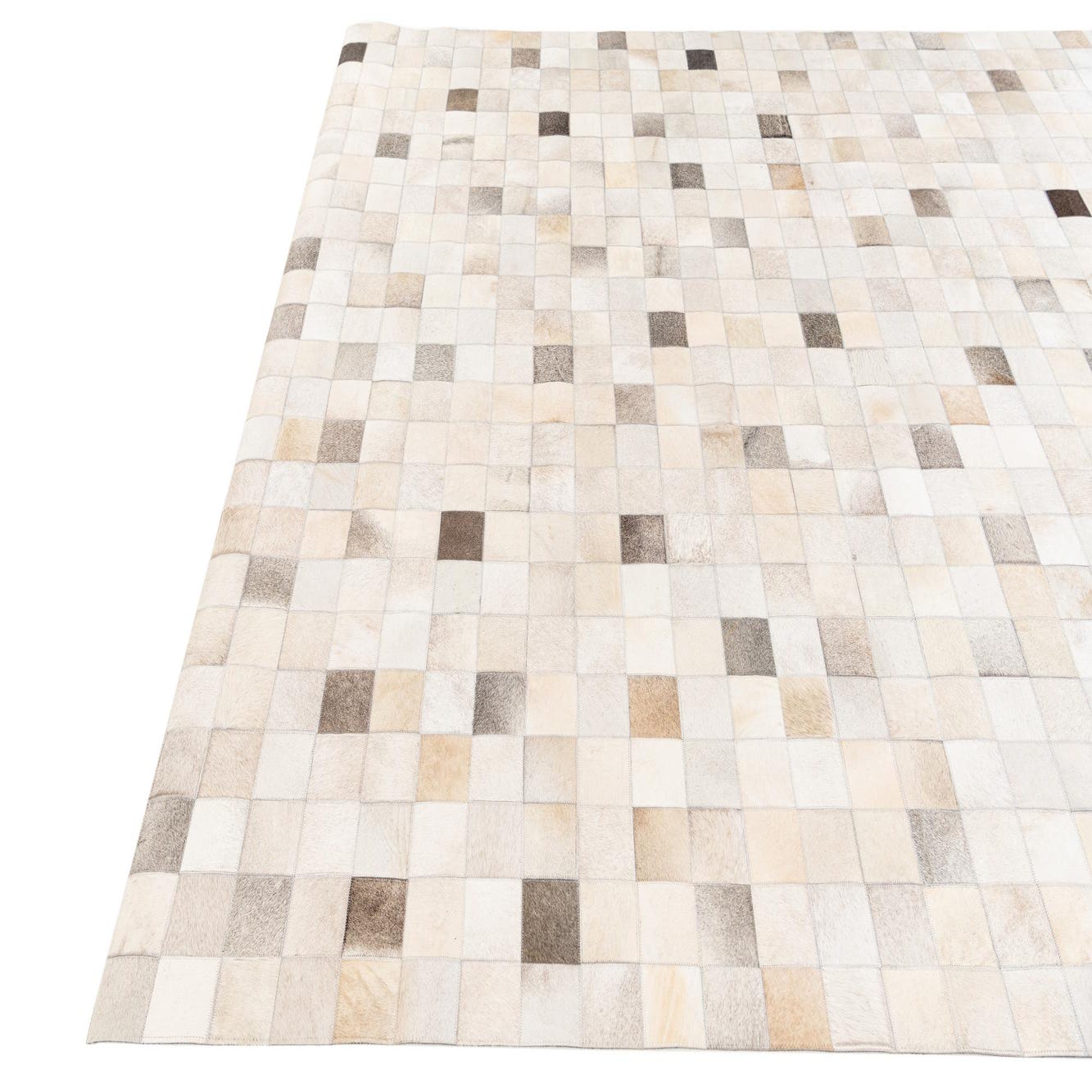 A rectangular 8x10 Cowhide Stocks rug from Rugs.com featuring a modern patchwork of multi-colored cowhide squares in varying shades of light brown, beige, and dark brown.