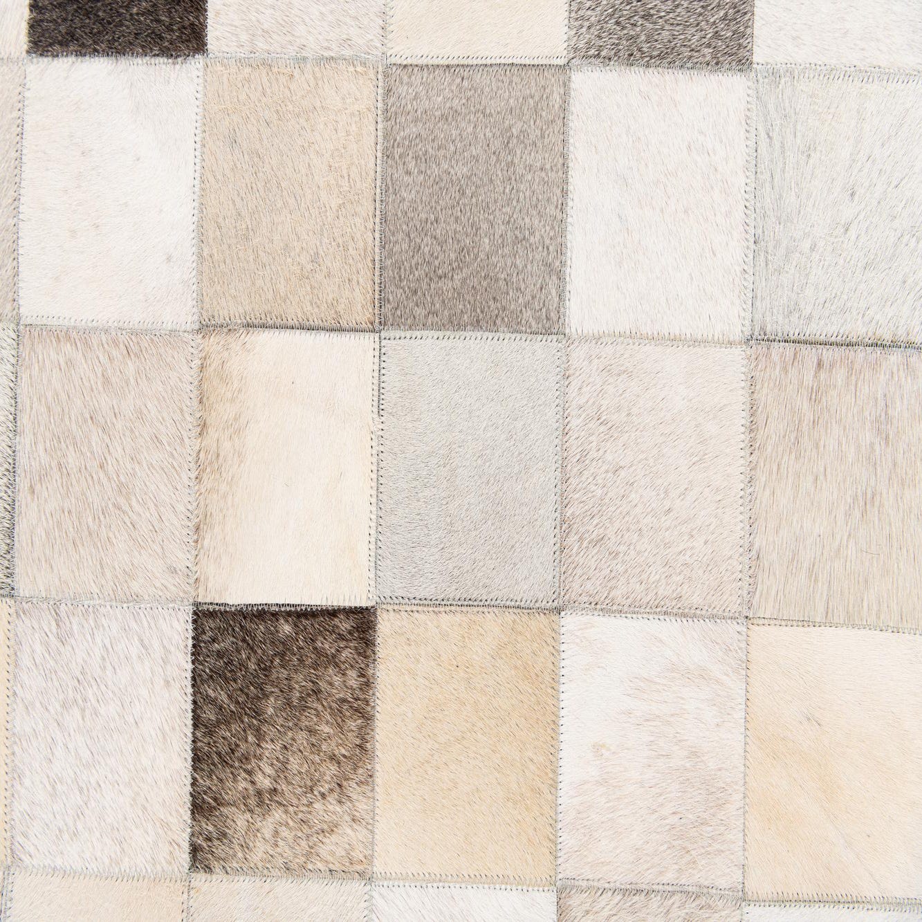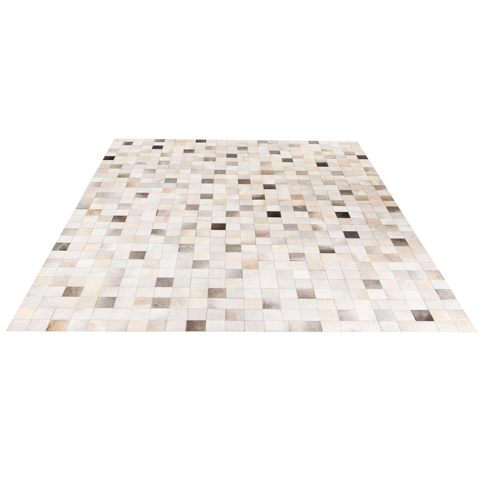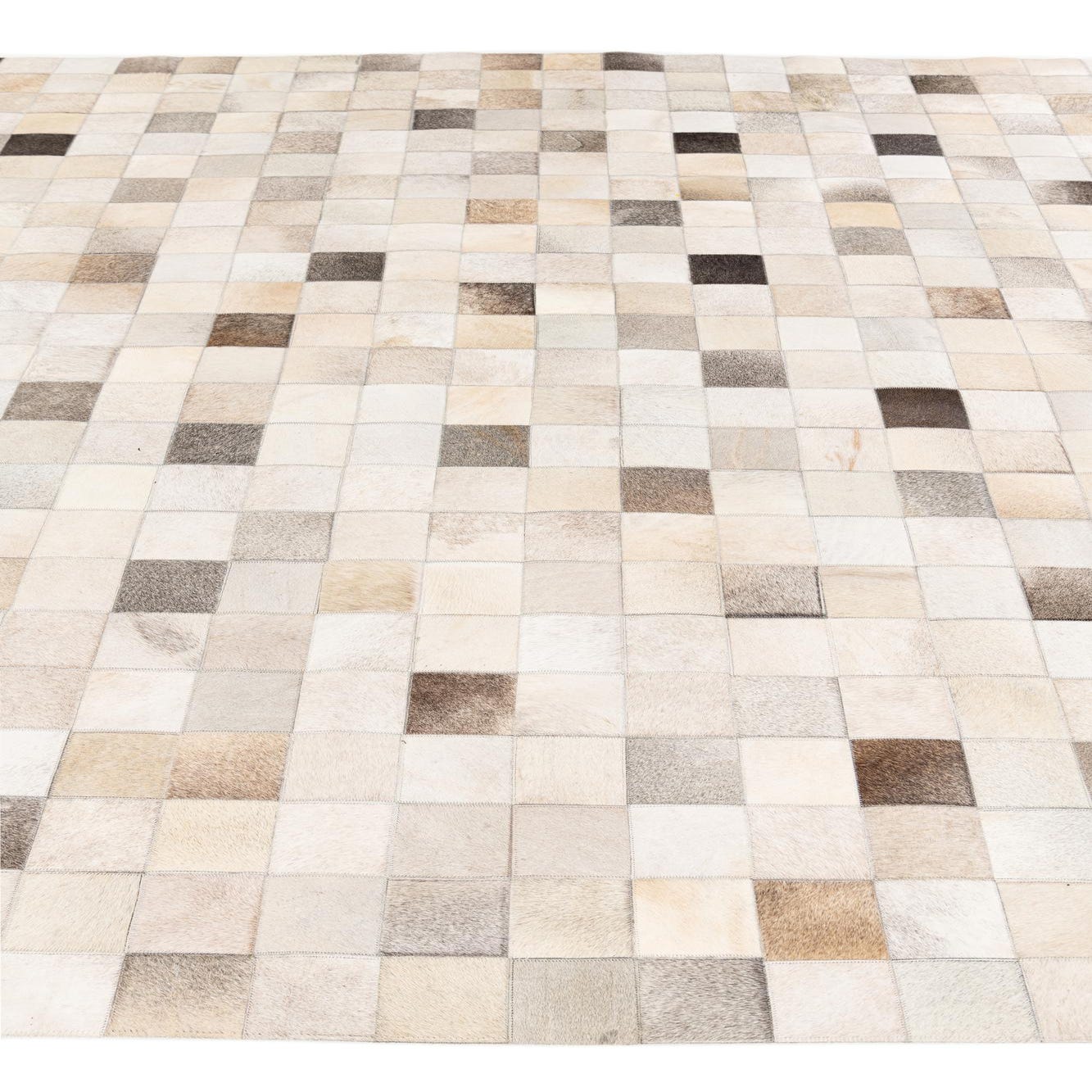 A rectangular 8x10 Cowhide Stocks rug by Rugs.com, featuring a modern patchwork of multi-colored cowhide squares in shades of cream, beige, brown, and gray, suitable for a living room.