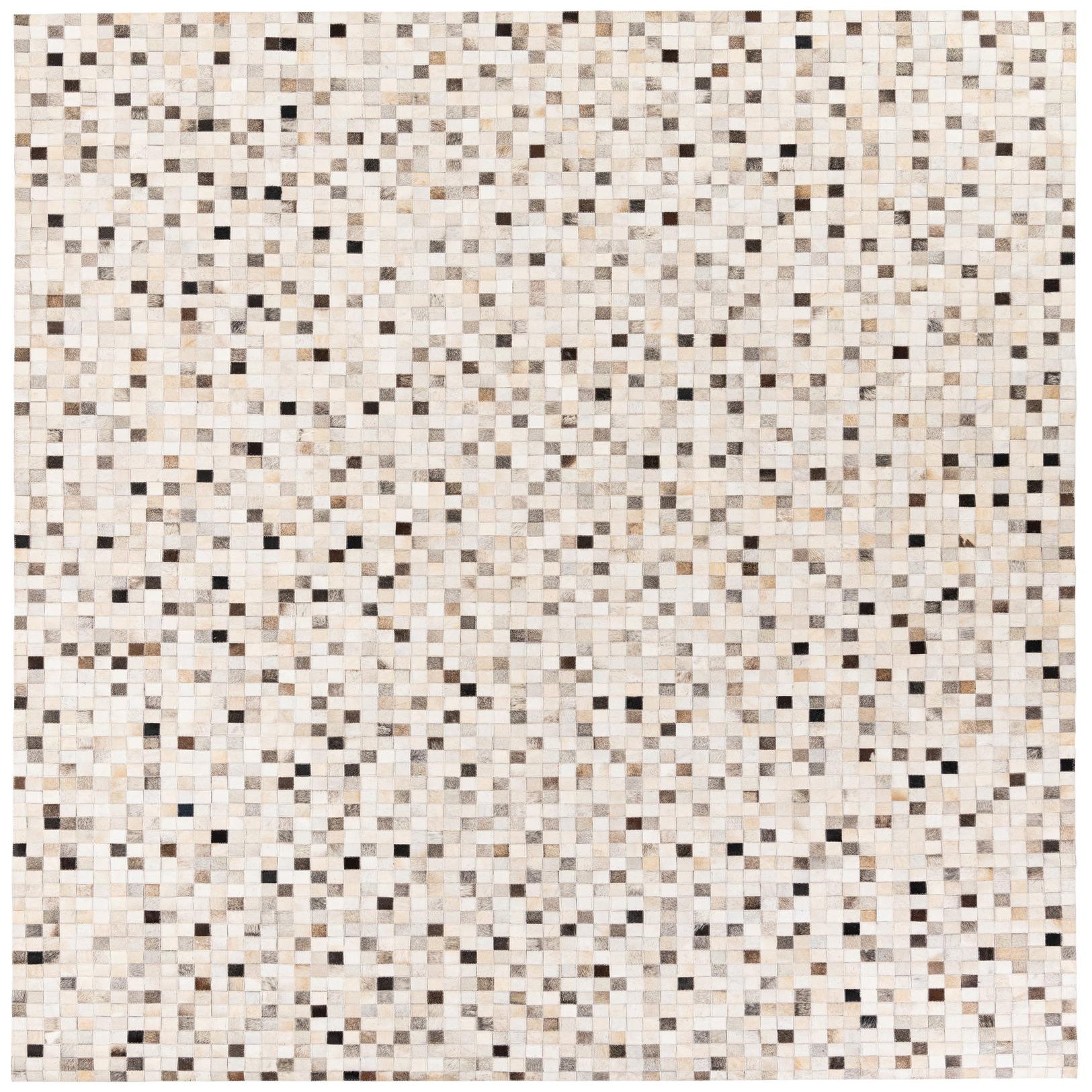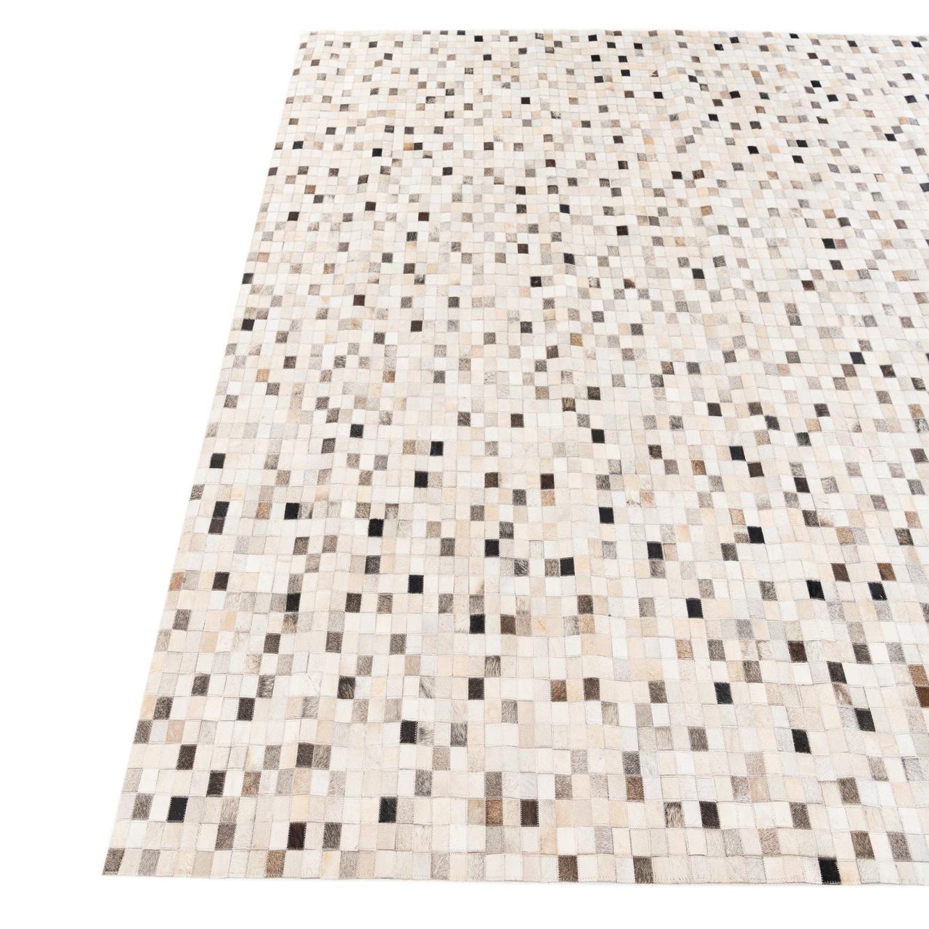 A rectangular 8x10 modern cowhide rug featuring a mosaic pattern of multi-colored squares in varying shades of brown, beige, and black.