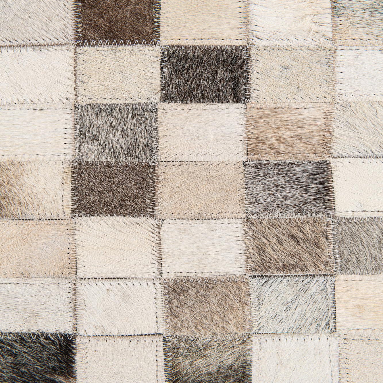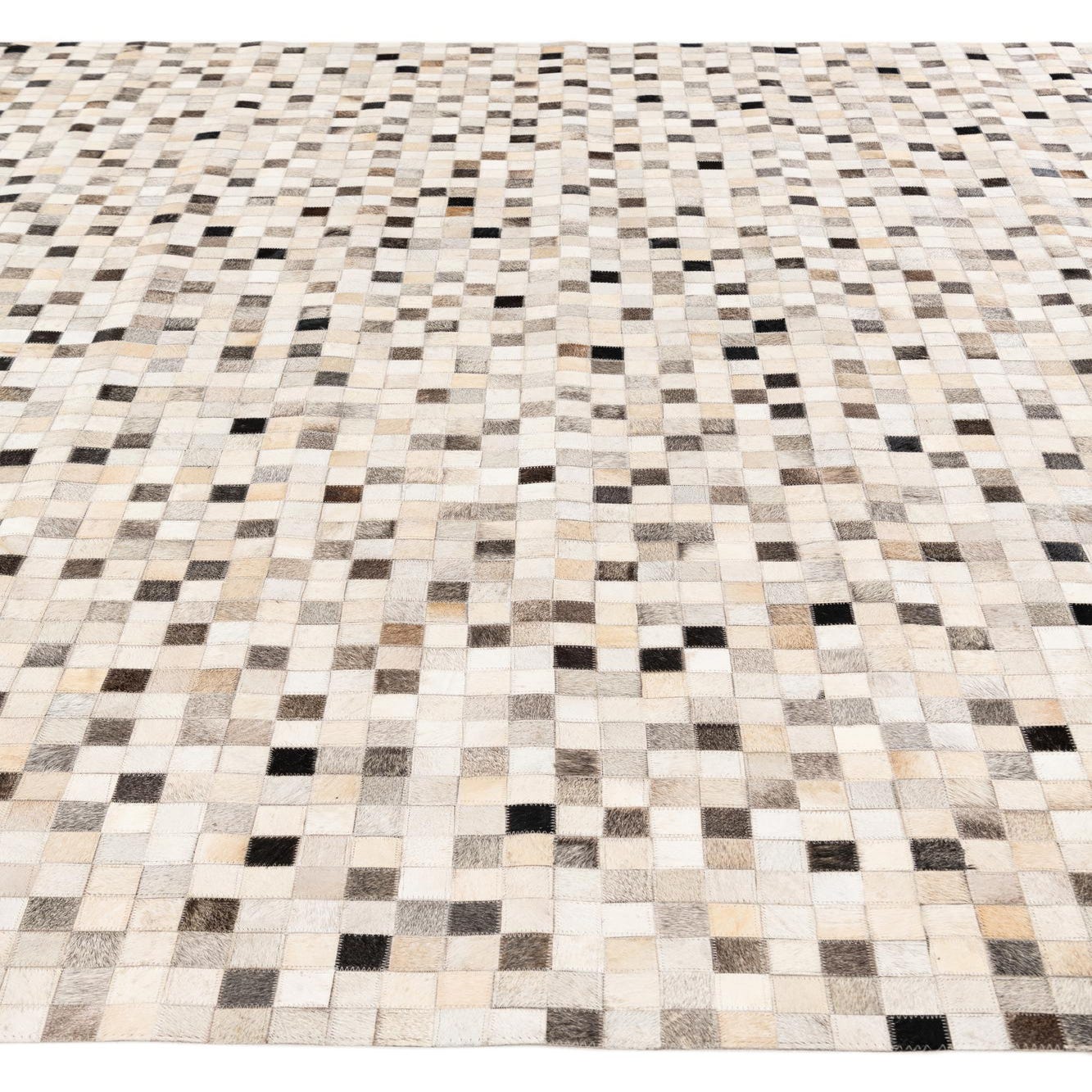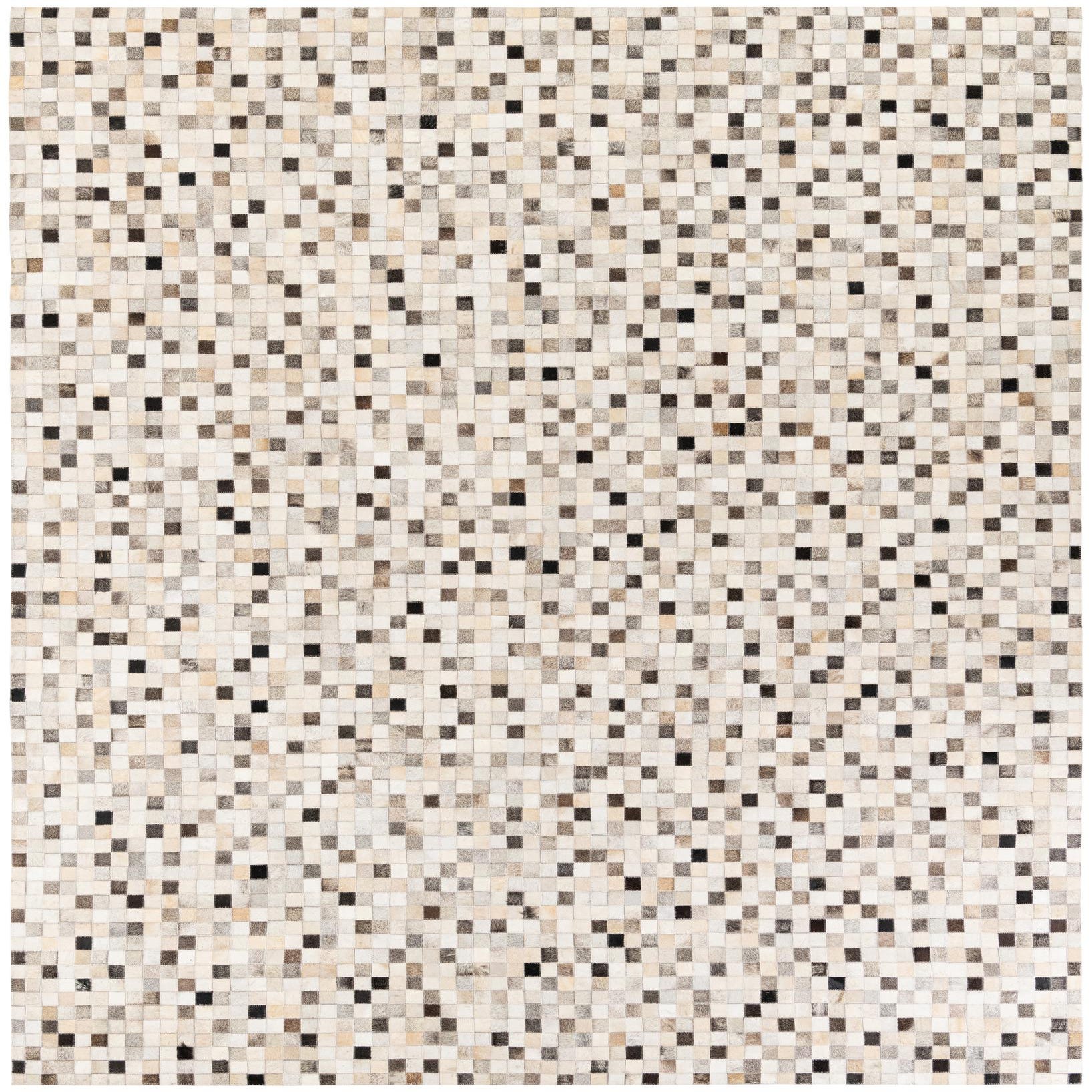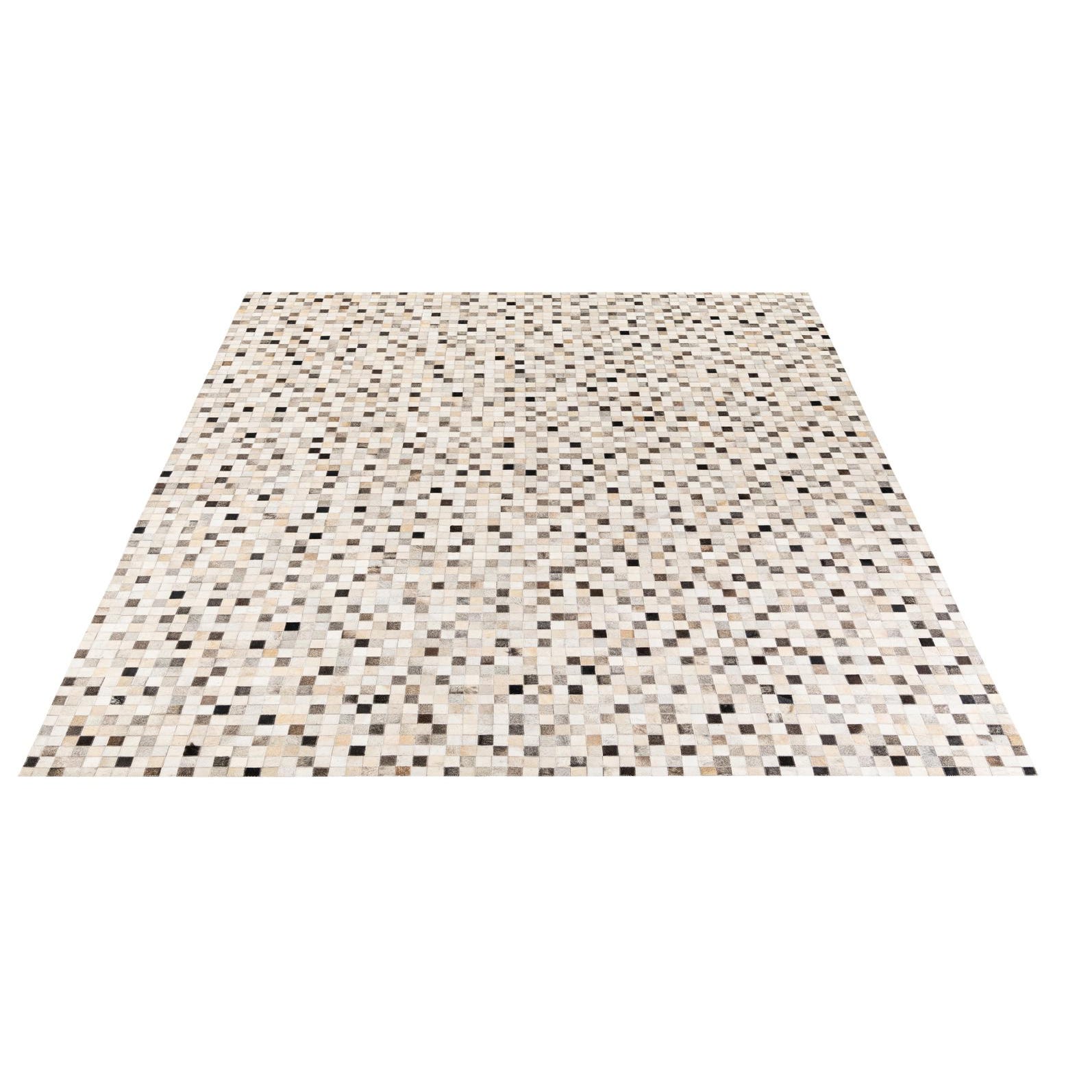 A rectangular 8x10 multi-colored modern cowhide rug with a mosaic pattern of small squares in varying shades of white, beige, brown, and black.