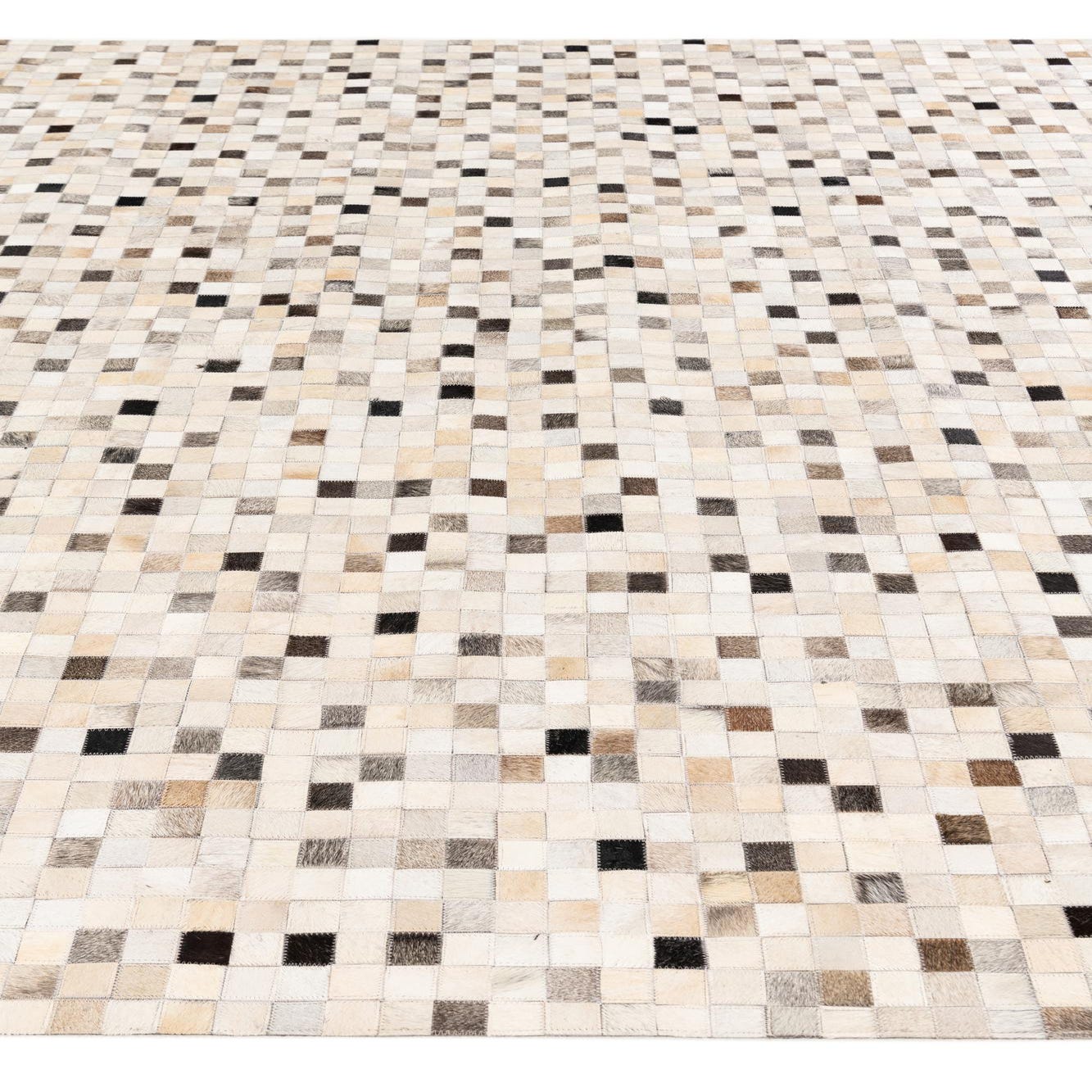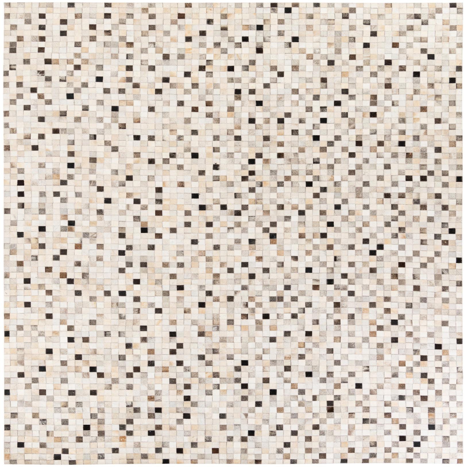 A rectangular 8x10 multi-colored cowhide rug featuring a mosaic pattern of small square patches in varying shades of brown, beige, and black.