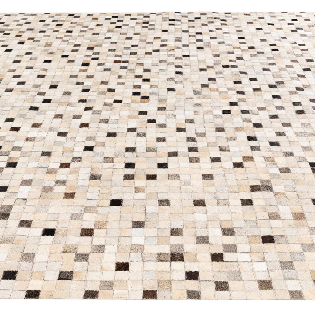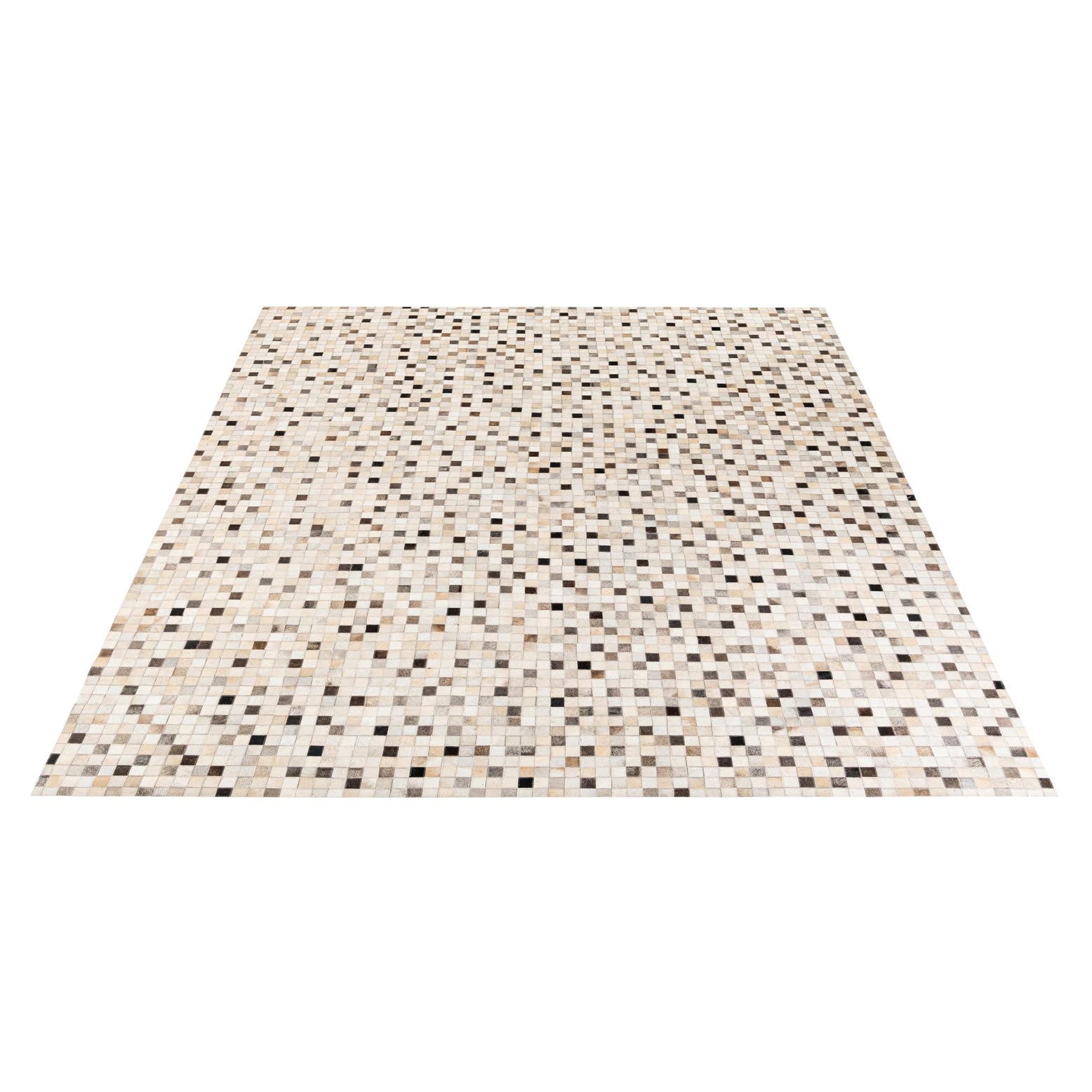 A rectangular 8x10 modern cowhide rug featuring a mosaic pattern of multi-colored square patches in various shades of brown, beige, and black.