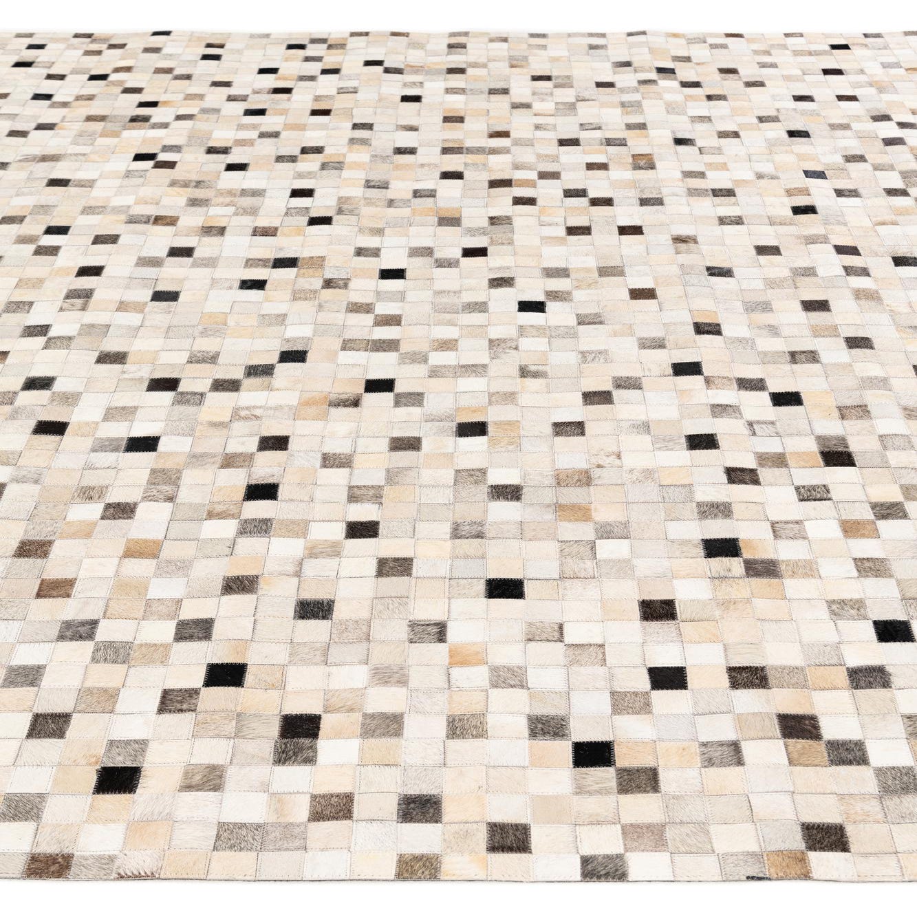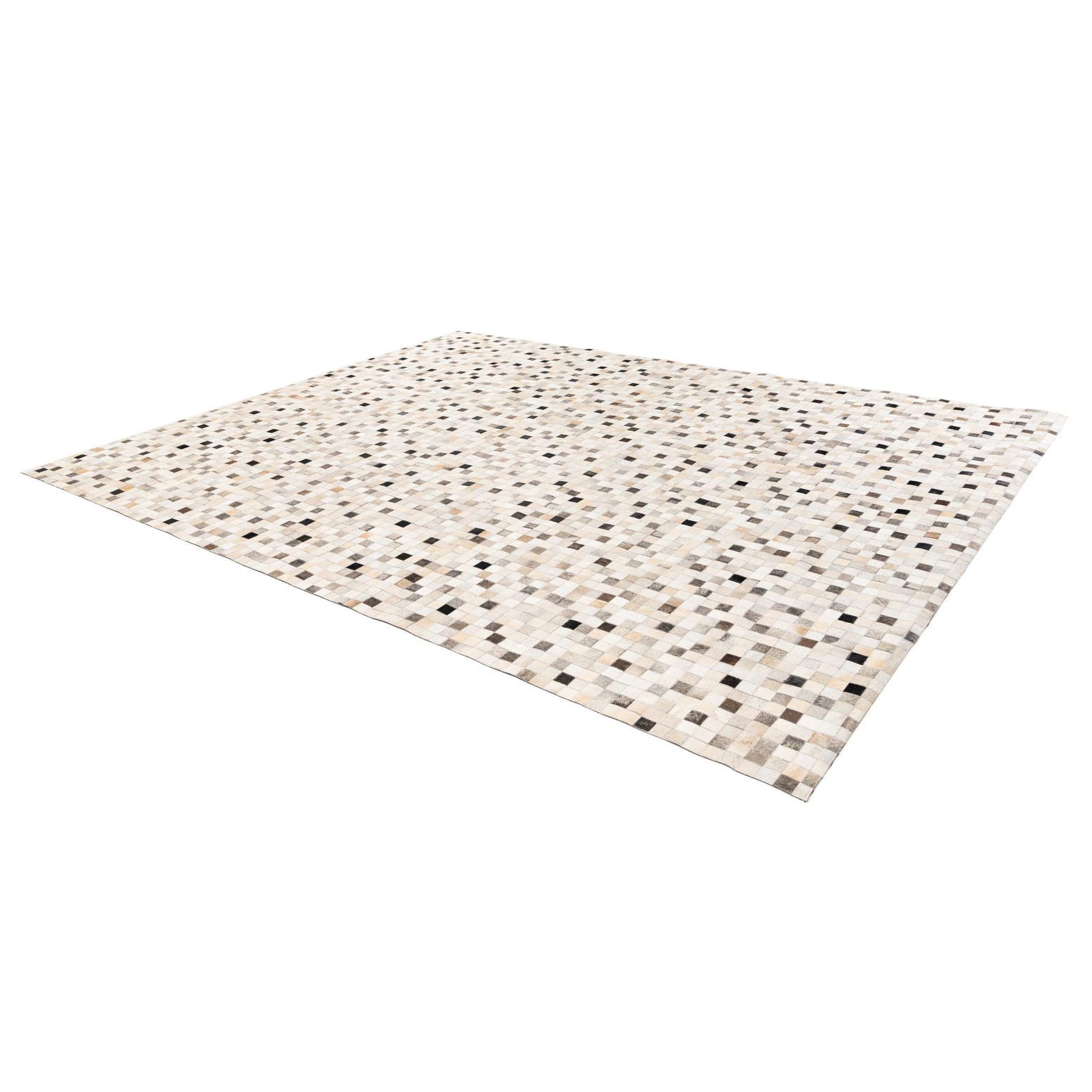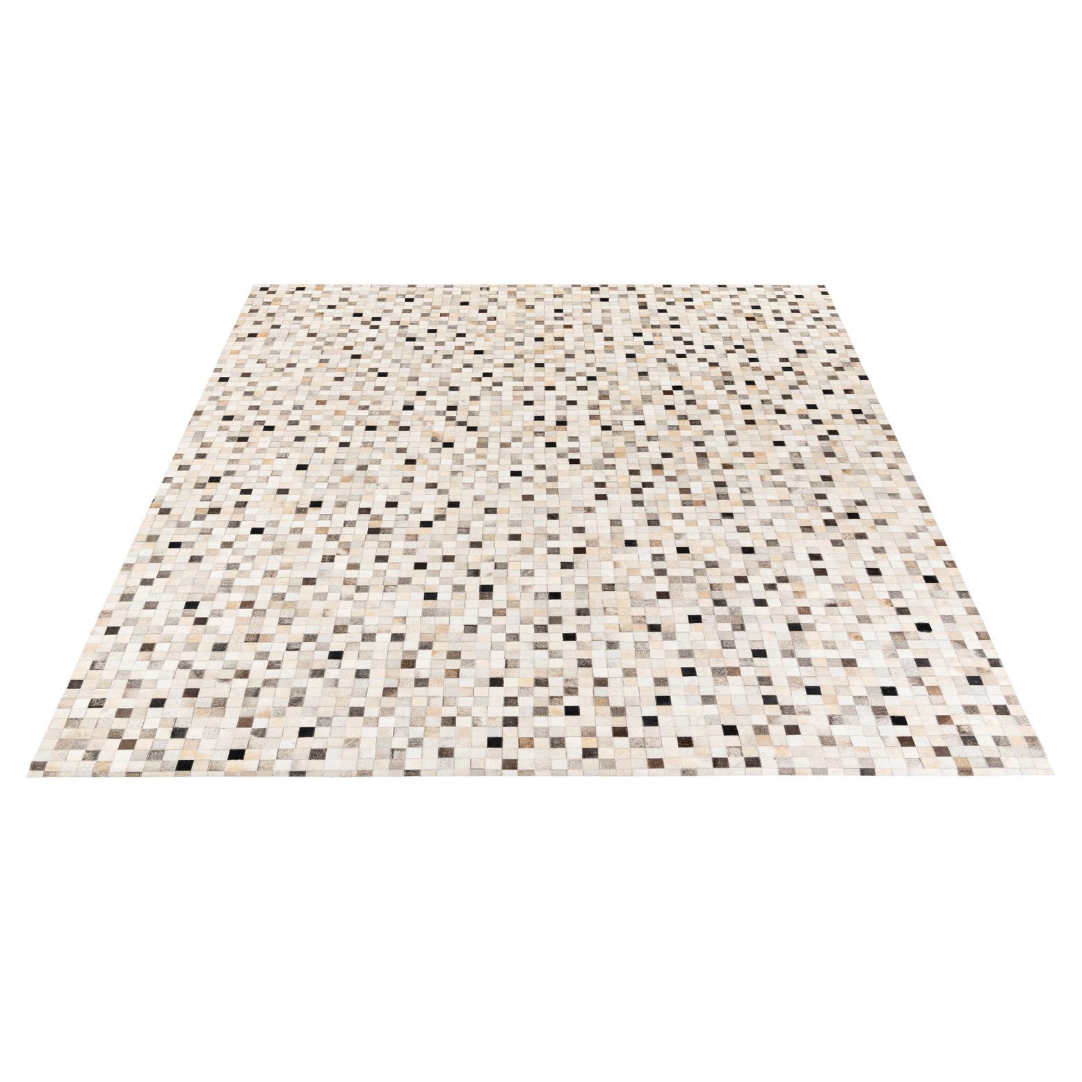 A rectangular 8x10 multi-colored modern cowhide rug with a mosaic pattern of small squares in varying shades of white, beige, brown, and black.