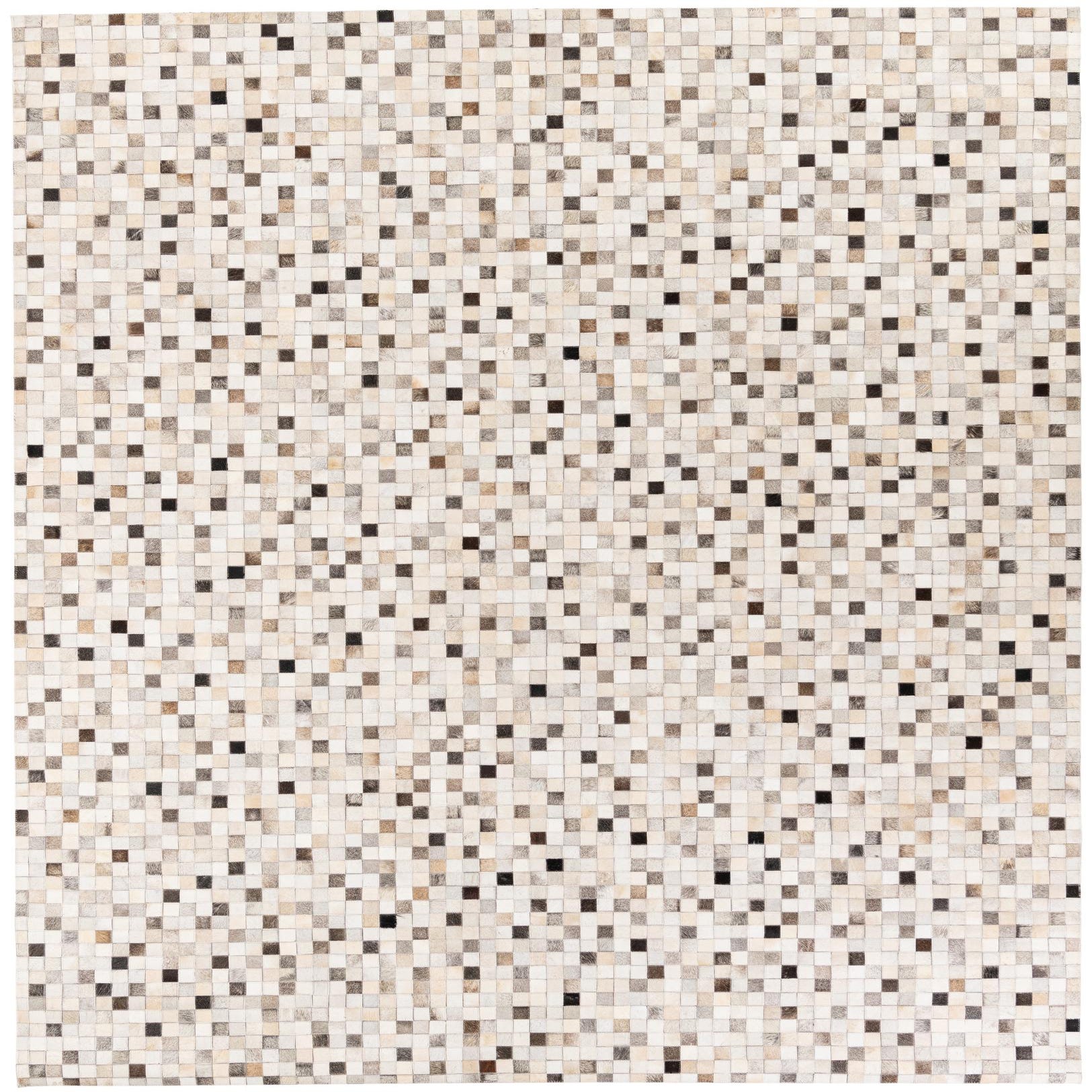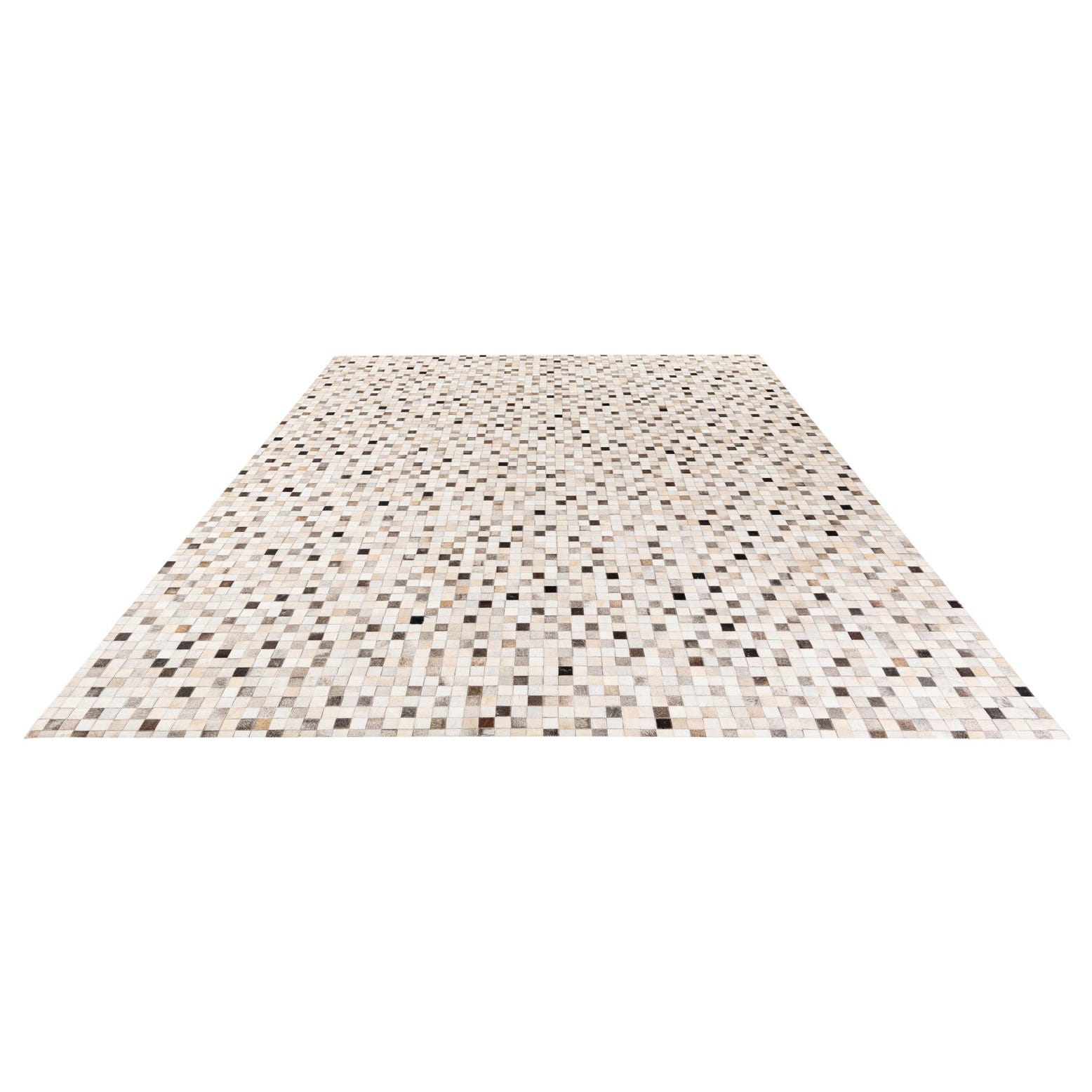 A rectangular 8x10 Cowhide Stocks rug featuring a modern mosaic pattern of multi-colored cowhide squares.