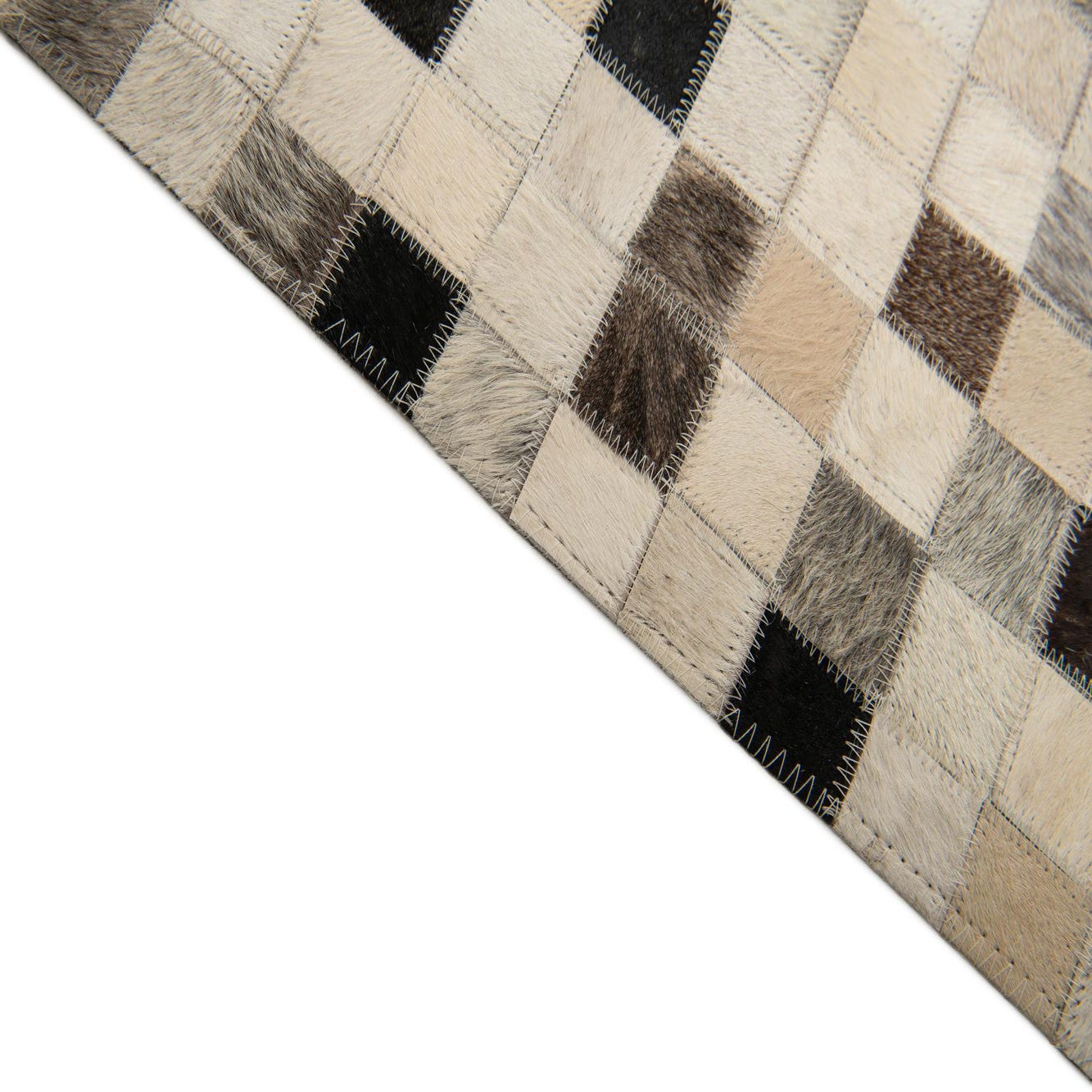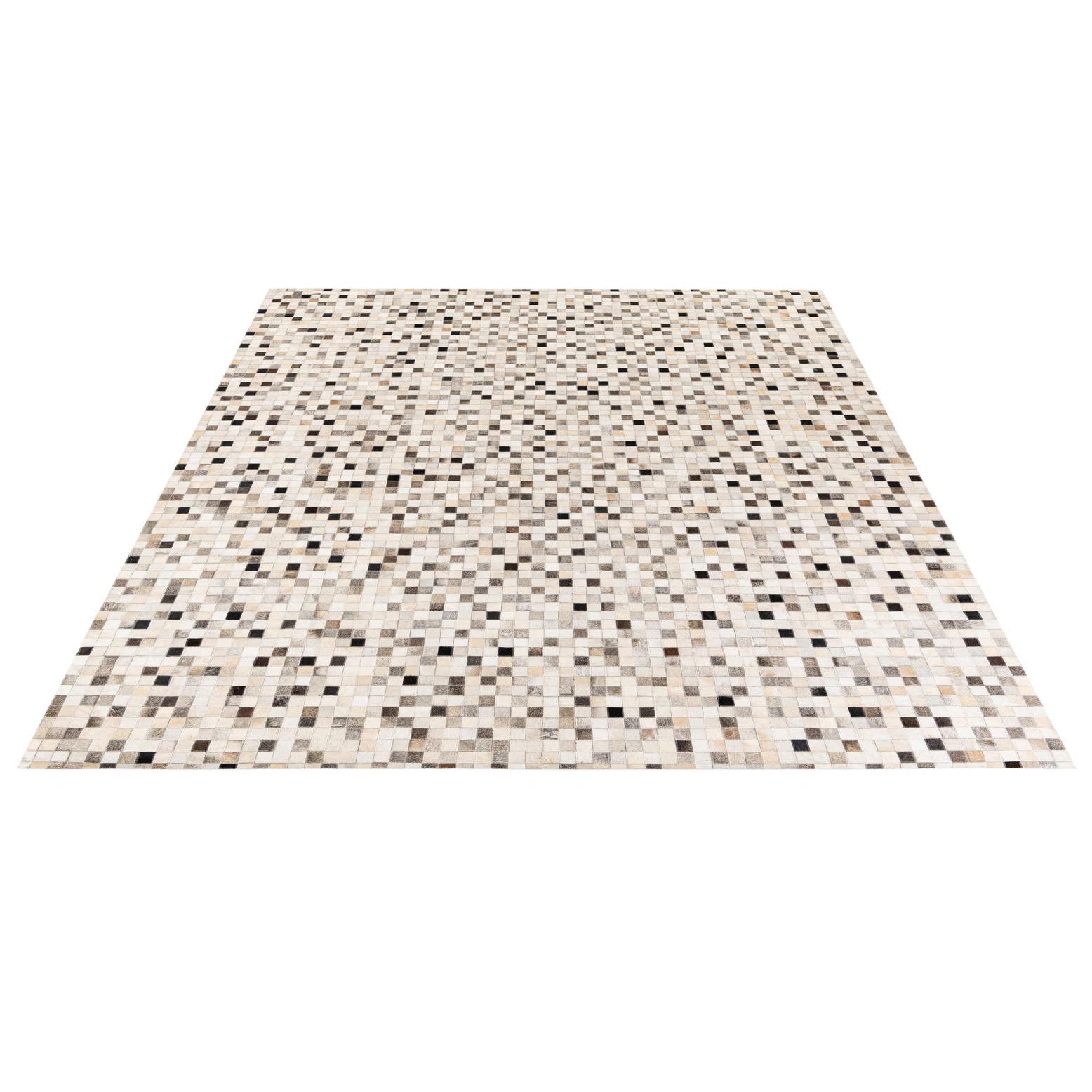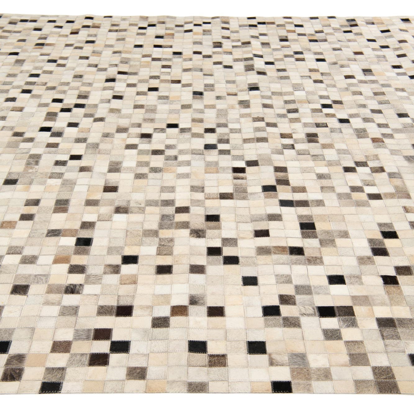 A rectangular 8x10 multi-colored modern cowhide rug with a mosaic pattern of small square patches in shades of white, beige, brown, and black.