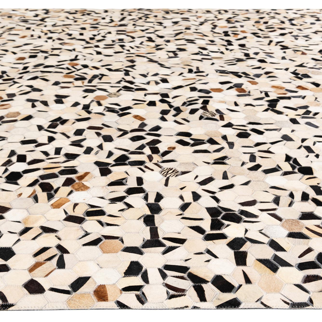 Handmade from cowhide and leather, this rug presents a mosaic-like pattern of small geometric patches set against a multi background. Ivory and beige pieces form the primary field while black, brown, gray and gold accents punctuate the design, creating a lively but balanced composition. The hair-on-hide surface feels smooth and slightly velvety underhand, with natural variations in grain and tone that add tactile depth and a subtle sheen to the low pile.