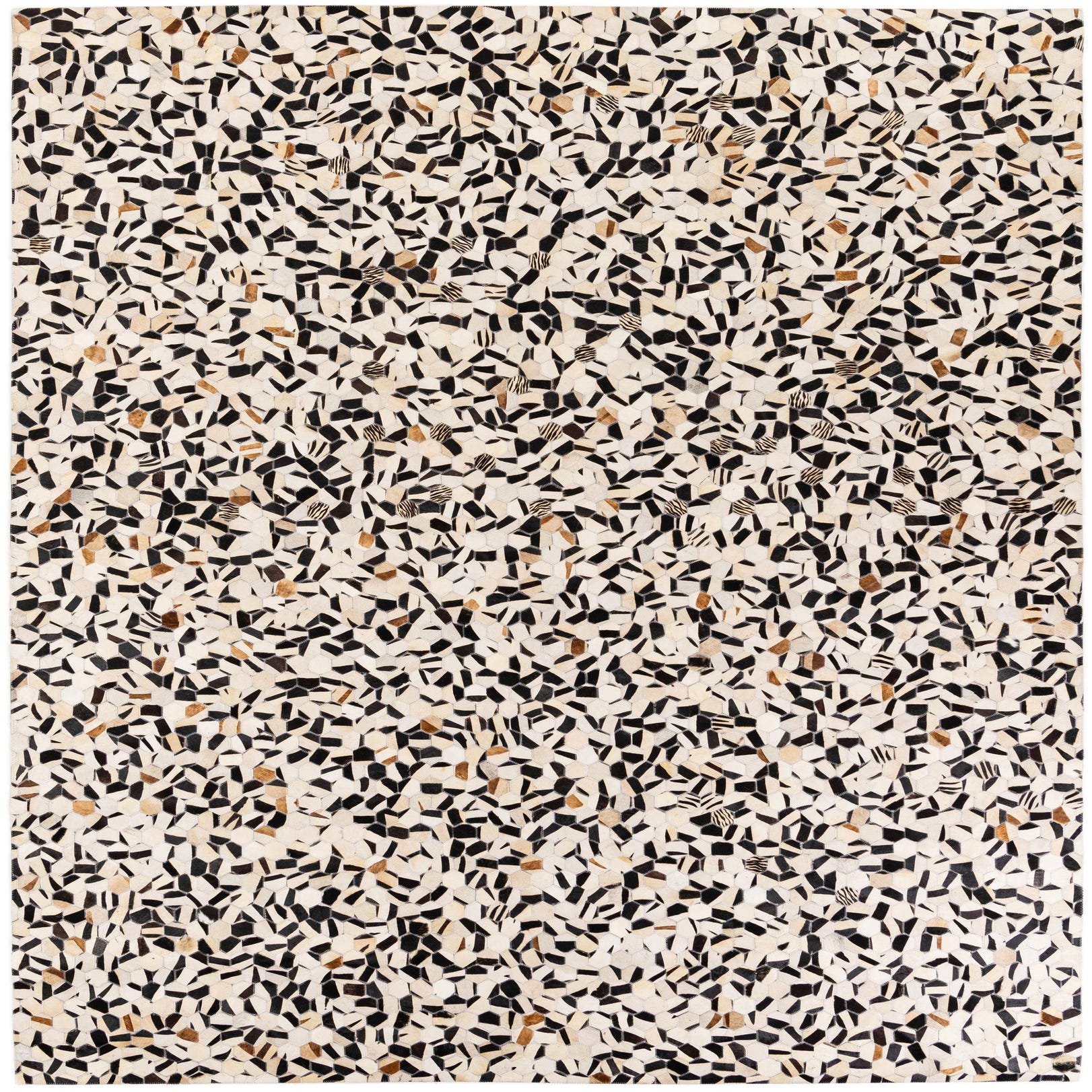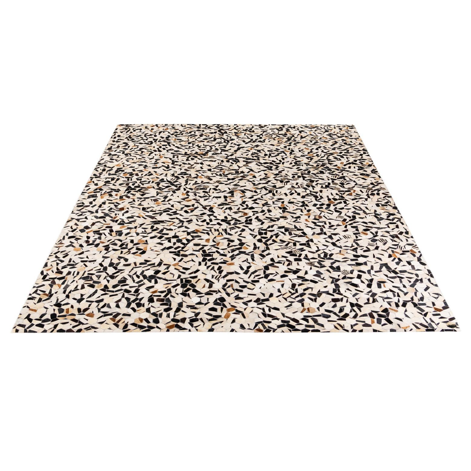 A rectangular 8x10 multi-colored modern rug made of cowhide and leather, featuring a mosaic of black, white, and brown irregular shapes.