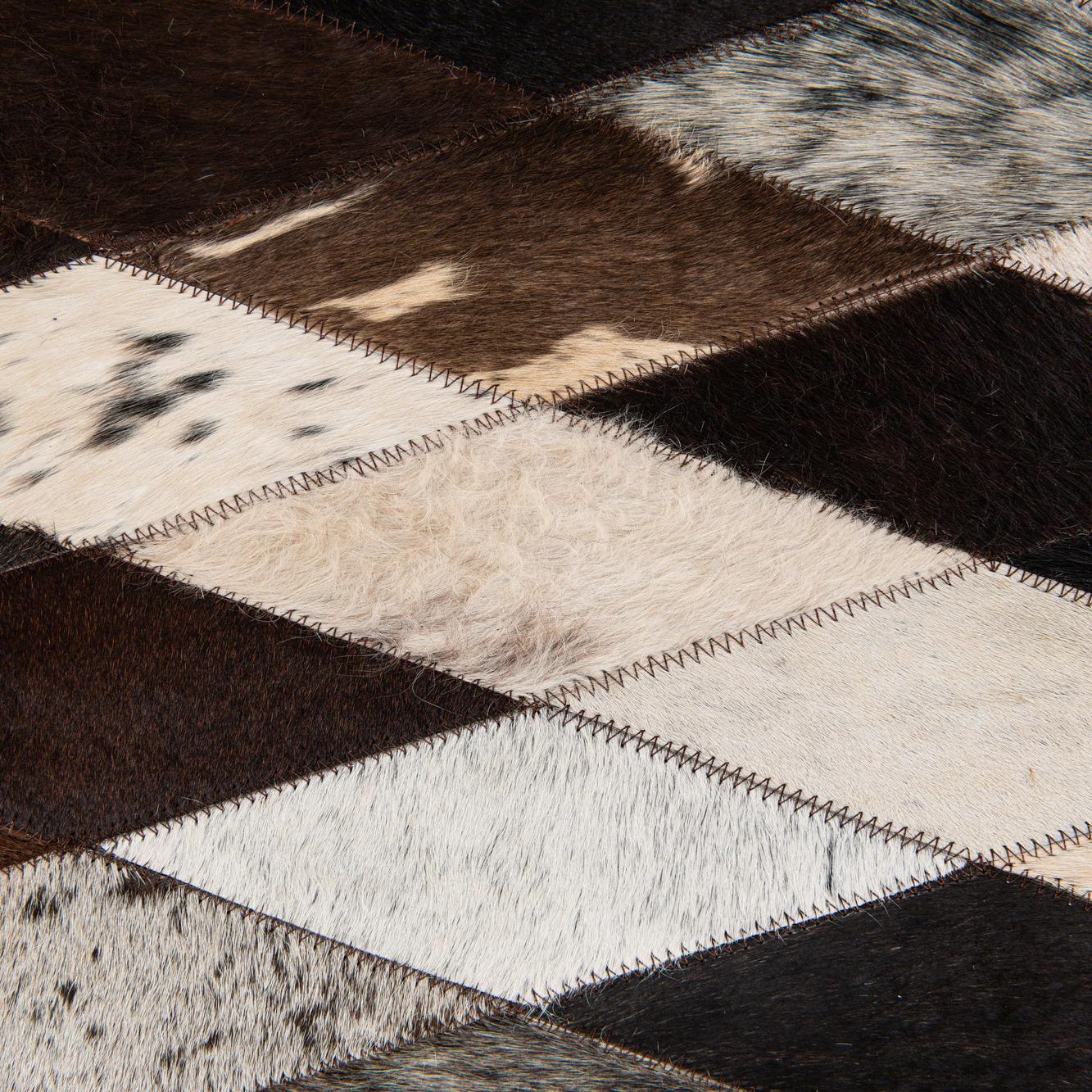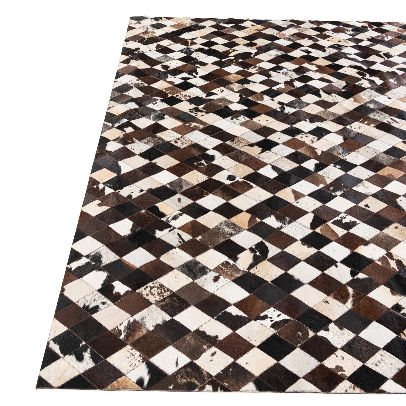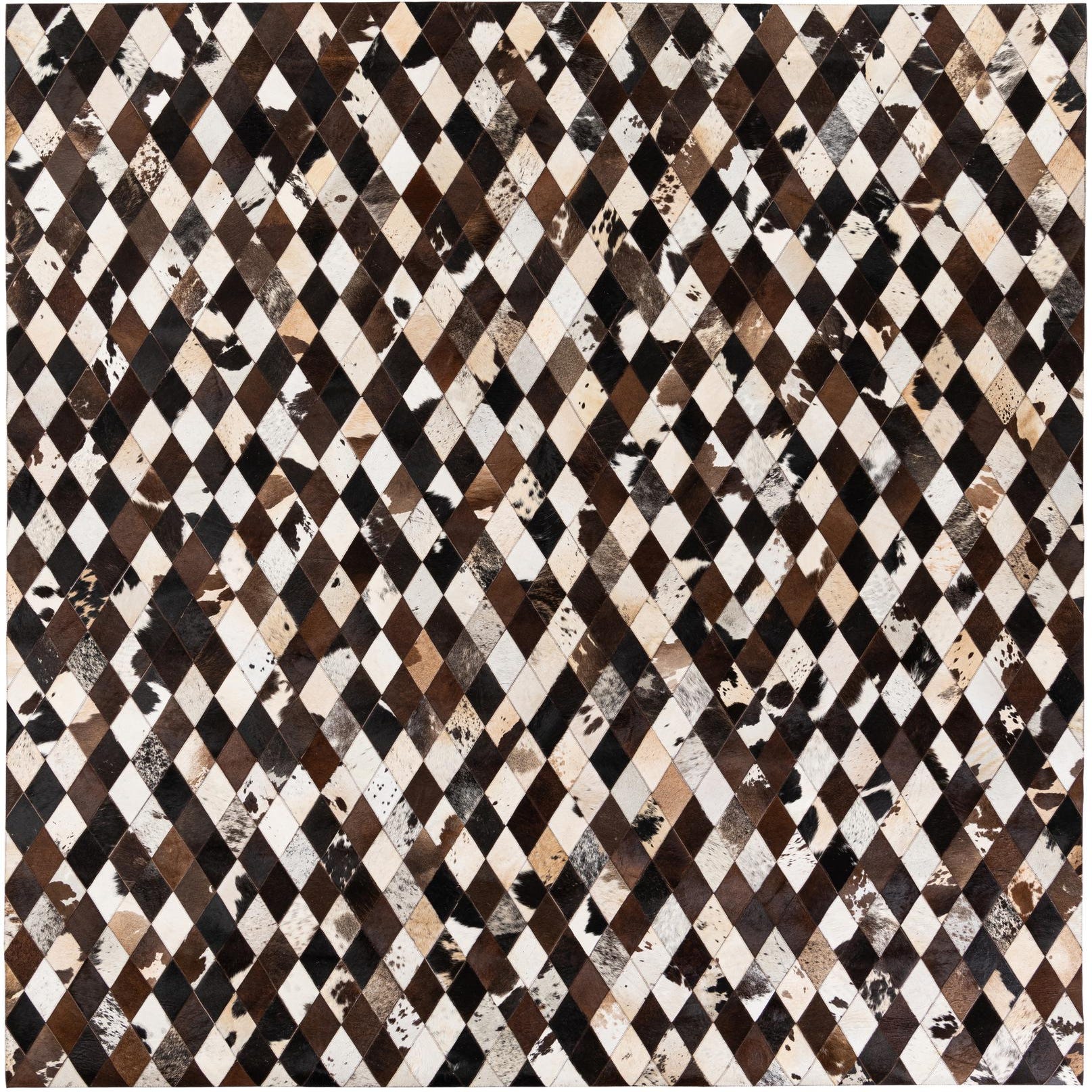 A rectangular 8x10 Cowhide Stocks rug featuring a modern diamond pattern in multi-colored natural cowhide patches.