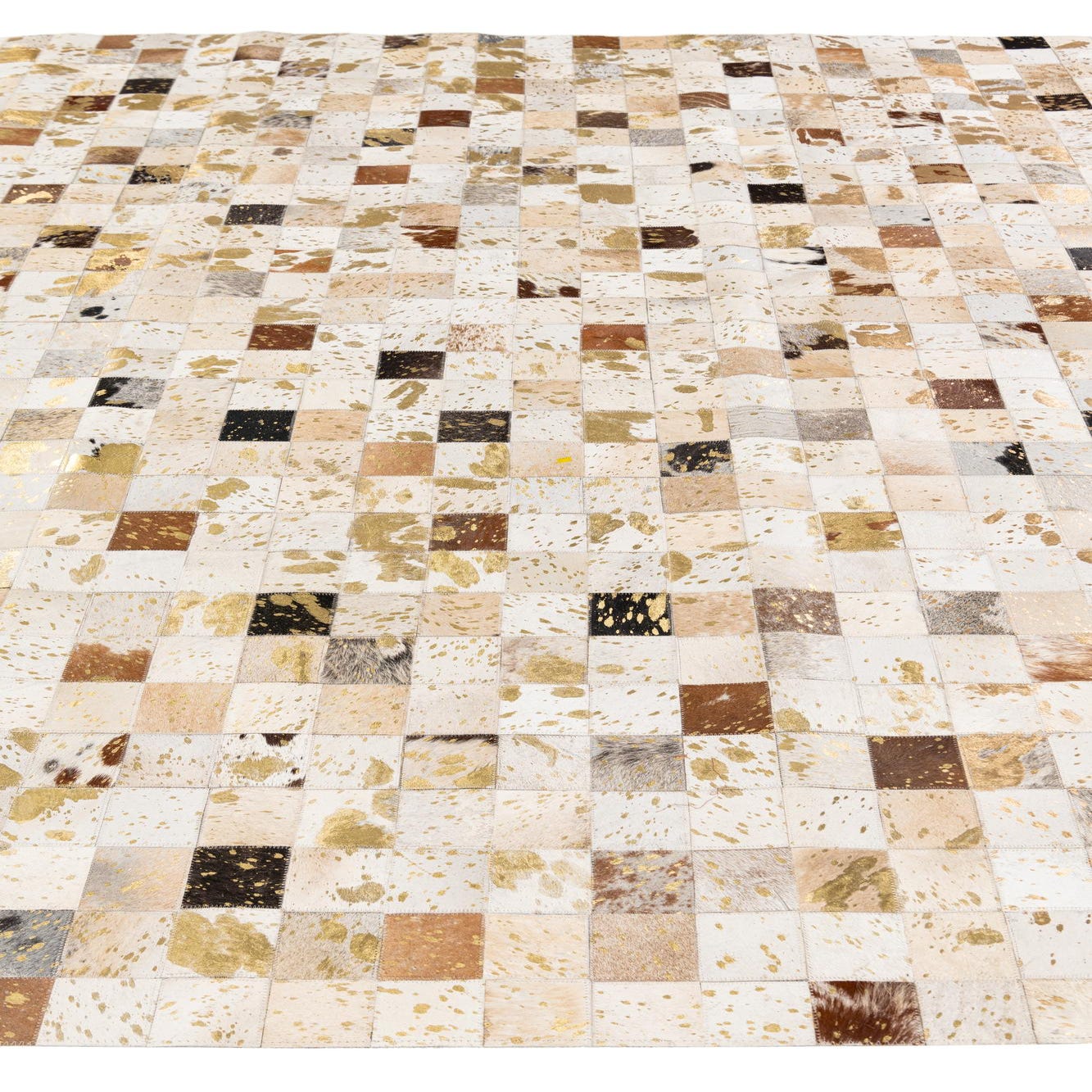 A rectangular 8x10 modern cowhide rug featuring a mosaic of multi-colored squares with gold metallic accents.