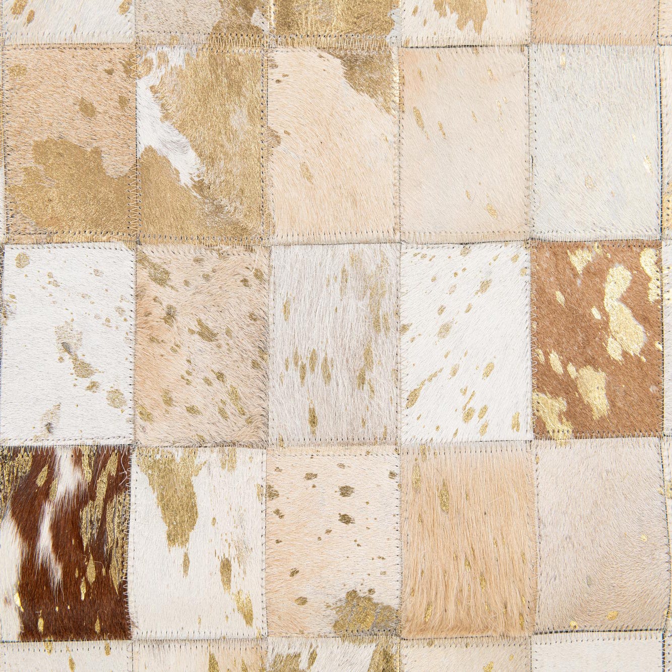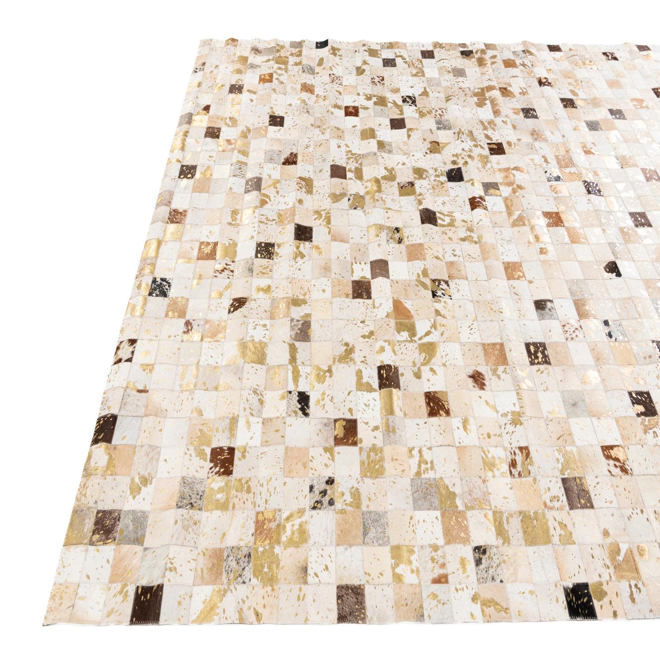 A grid of small, hand-cut squares creates a refined patchwork pattern in a warm, neutral palette. Hand made of cowhide and leather, the rug’s multi-tone background mixes beige, ivory, light brown, brown and black tiles with occasional gold-flecked accents and natural hair-on-hide markings. The surface has a low, supple texture with a subtle sheen from the leather panels and metallic details, so it reads as both tactile and visually layered underfoot.