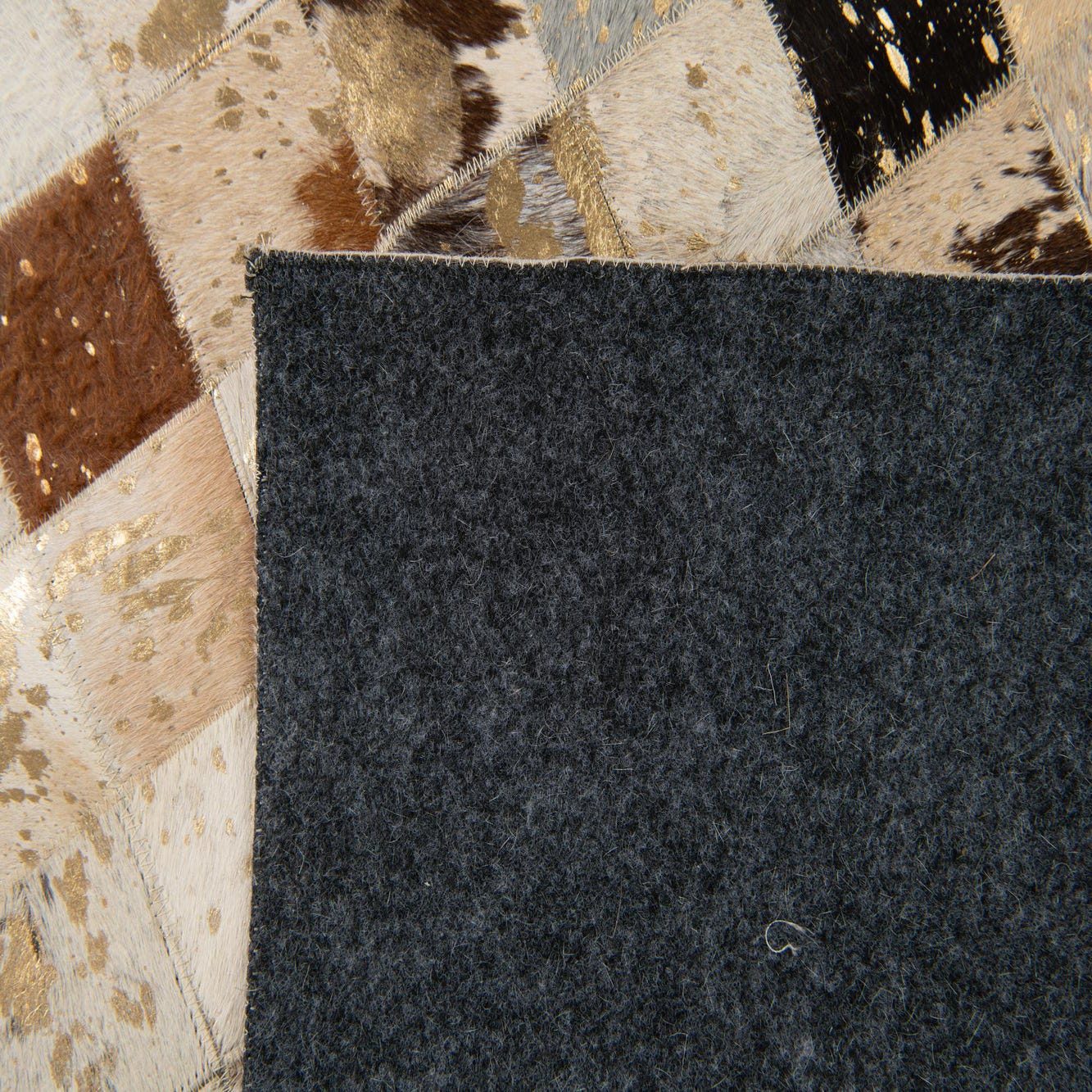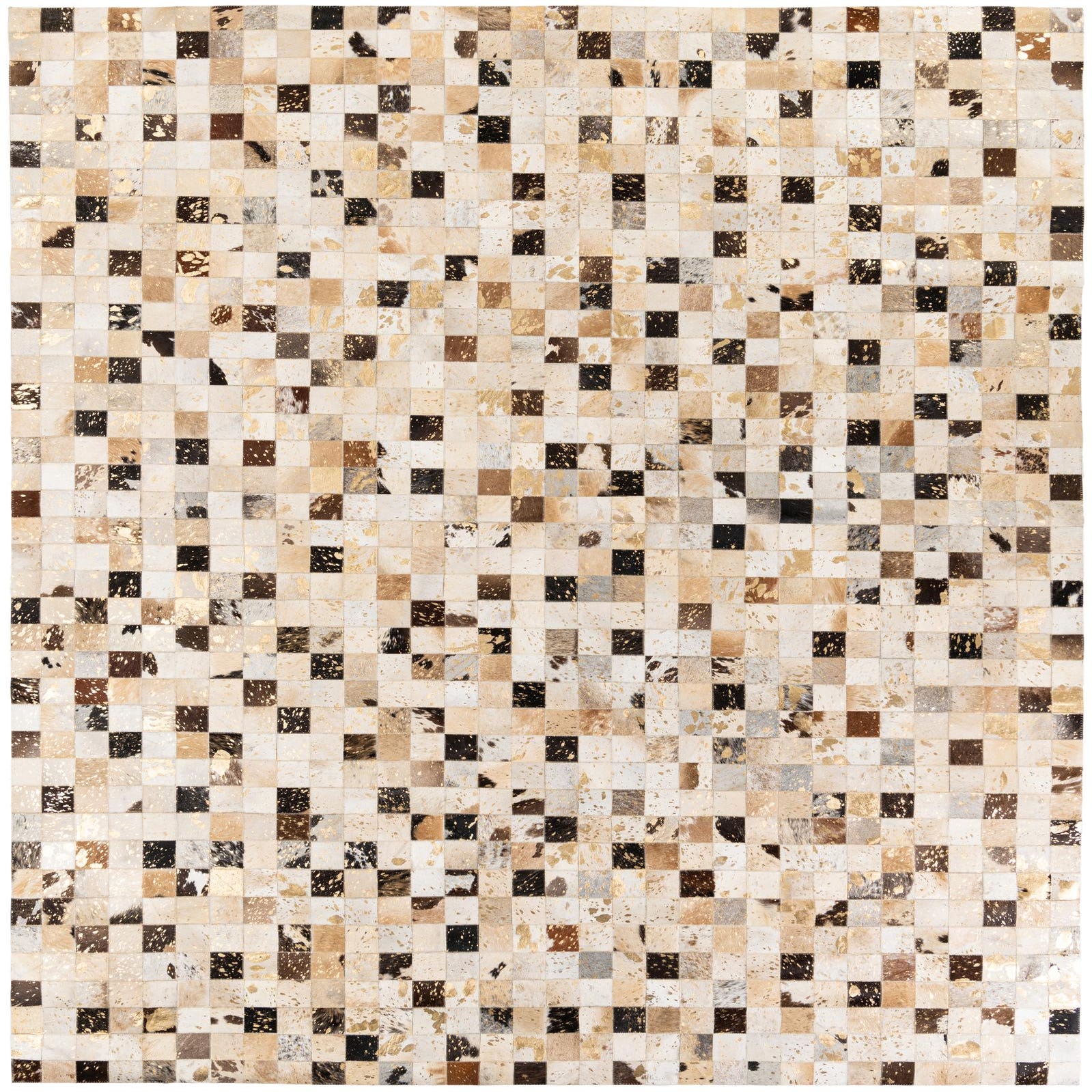 A rectangular 8x10 modern cowhide rug with a mosaic pattern of multi-colored squares, featuring natural brown, black, white, and gold metallic accents.