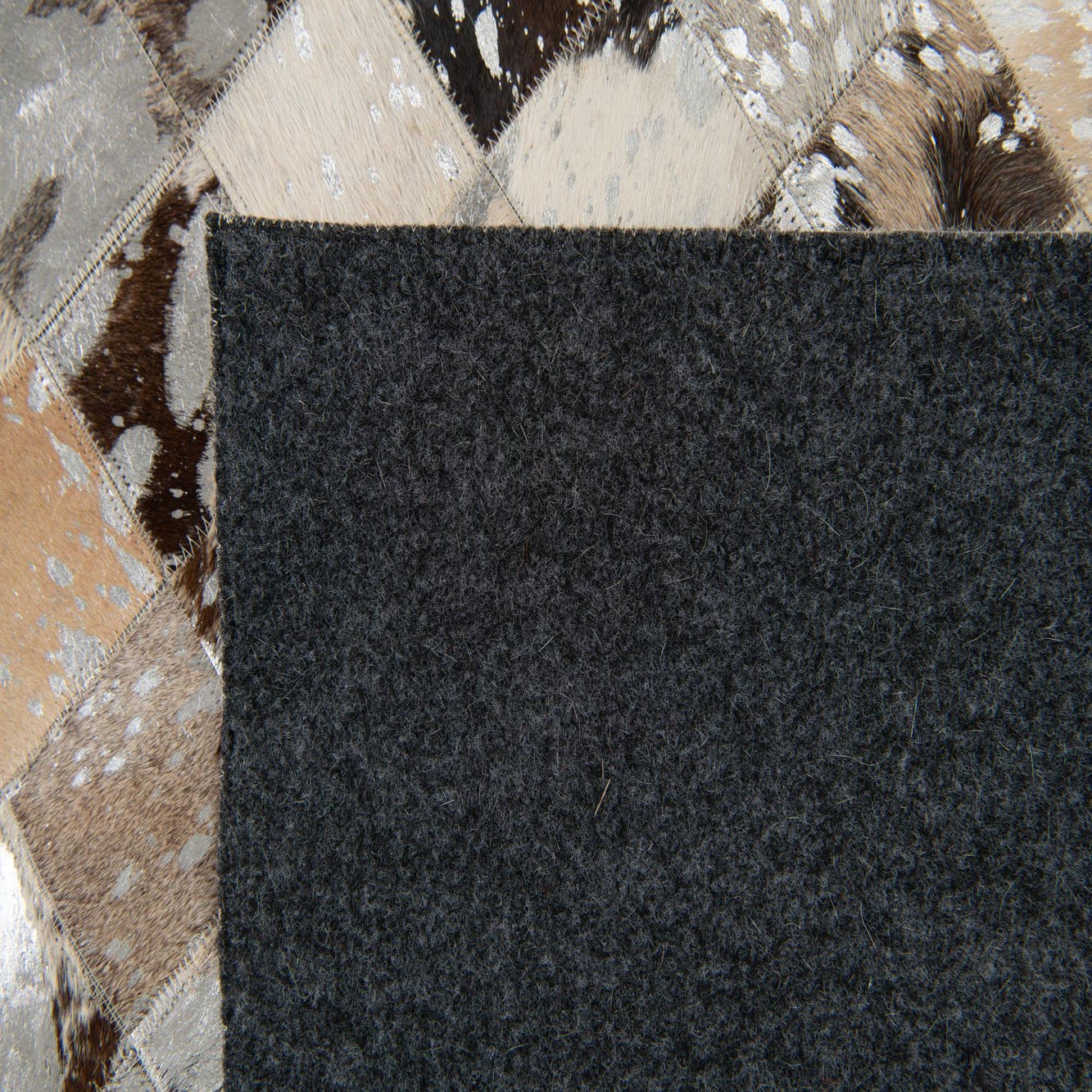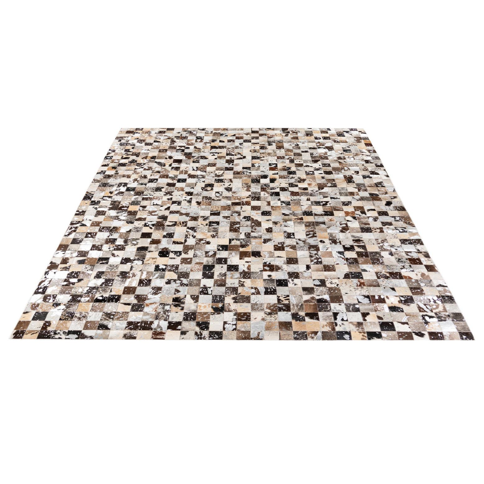 A rectangular 8x10 modern cowhide rug with a multi-colored patchwork design in shades of brown, black, white, and beige.