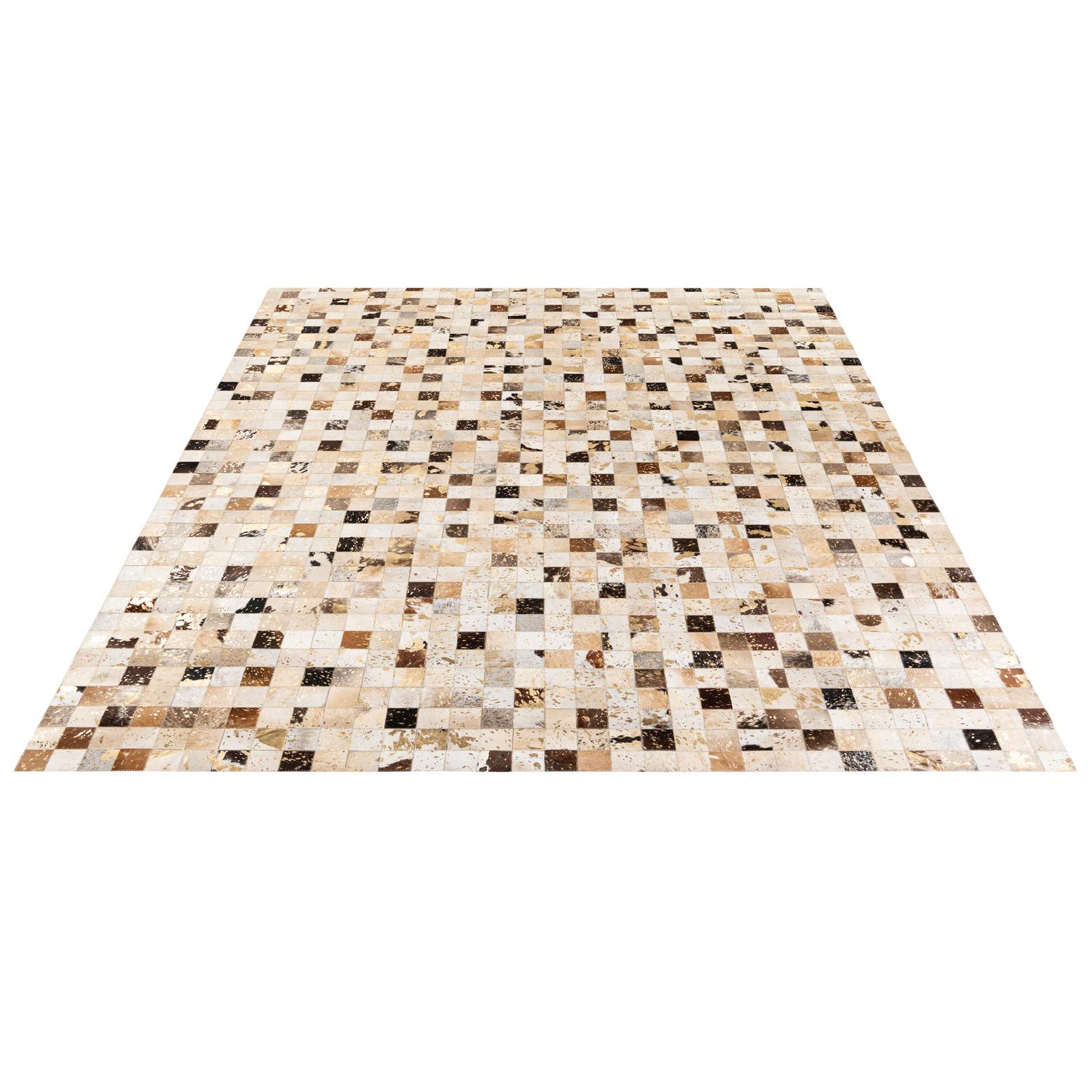 A rectangular 8x10 modern cowhide rug with a multi-colored checkered pattern, featuring squares of natural hide in shades of brown, beige, black, and white.