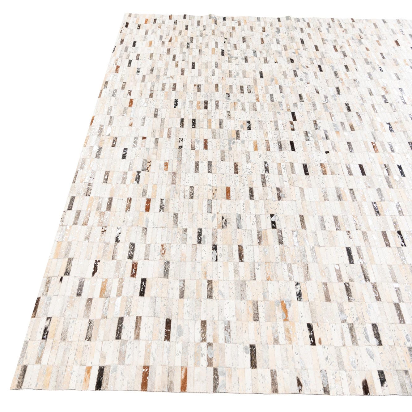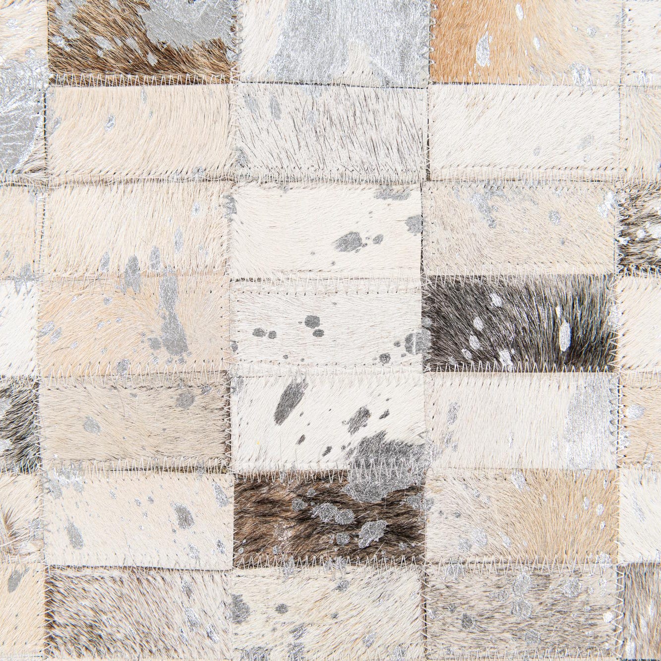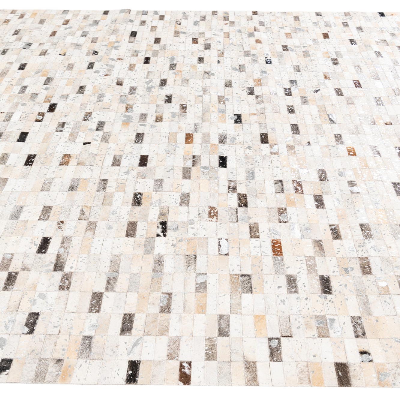 Handmade from cowhide and leather patches, this rug is composed of hundreds of small rectangular pieces stitched together in a precise mosaic grid. The pattern is an understated geometric tapestry of staggered tiles that creates visual movement without loud motifs. A multi-hued background blends beige, ivory, tan, light brown, brown, black and hints of silver for a layered neutral palette. Running your hand across the surface you’ll notice subtle tactile variation where short hair-on-hide sections sit next to smooth leather pieces, producing a low-profile sheen and a pleasantly tactile finish.