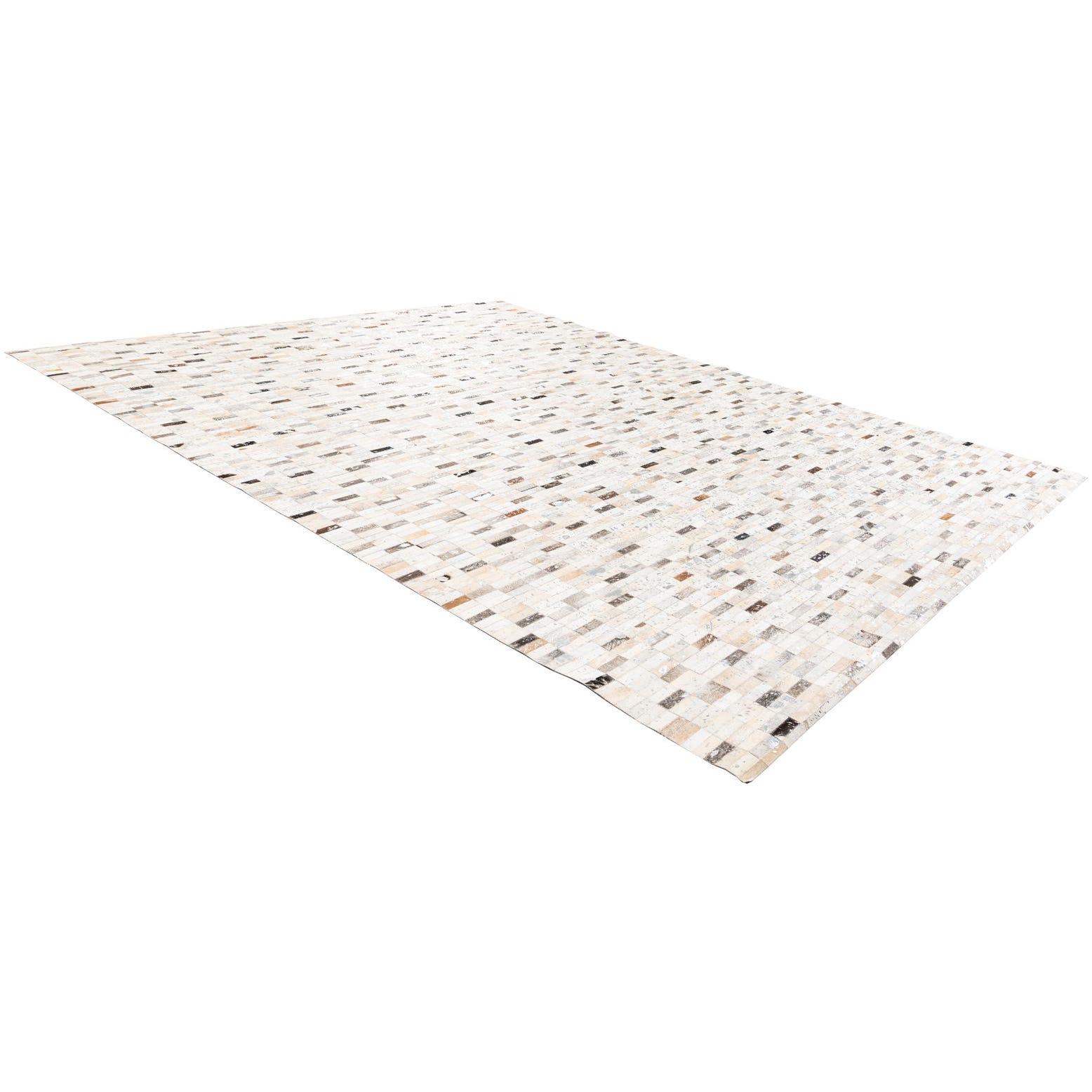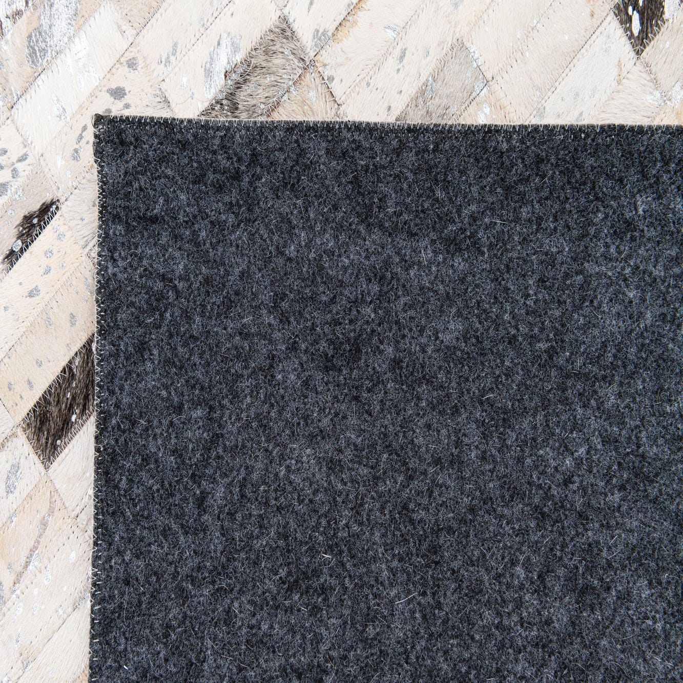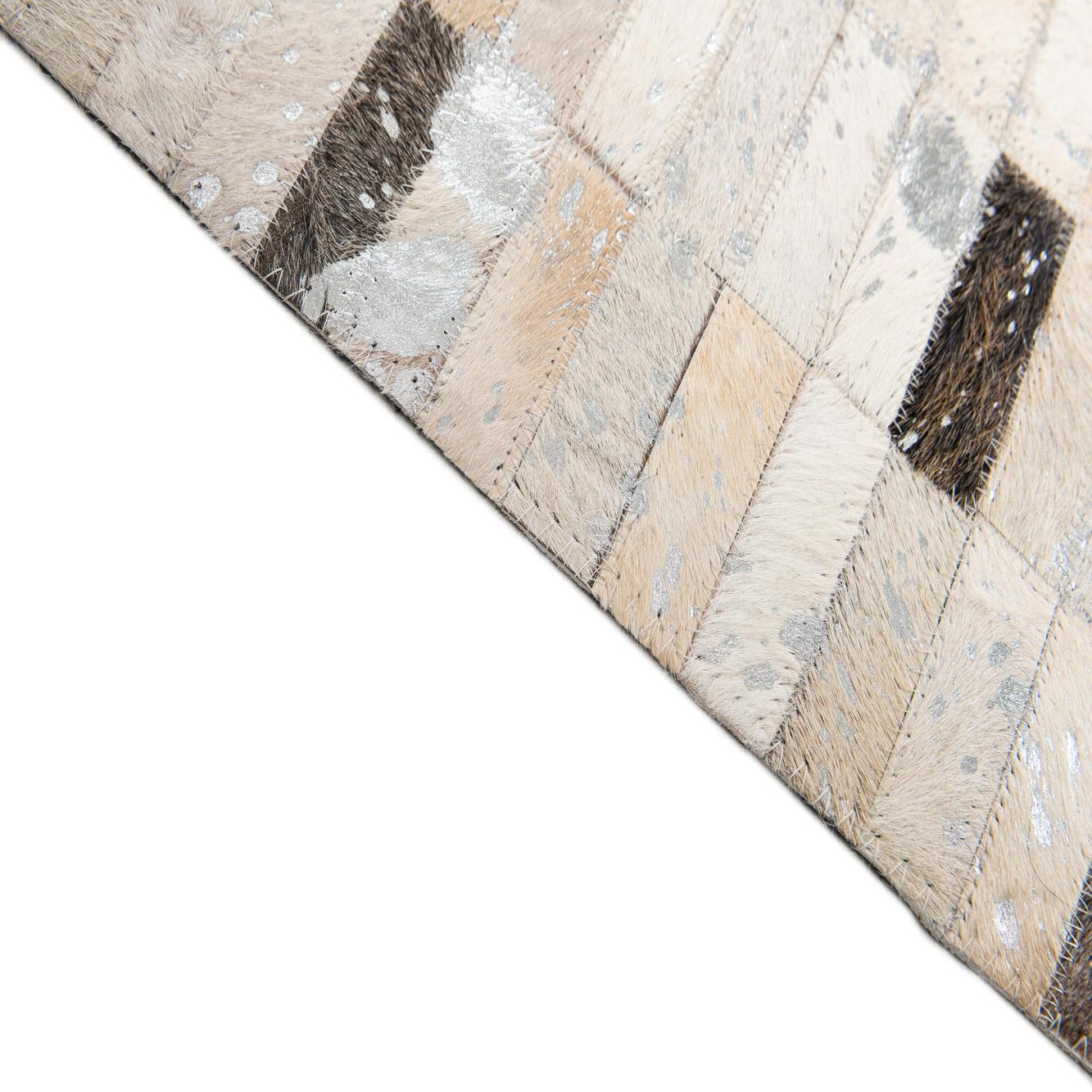Handmade from cowhide and leather patches, this rug is composed of hundreds of small rectangular pieces stitched together in a precise mosaic grid. The pattern is an understated geometric tapestry of staggered tiles that creates visual movement without loud motifs. A multi-hued background blends beige, ivory, tan, light brown, brown, black and hints of silver for a layered neutral palette. Running your hand across the surface you’ll notice subtle tactile variation where short hair-on-hide sections sit next to smooth leather pieces, producing a low-profile sheen and a pleasantly tactile finish.