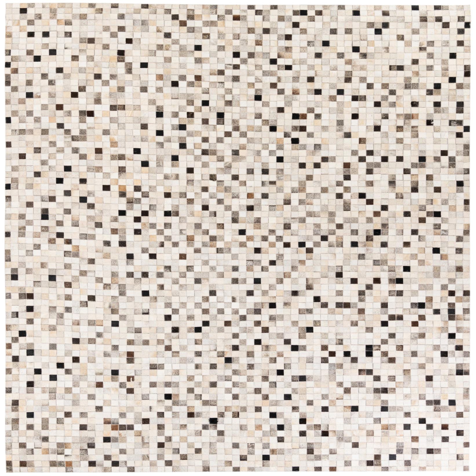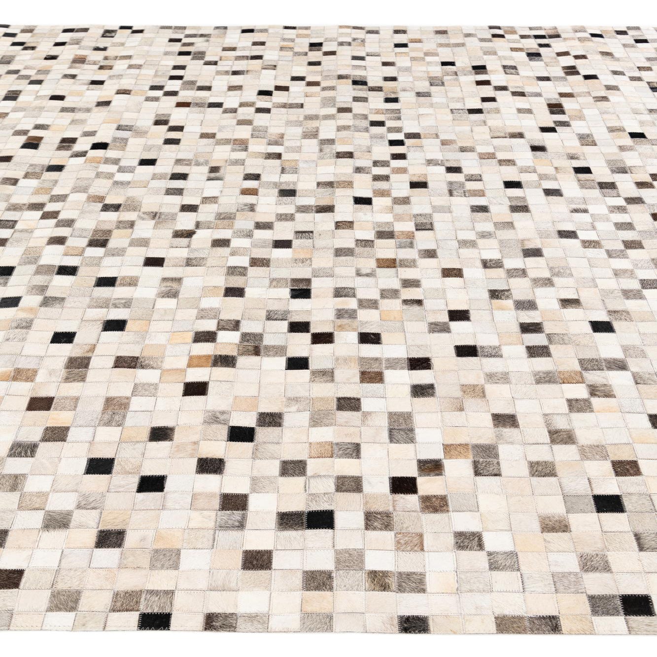A rectangular 8x10 multi-colored modern cowhide rug with a mosaic pattern of small squares in varying shades of black, brown, and cream.