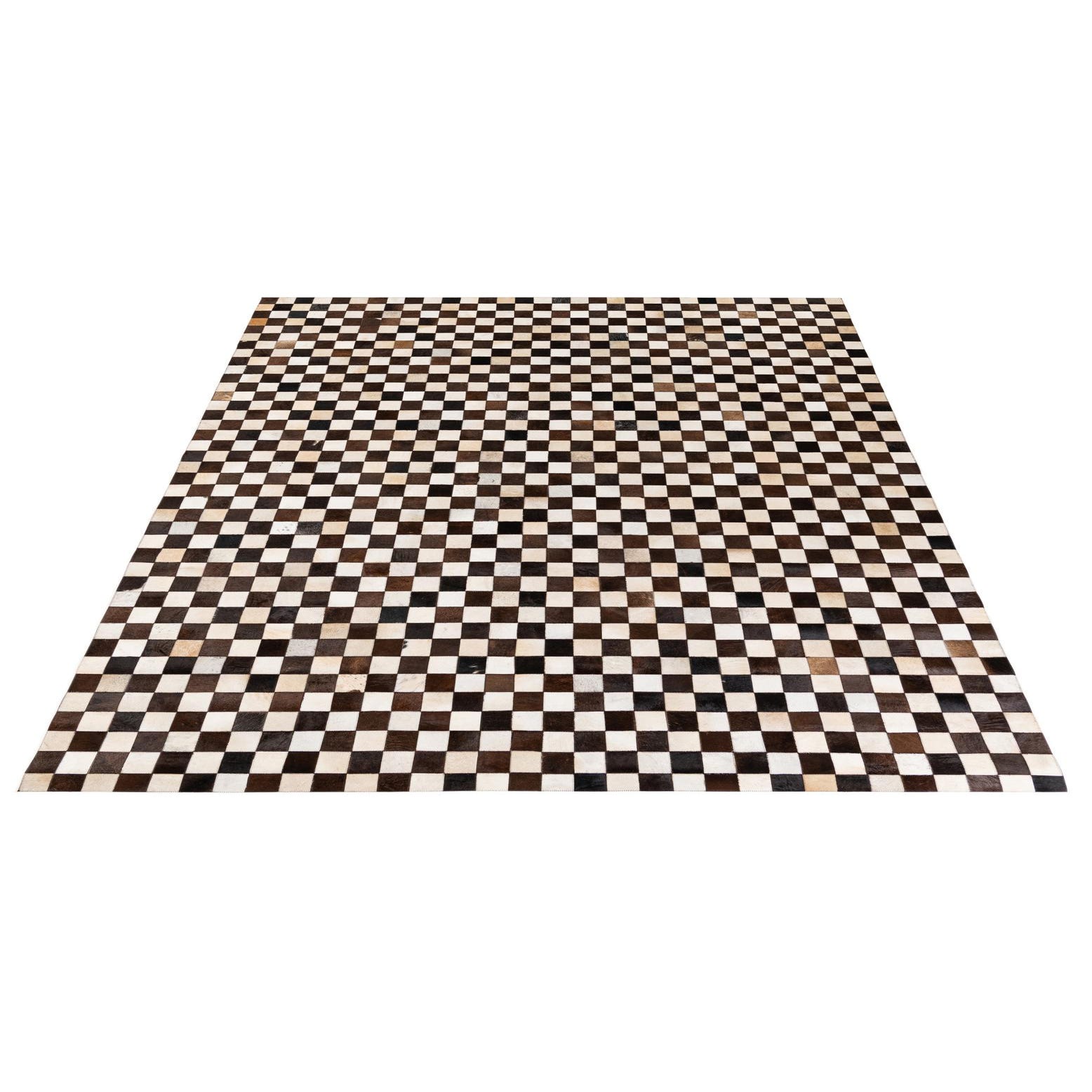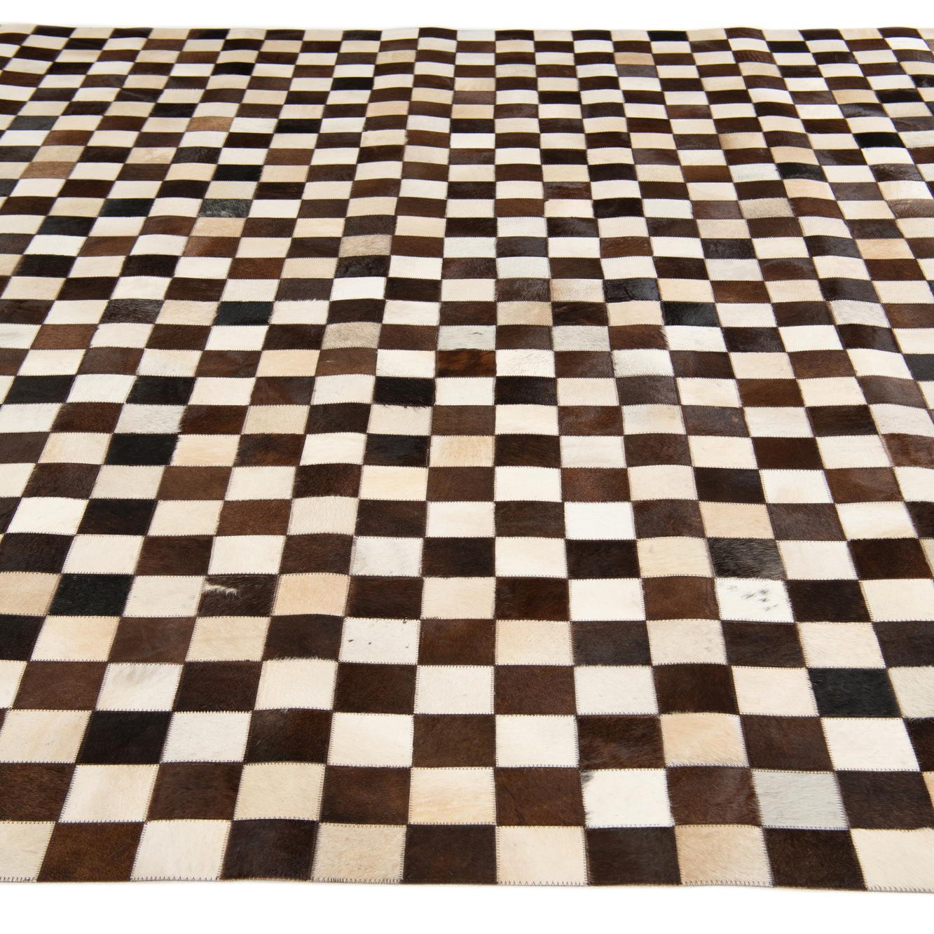 A rectangular 8x10 cowhide rug featuring a modern checkerboard pattern in varied shades of brown, black, and cream.