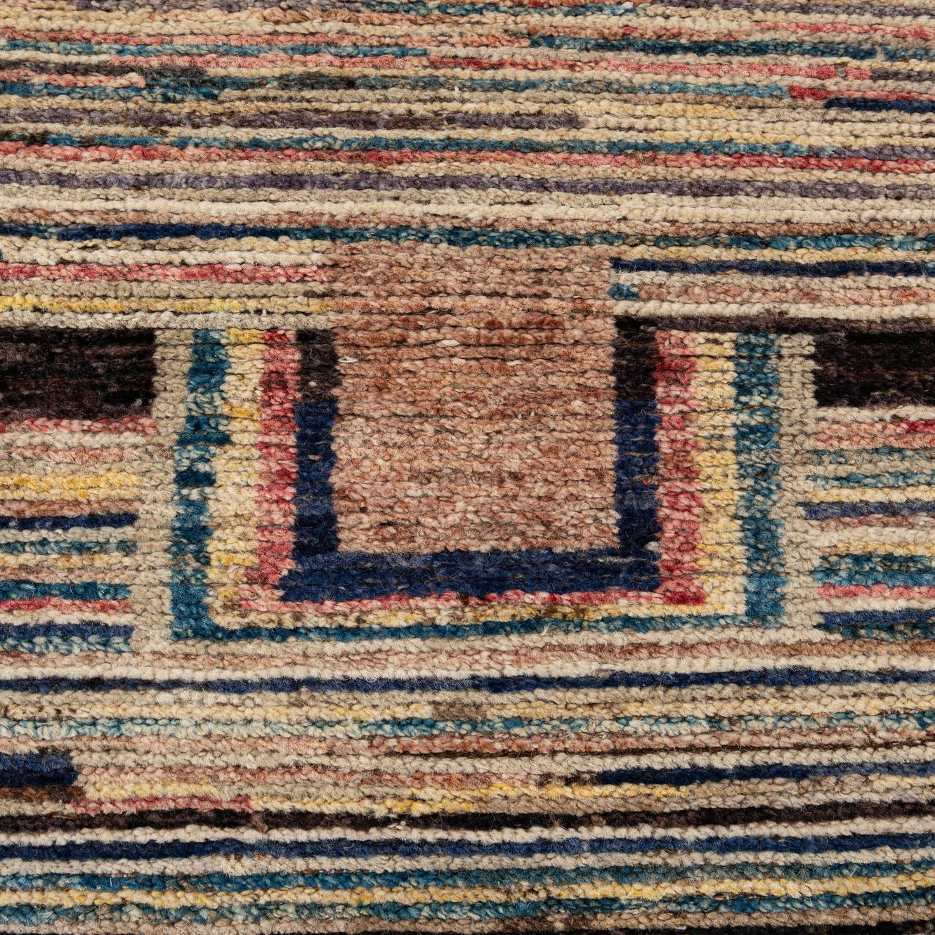 A rectangular 8x10 Darya wool rug with a modern stripe pattern in multi-colored hues, featuring horizontal and vertical lines and geometric blocks.