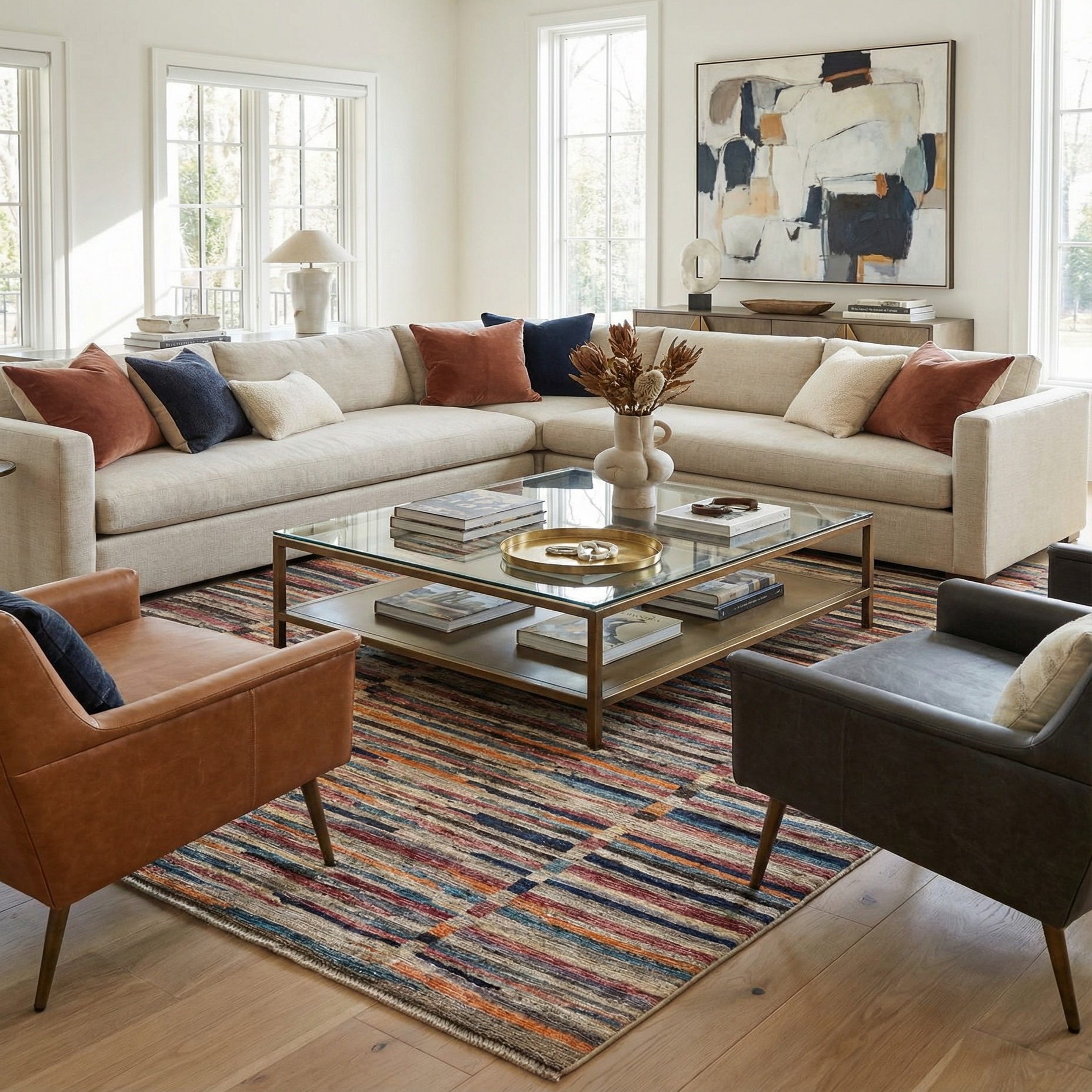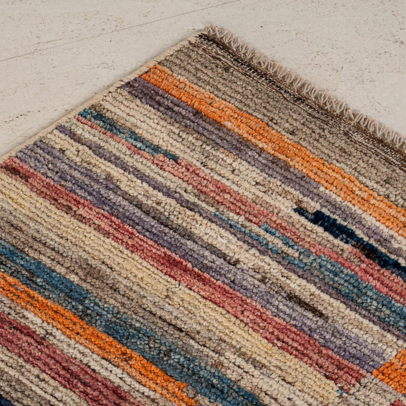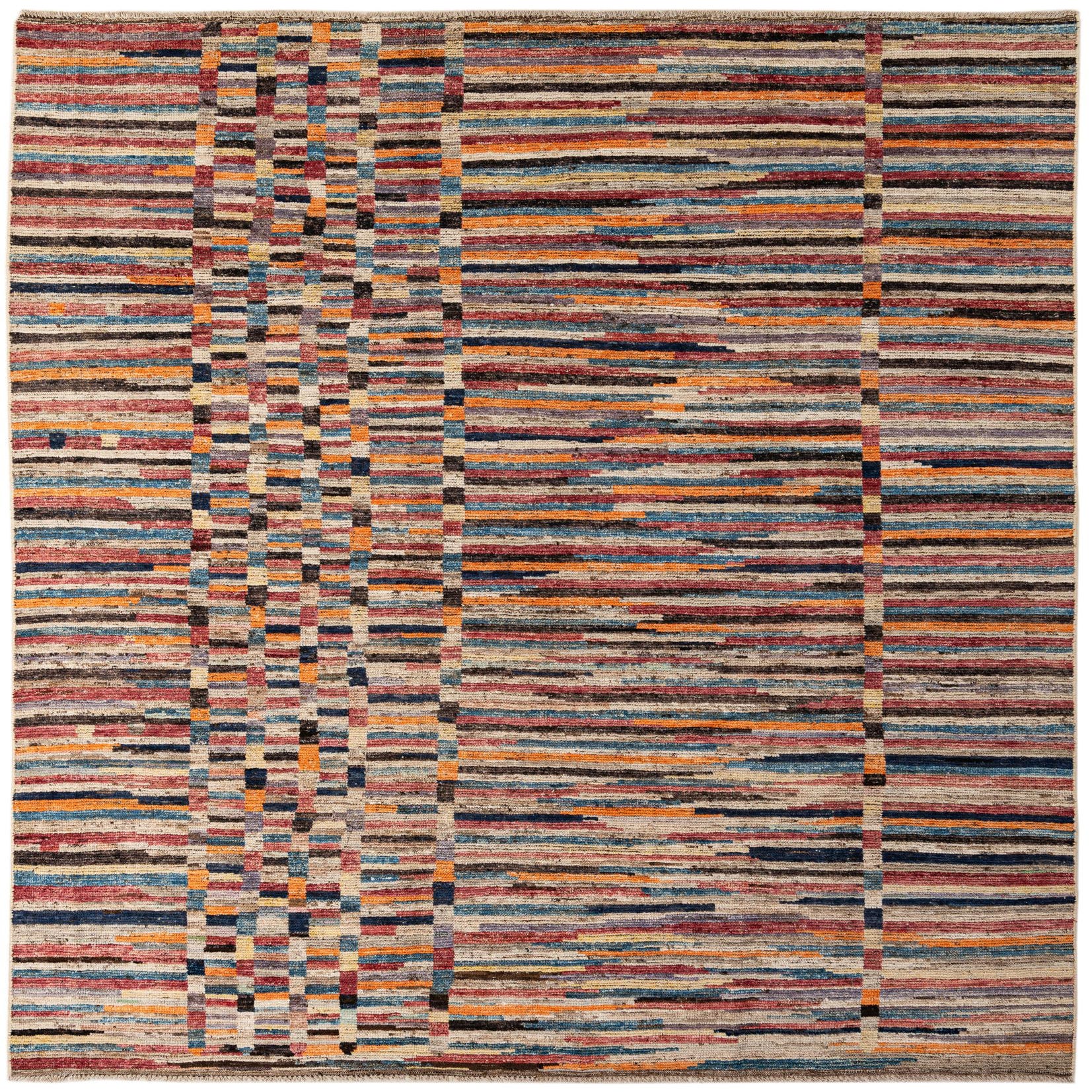 A rectangular 8x10 Darya rug featuring a modern stripe pattern with various colors like red, blue, orange, and beige.