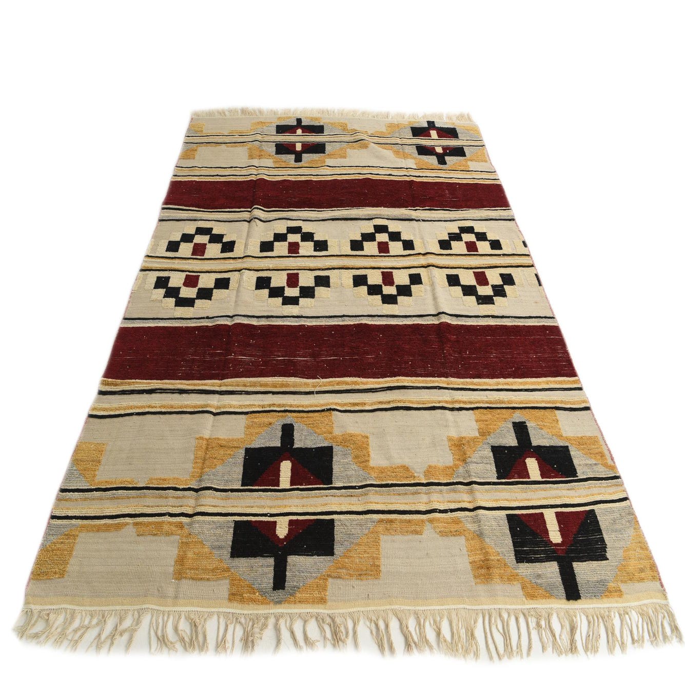 Distinctive characteristics of this rug include the presence of fringe along the shorter ends, adding a decorative touch and textural interest. The natural wool construction provides a soft yet resilient texture, suitable for high-traffic areas while retaining a cozy underfoot feel.