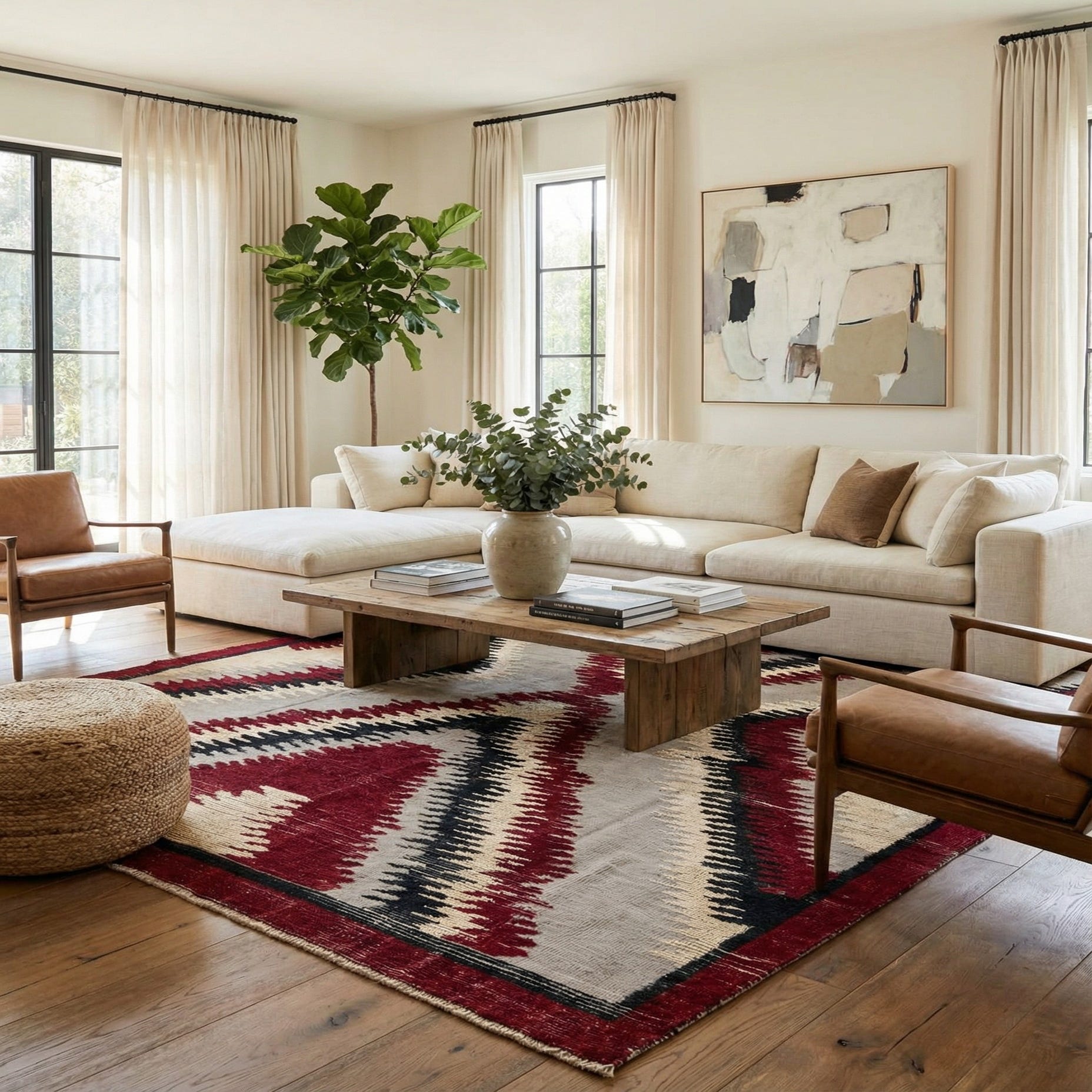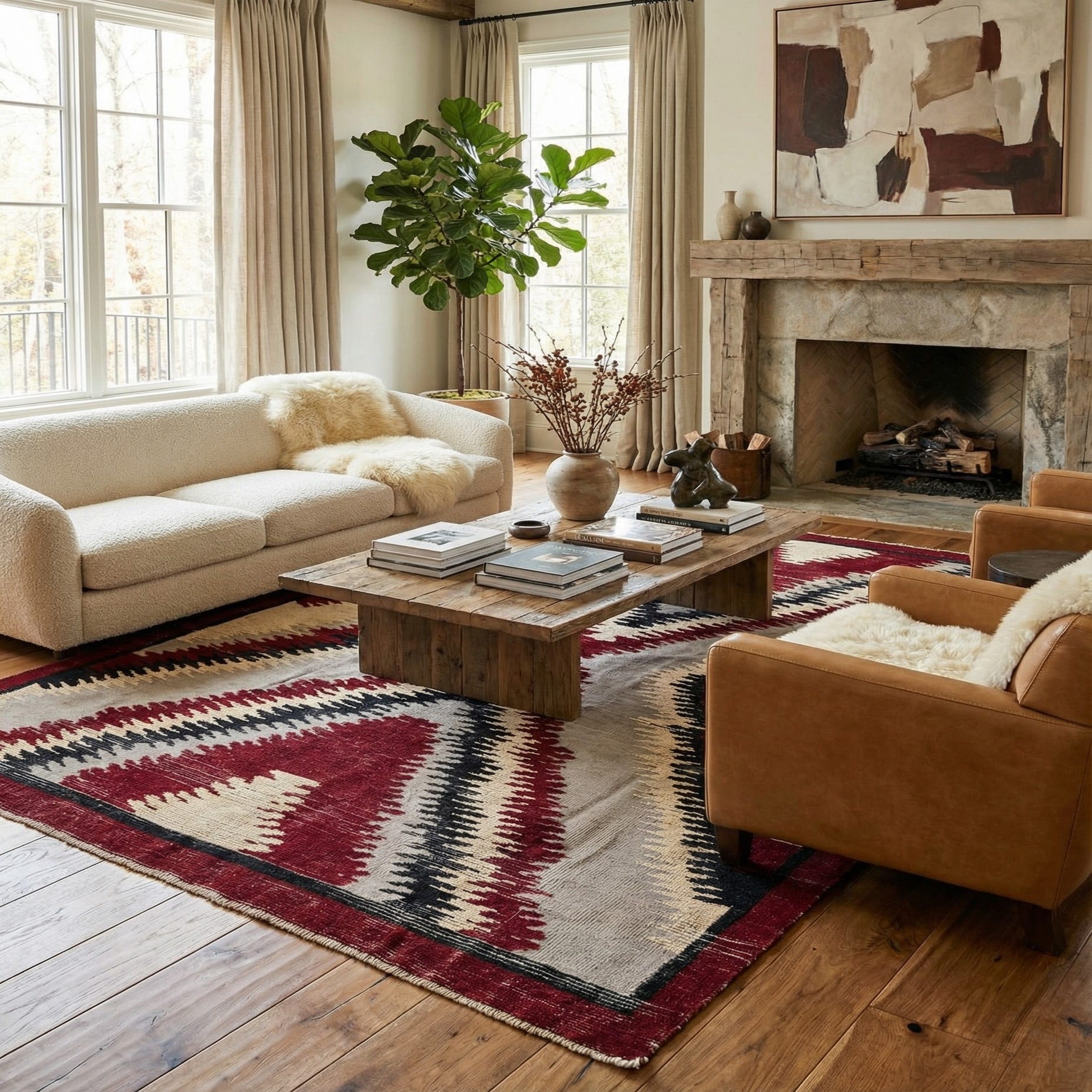 This rug works well as an anchor in a living room beneath a sofa and coffee table, as a defining element in a dining area, or layered in a large entry or open-plan space. It pairs naturally with warm wood flooring, ivory or neutral upholstery, and matte black metal accents for a cohesive, modern-rustic look, and also complements mid-century and eclectic interiors where strong pattern and color are desired.