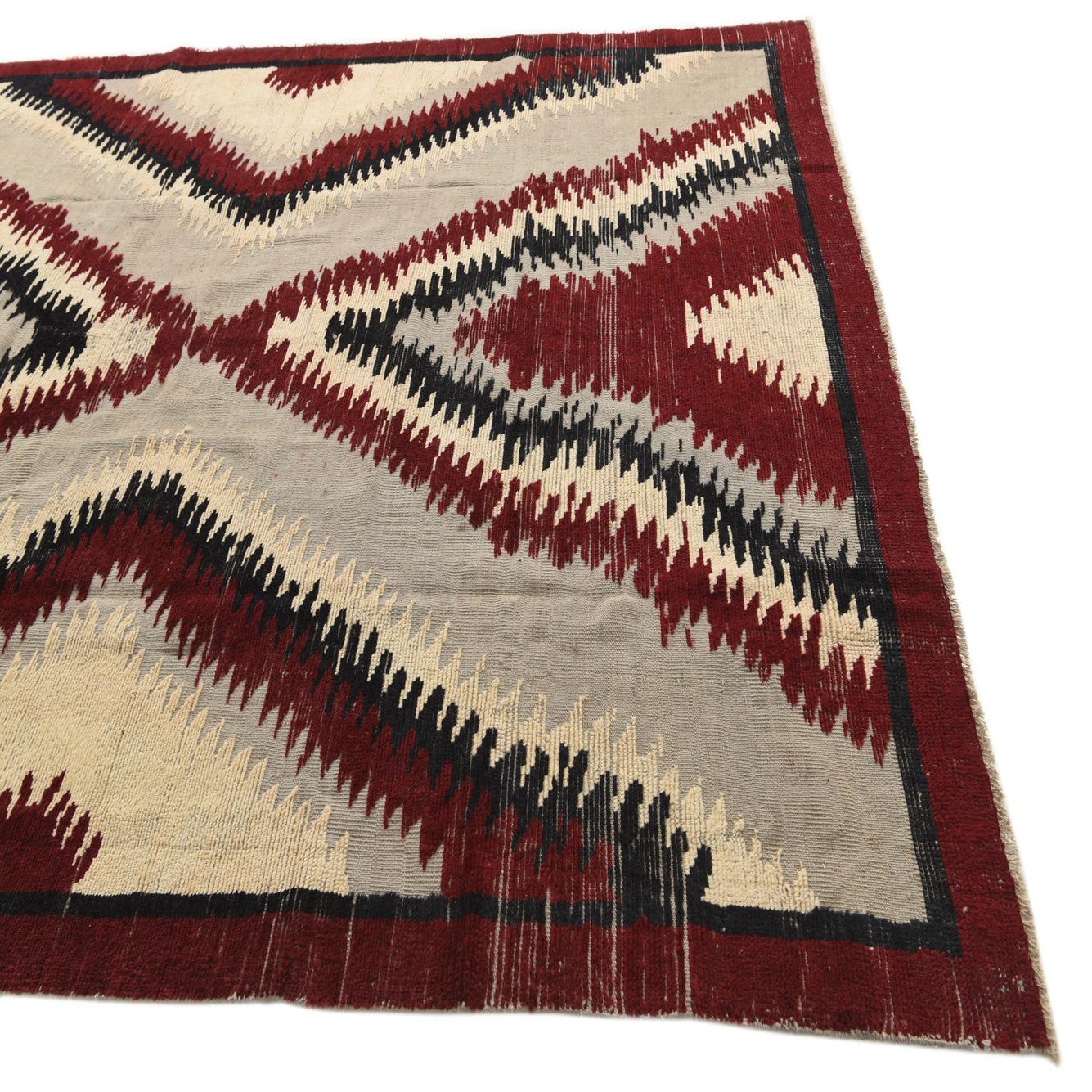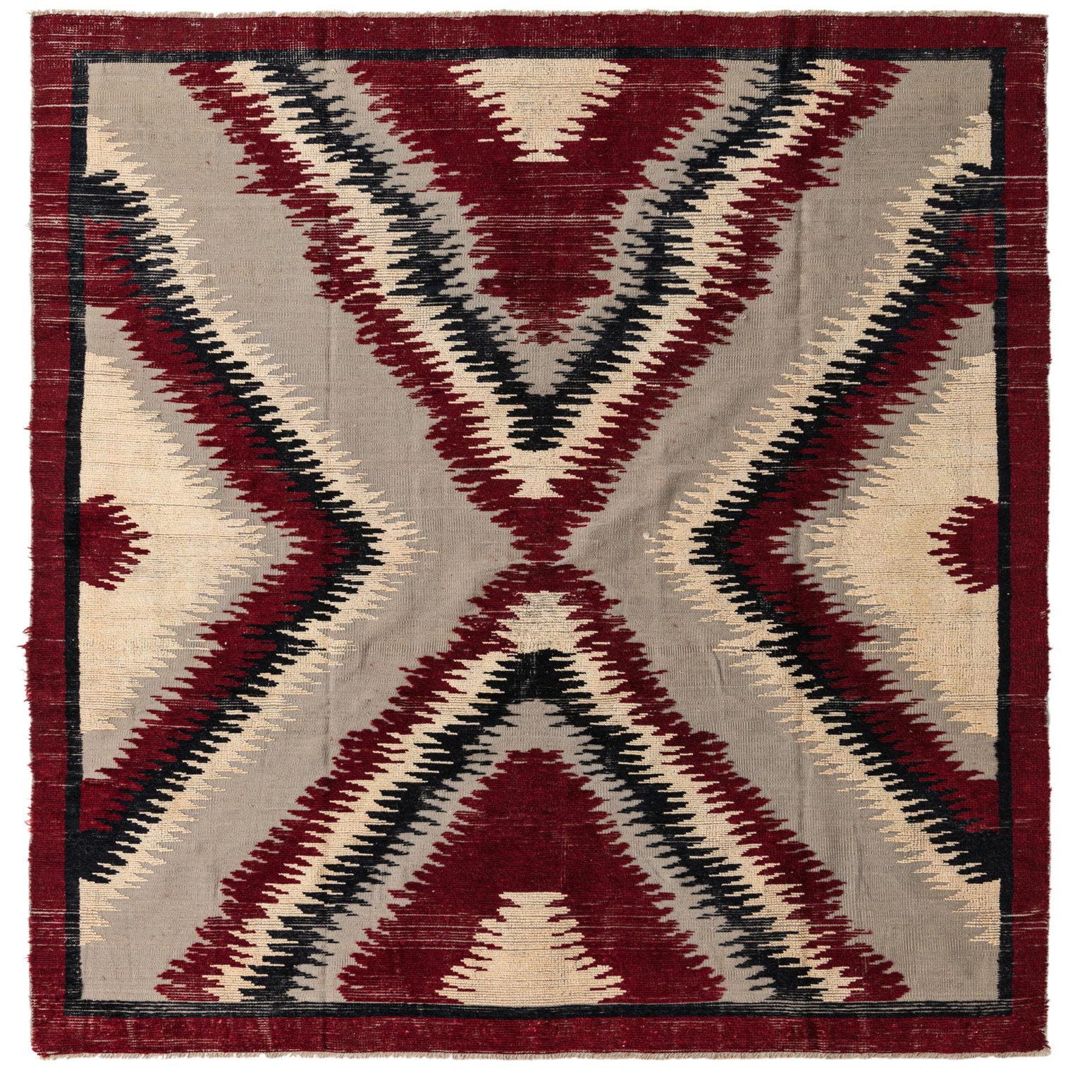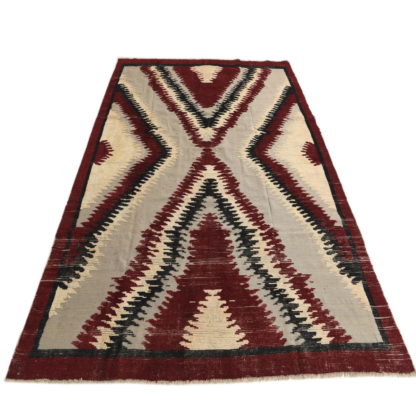 Hand-knotted of 100% wool, this rug features a bold geometric pattern built from stepped chevrons that meet to form a strong X motif across a multi background. Bands of deep red and black are offset by ivory accents, giving the design clear, graphic contrast while the multi-tonal field keeps the overall look grounded. The wool pile has a tactile, slightly textured feel underfoot with a firm hand and visible weaving irregularities that give the piece character and a crafted presence.