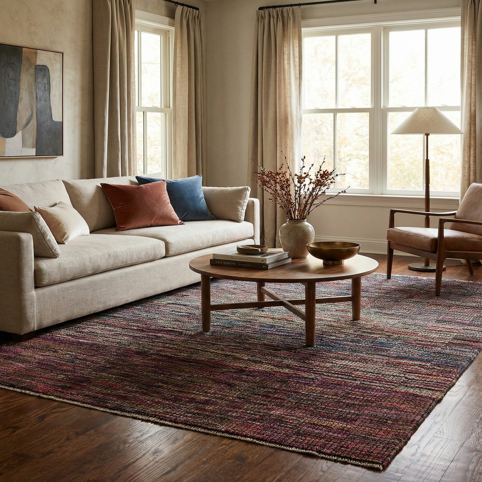 This piece is well-suited for spaces that embrace modern, eclectic, or transitional design. It can serve as a statement piece in a minimalist setting or complement a room with bohemian or global-inspired elements. The rug's generous size and vibrant colors make it an ideal choice for anchoring furniture in a living room, creating a focal point in a dining area, or adding warmth and visual interest to a spacious bedroom.
