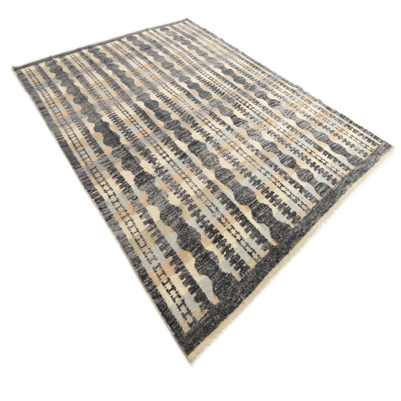 This Darya collection rug, sized 8x10, is a hand-knotted piece crafted from 100% wool, offering both durability and tactile appeal. The rug displays a dynamic striped pattern, providing a sense of movement within the design. Colors include a nuanced multi-hued background, accentuated by stripes in beige, black, brown, and gray, allowing for a versatile color palette that can integrate into various decor styles.
