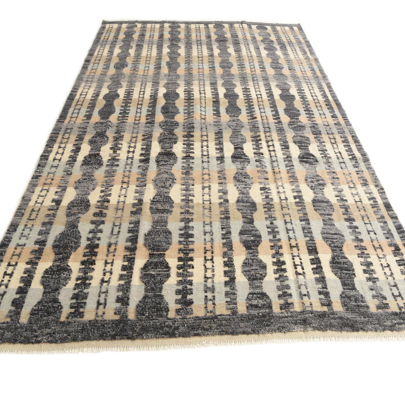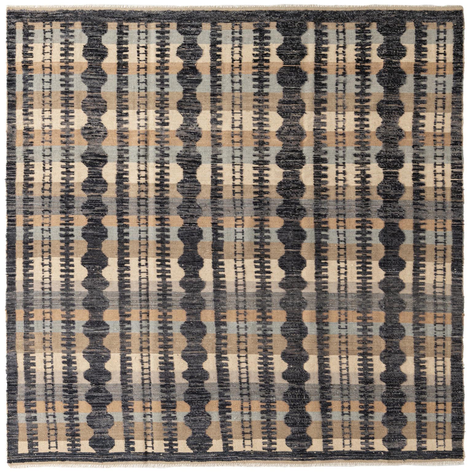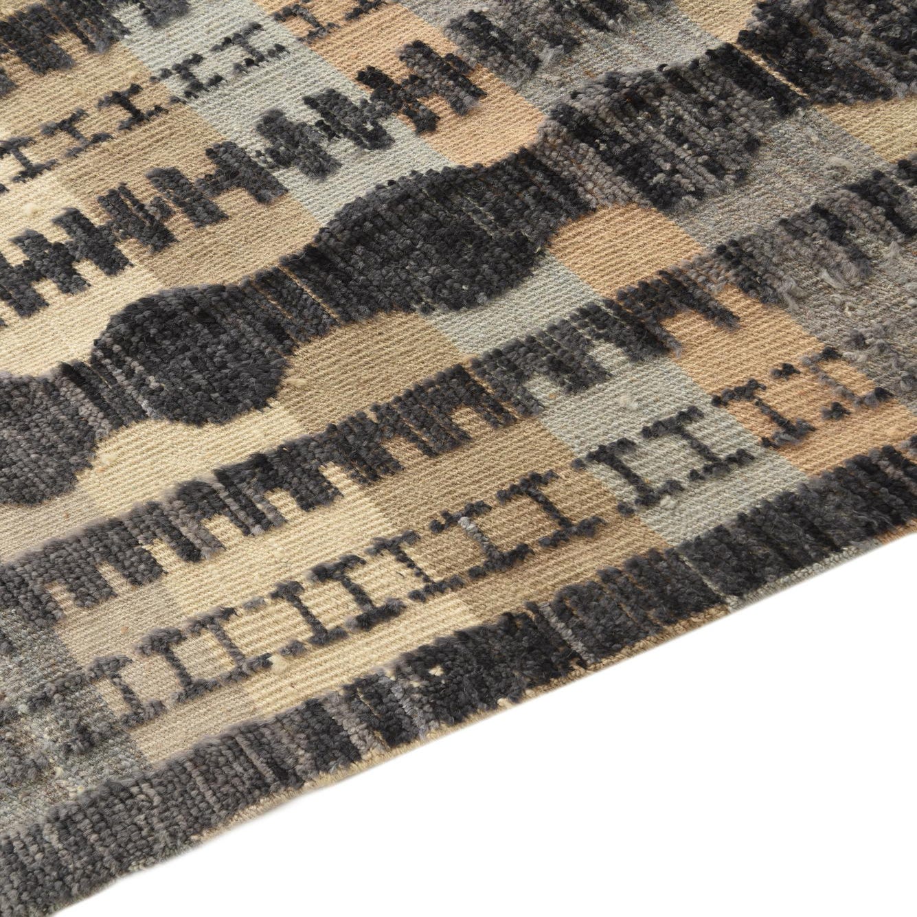 Ideal for a range of interior designs, this rug could complement minimalist and modern decor with its clean lines and balanced use of color. It can also serve as a grounding element in more eclectic or bohemian spaces, where its pattern can harmonize with a mix of textures and elements. Additionally, the rug's natural wool construction and earthly tones would be well-suited for rustic or industrial settings, providing a warm foundation to the room's aesthetic.