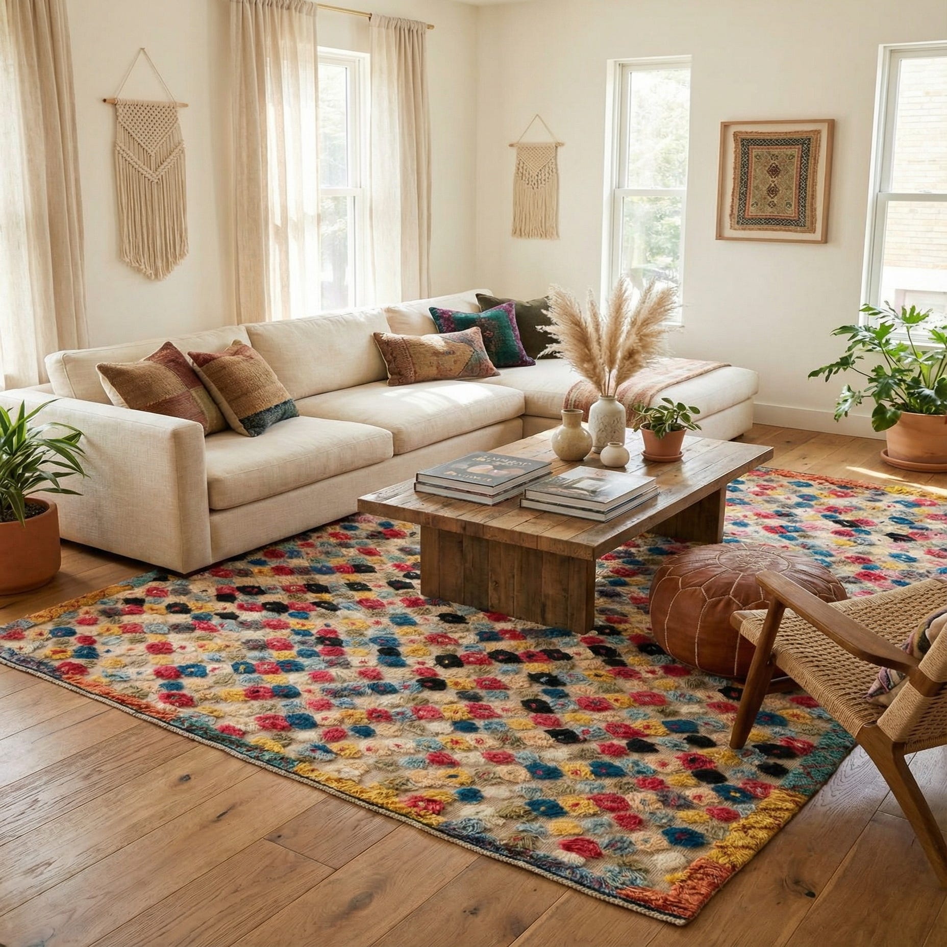 A vibrant 8x10 rectangular Darya rug with a multi-colored abstract pattern of raised wool tufts on a light background, perfect for a living room.