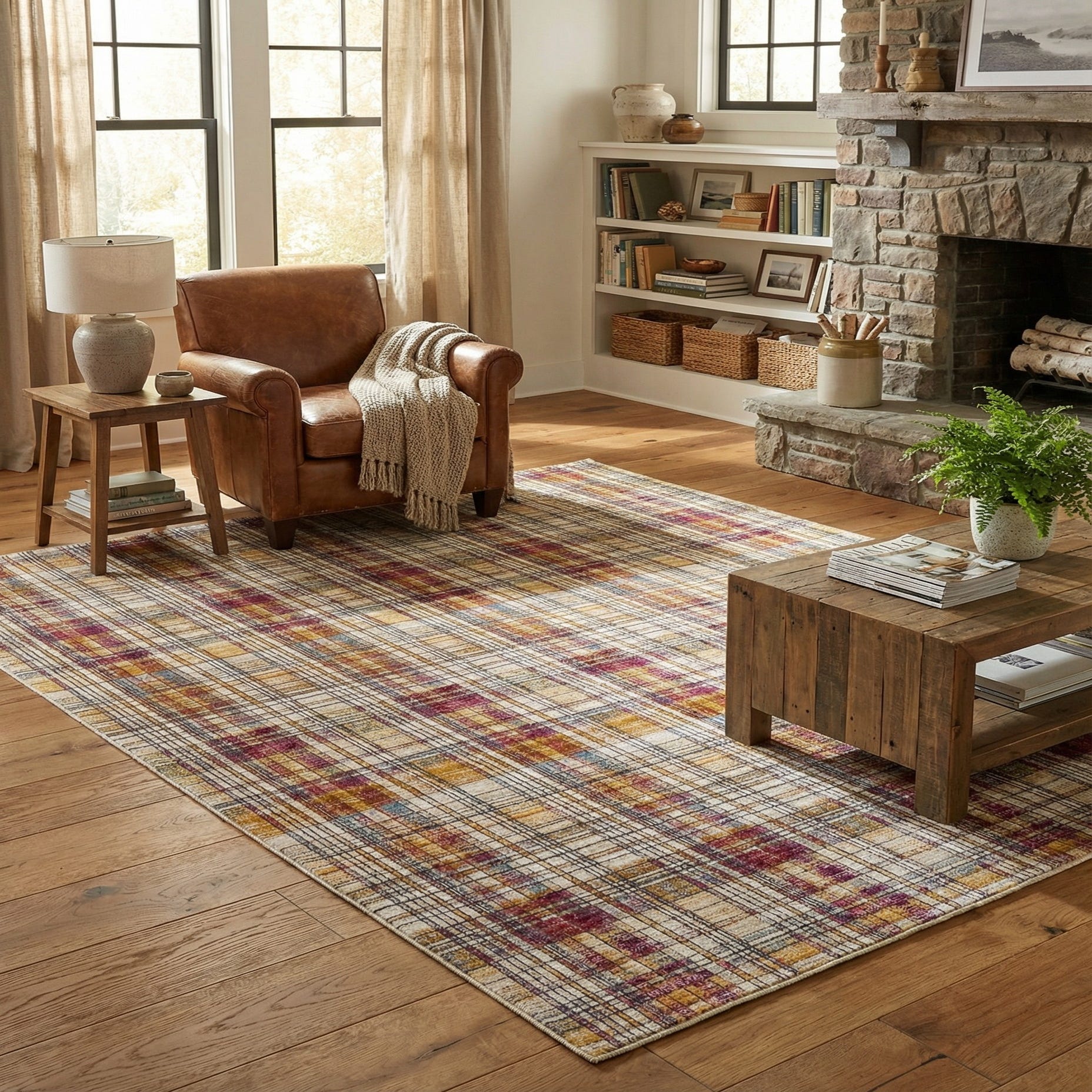 This rug works well as a room-sized anchor in contemporary or transitional living rooms, adding warmth and visual interest beneath a neutral sofa or wood coffee table. It also pairs easily with mid-century modern furnishings or eclectic interiors where layered pattern and color can bring the scheme together, and it can stand up to high-traffic spots like a home office or dining area without adding heavy texture.