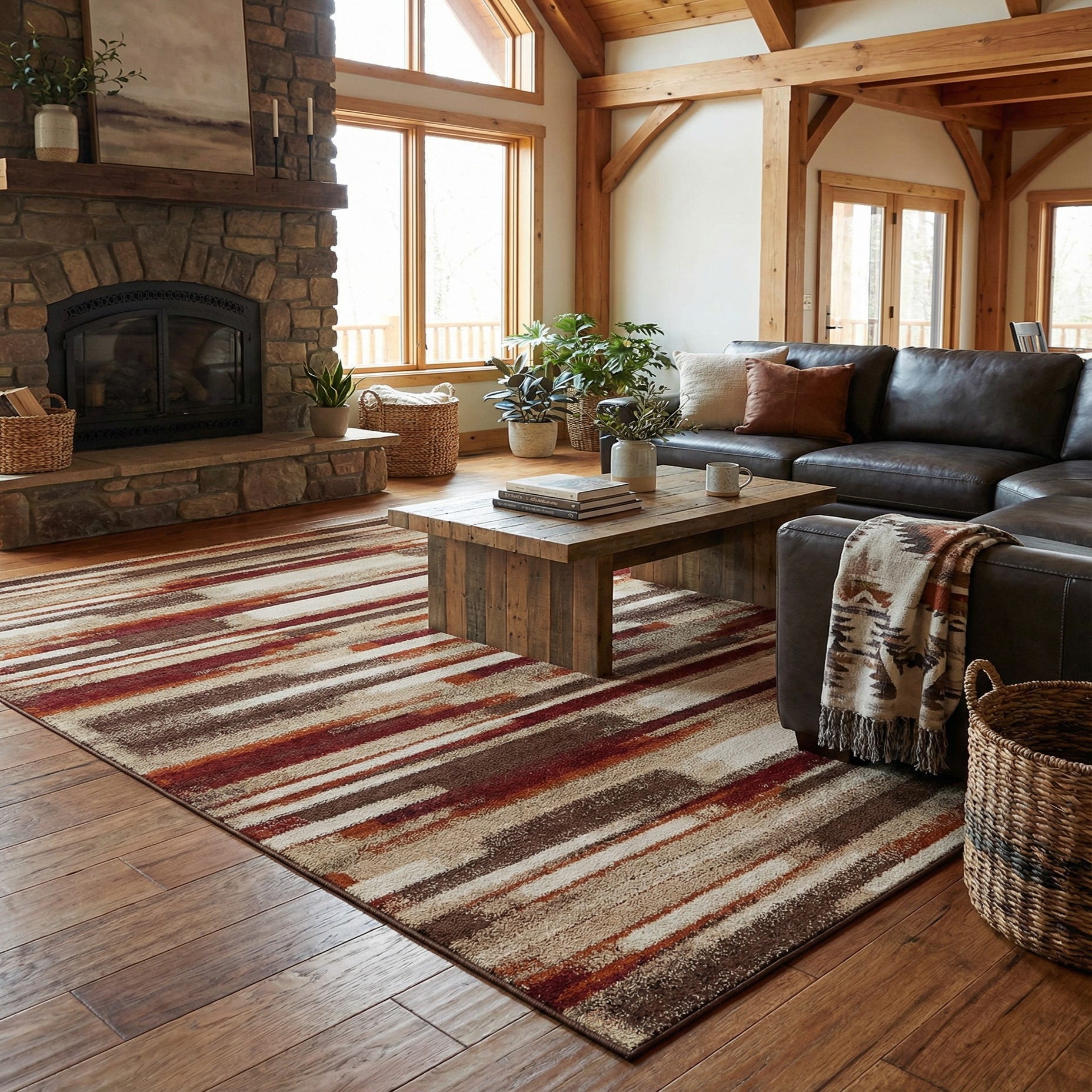A layered, horizontal stripe pattern gives this rug a contemporary, abstract look: irregular, brushstroke-like bands of beige, brown, burgundy and terracotta cross a multi background to create movement and depth. The design balances saturated warm tones with lighter neutral bands, making the overall effect modern with a subtle nod to mid-century and rustic sensibilities.