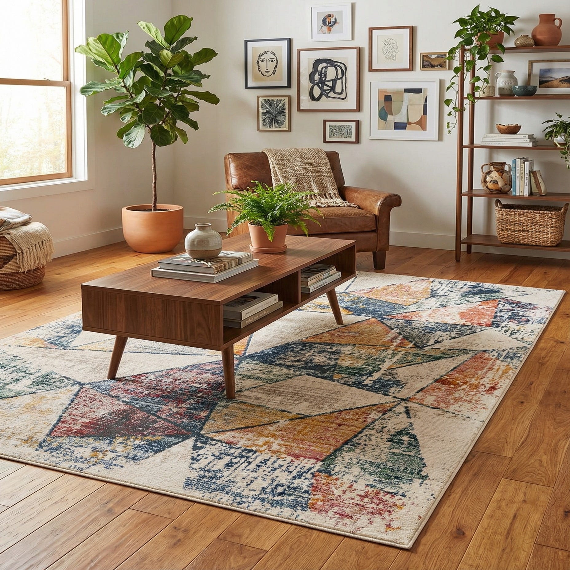 A rectangular 8x10 multi-colored modern abstract rug with a geometric triangle pattern in various distressed hues.